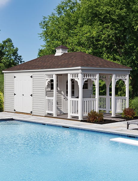 You can customize a poolhouse to match your backyard and your needs. Choose your size, doors, windows, siding, and upgrade options, and our team will help you design the right structure.