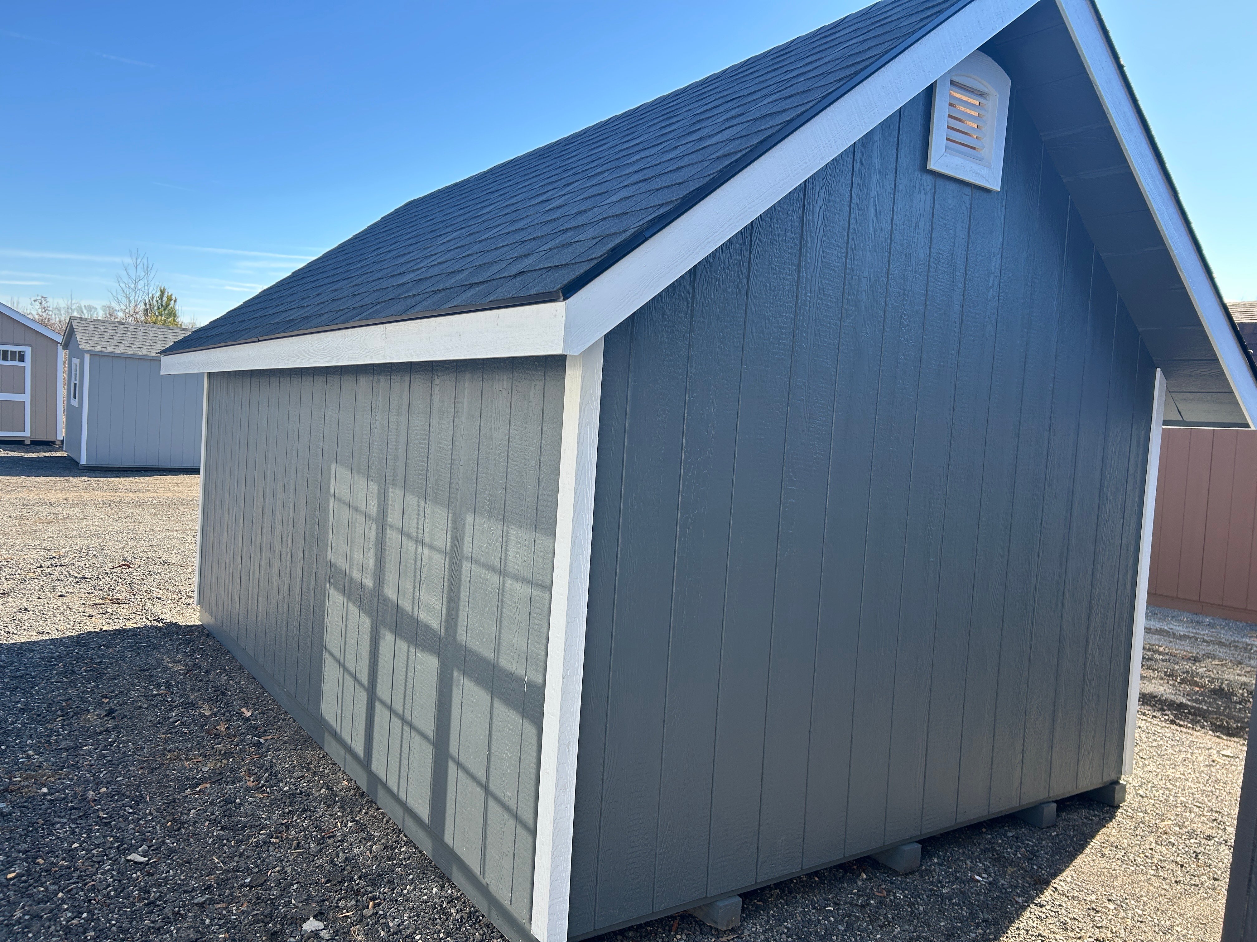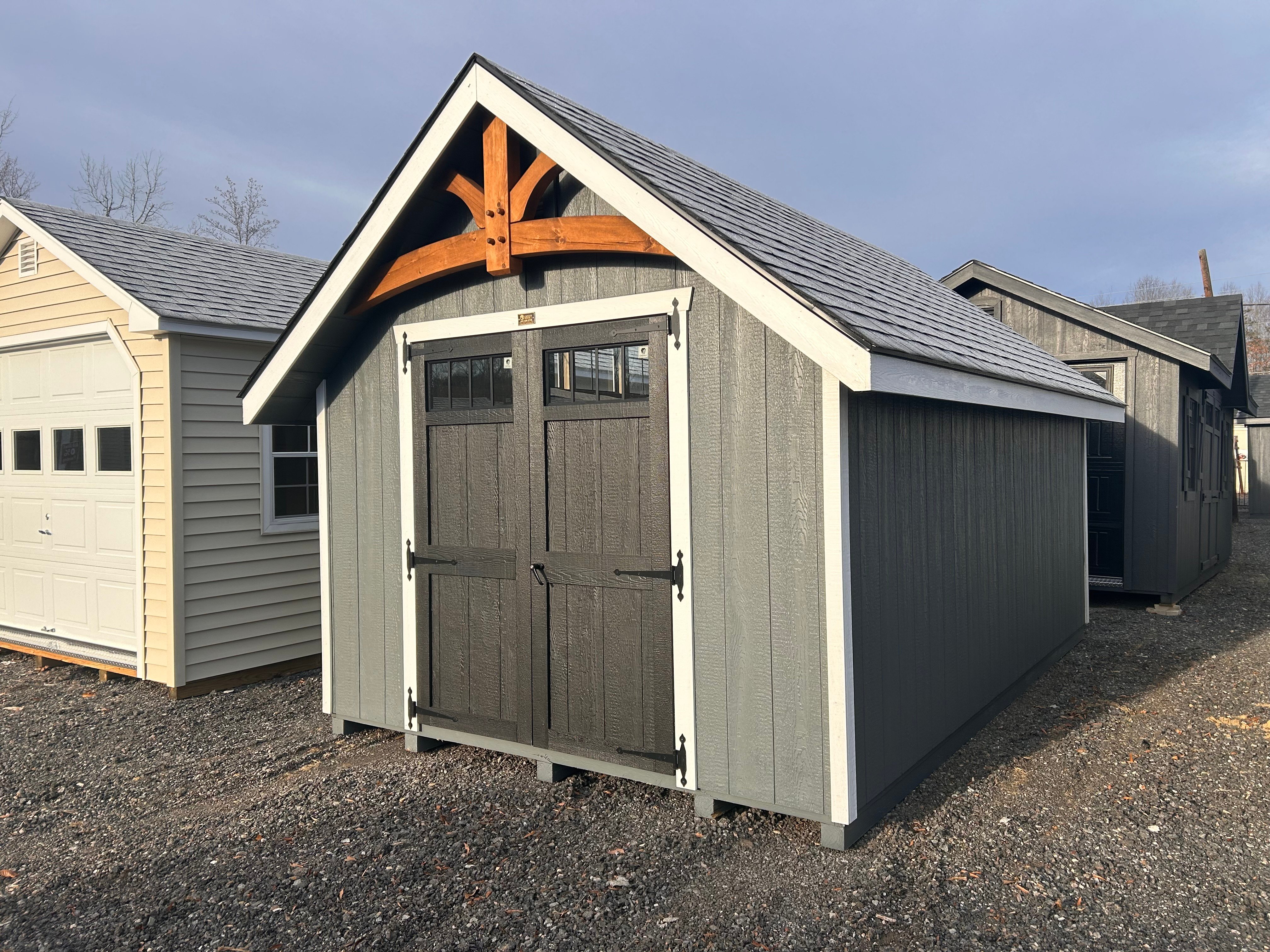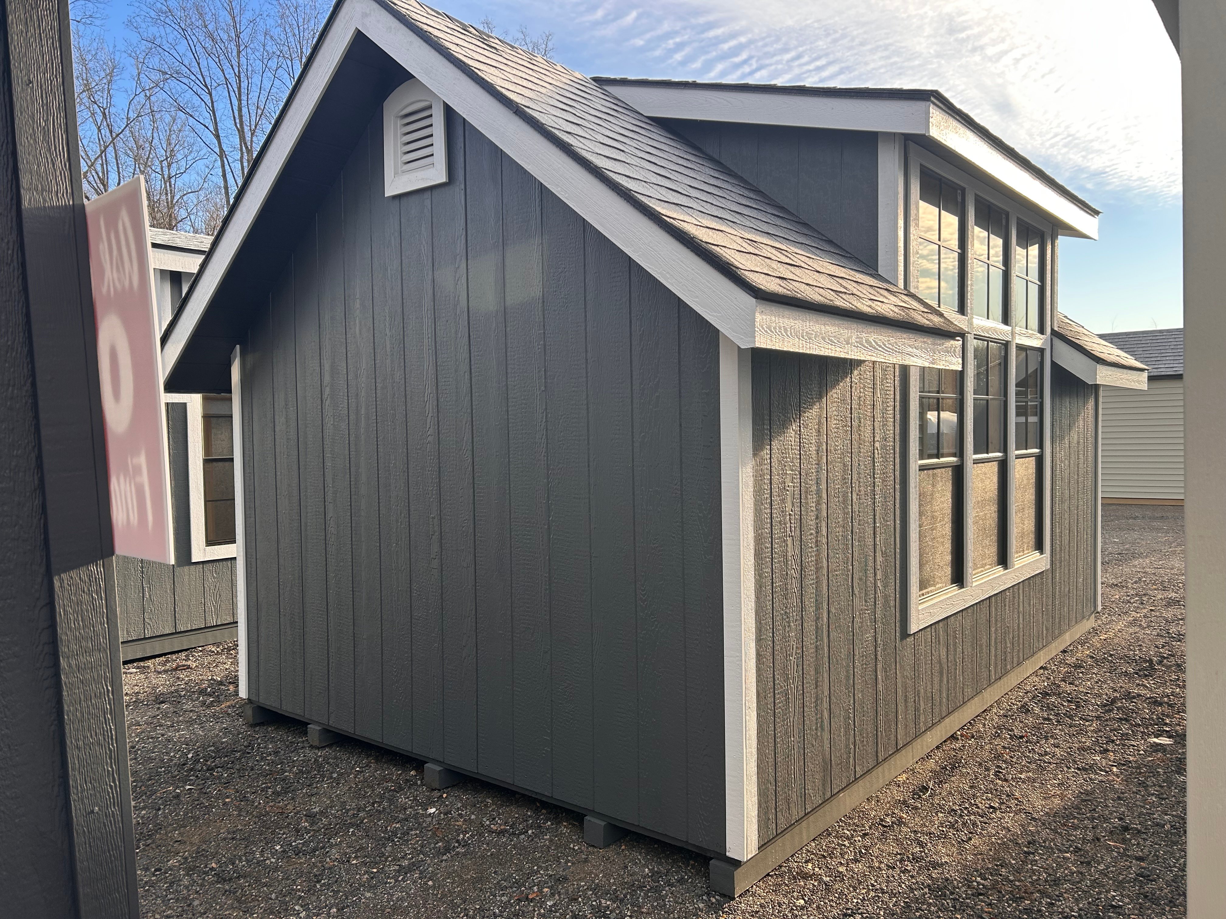 Classic charm meets premium craftsmanship in this 10×16 Victorian A-Frame storage shed. Amish built for lasting quality, it features dark gray LP Smart Panel siding, crisp white trim, and a bold black roof for timeless curb appeal. Black windows and a striking 3-window wall dormer flood the interior with natural light, while the Timber Frame Accent Model E adds architectural character to the gable. Spacious and durable, this shed is perfect for storage, hobbies, or a backyard retreat — built to stand strong and look beautiful for years to come.