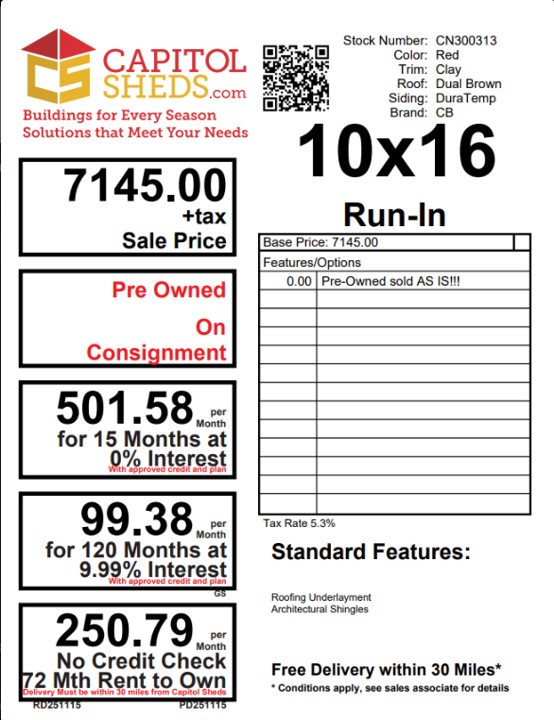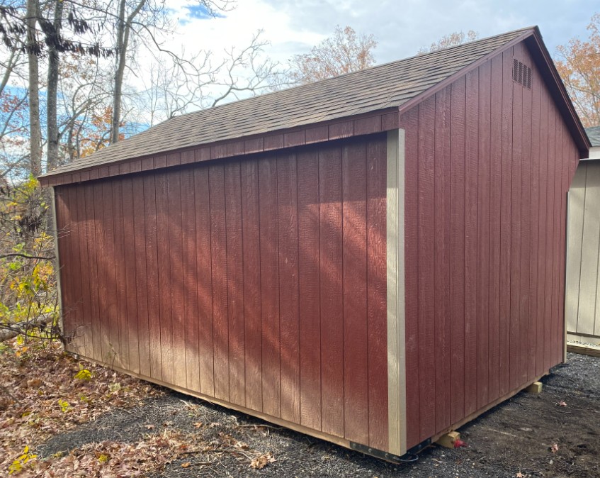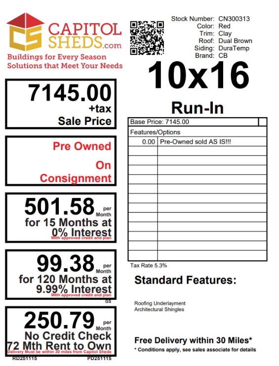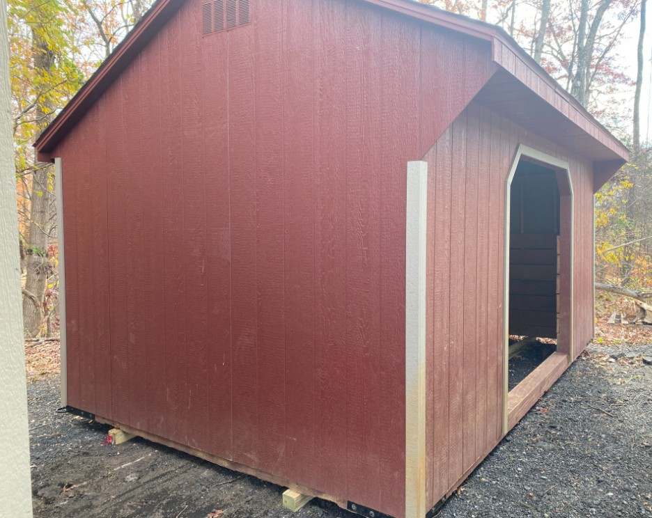 This 10×16 Amish-built Run-In shed is designed for durability and rustic charm. Constructed with premium pine board-and-batten siding finished in a Barn Red stain and accented with Clay trim, it blends beautifully into any outdoor setting. The roof, in Dual Brown architectural shingles with felt underlayment, provides lasting protection against the elements. Ideal for animal shelter or equipment storage, this shed combines practical design with timeless craftsmanship. Whether on a farm or in a backyard, it delivers dependable functionality and aesthetic appeal. This run-in is preowned and sold ASIS.
