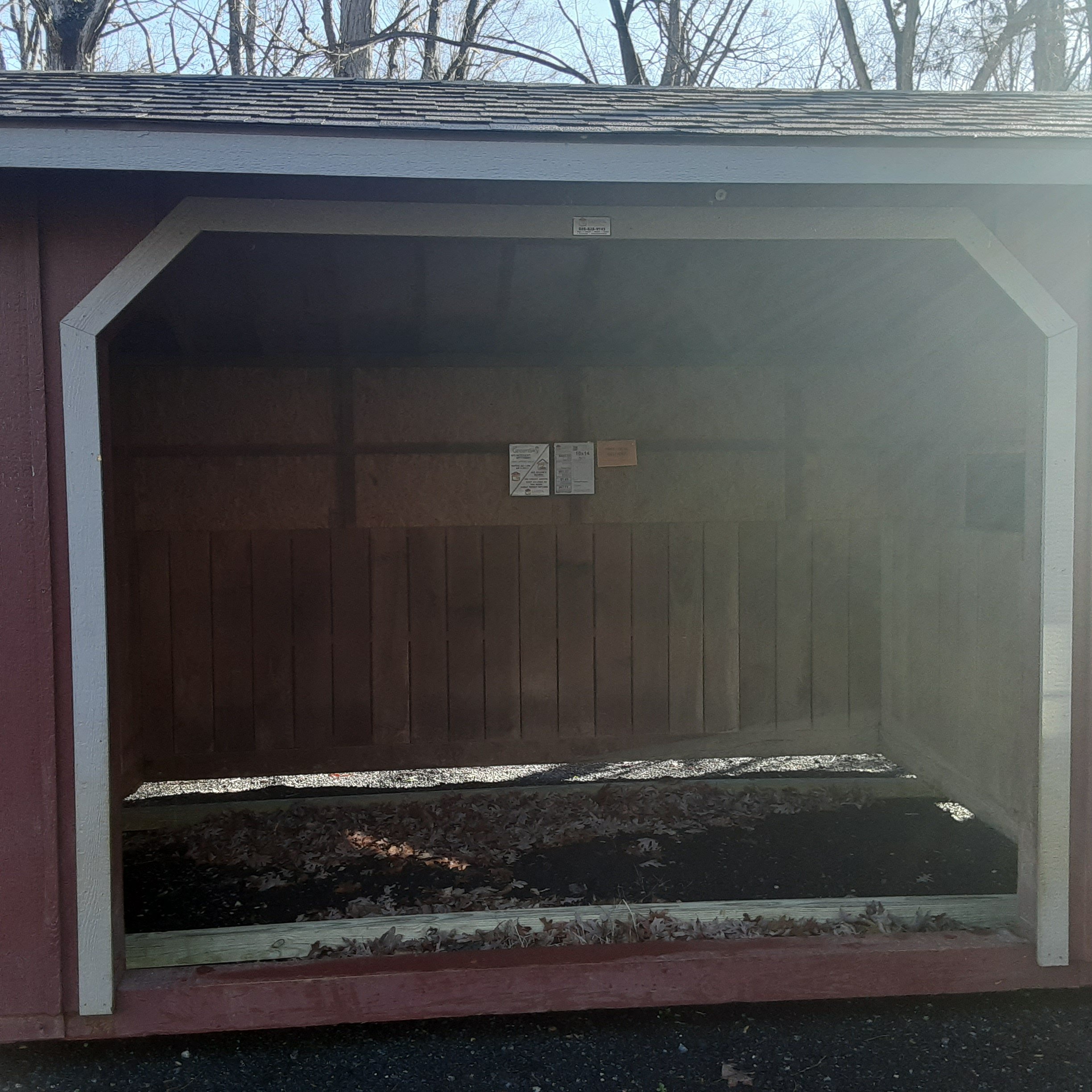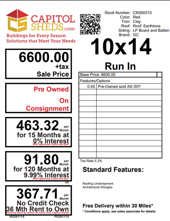 This 10×14 Amish-built Run-In shed is designed for durability and rustic charm. Constructed with premium pine board-and-batten siding finished in a Barn Red stain and accented with Clay trim, it blends beautifully into any outdoor setting. The roof, in Earthtone architectural shingles with felt underlayment, provides lasting protection against the elements. Ideal for animal shelter or equipment storage, this shed combines practical design with timeless craftsmanship. Whether on a farm or in a backyard, it delivers dependable functionality and aesthetic appeal. This run-in is preowned and sold asis.