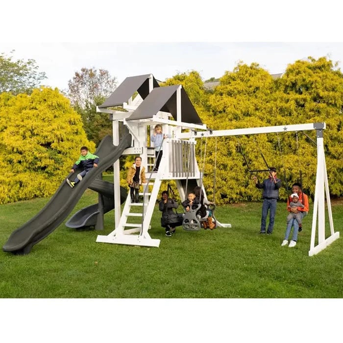 Introducing “Moon Walk,” a stellar adventure hub! Crafted from vinyl wrapped Pressure Treated Southern Pine, this 19′ x 22′ playset promises excitement. Scale the 5′ Rockwall or ascend the 5′ Entrance Ladder to reach the 3×5 A-Frame Tower, boasting a 7′ Deck. Glide down the thrilling 104′ Avalanche Slide or twist through the 7′ Spiral Slide. Swing into joy on the 3 Swing beam with Belt Swing, Trapeze, and Safe-T-Glider. With dual 3×9 Canopy Roofs offering shade, plus a Tire Swing for added fun, “Moon Walk” ensures endless playtime delight!