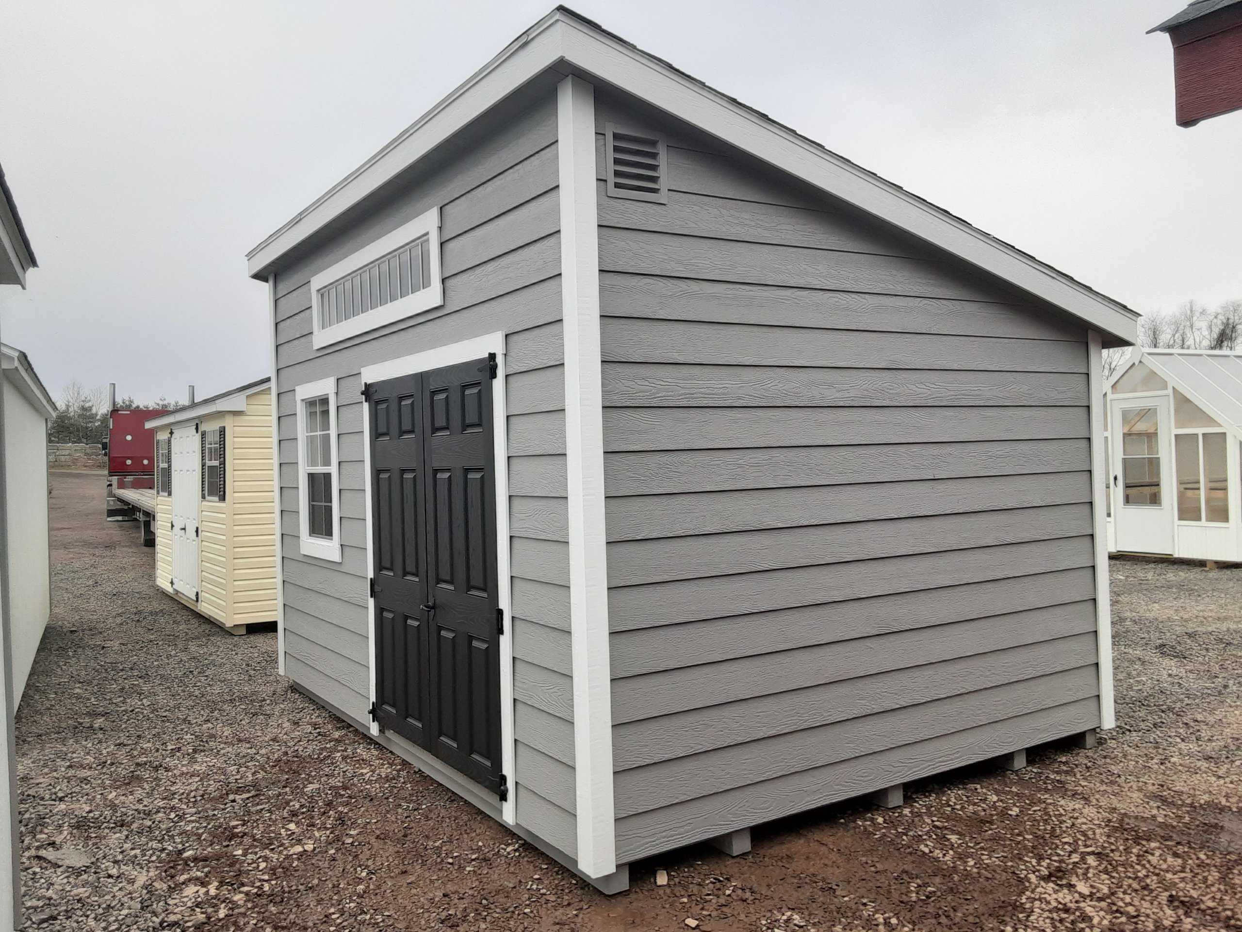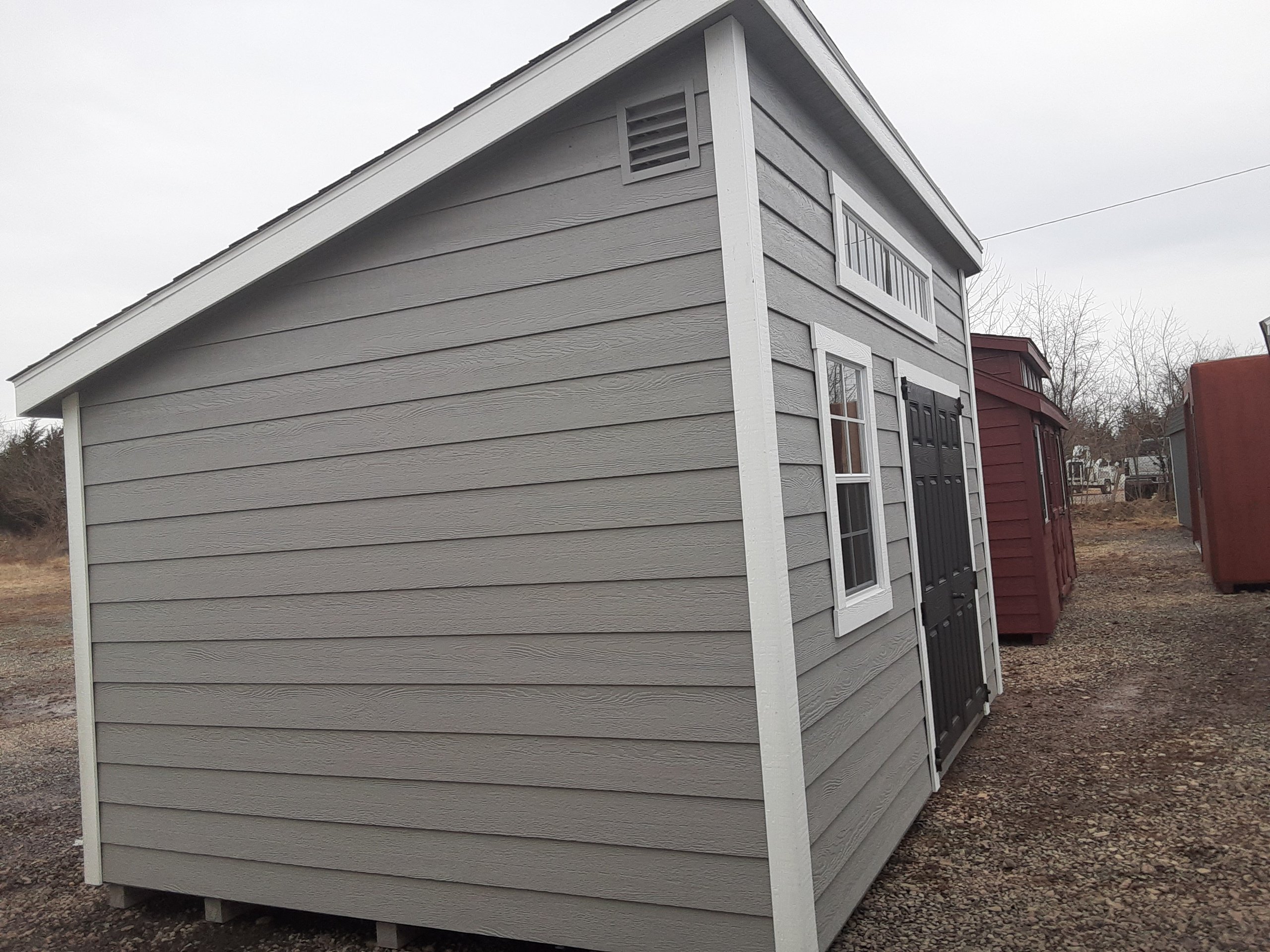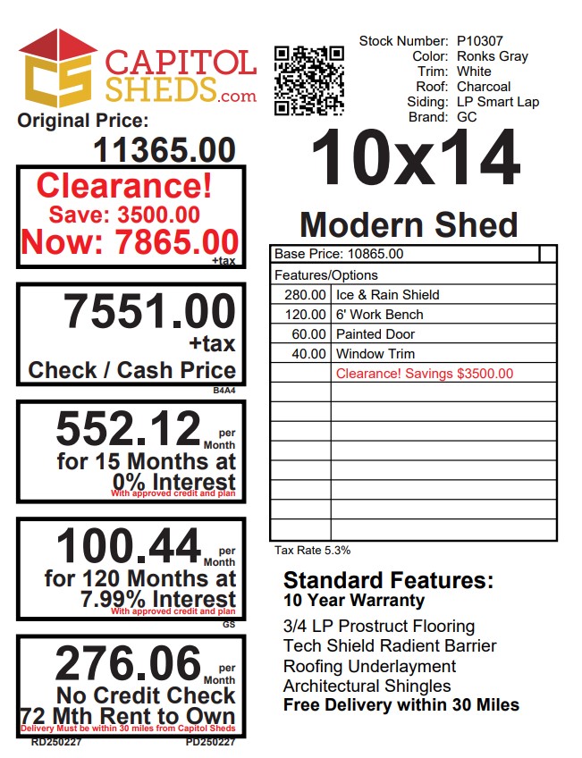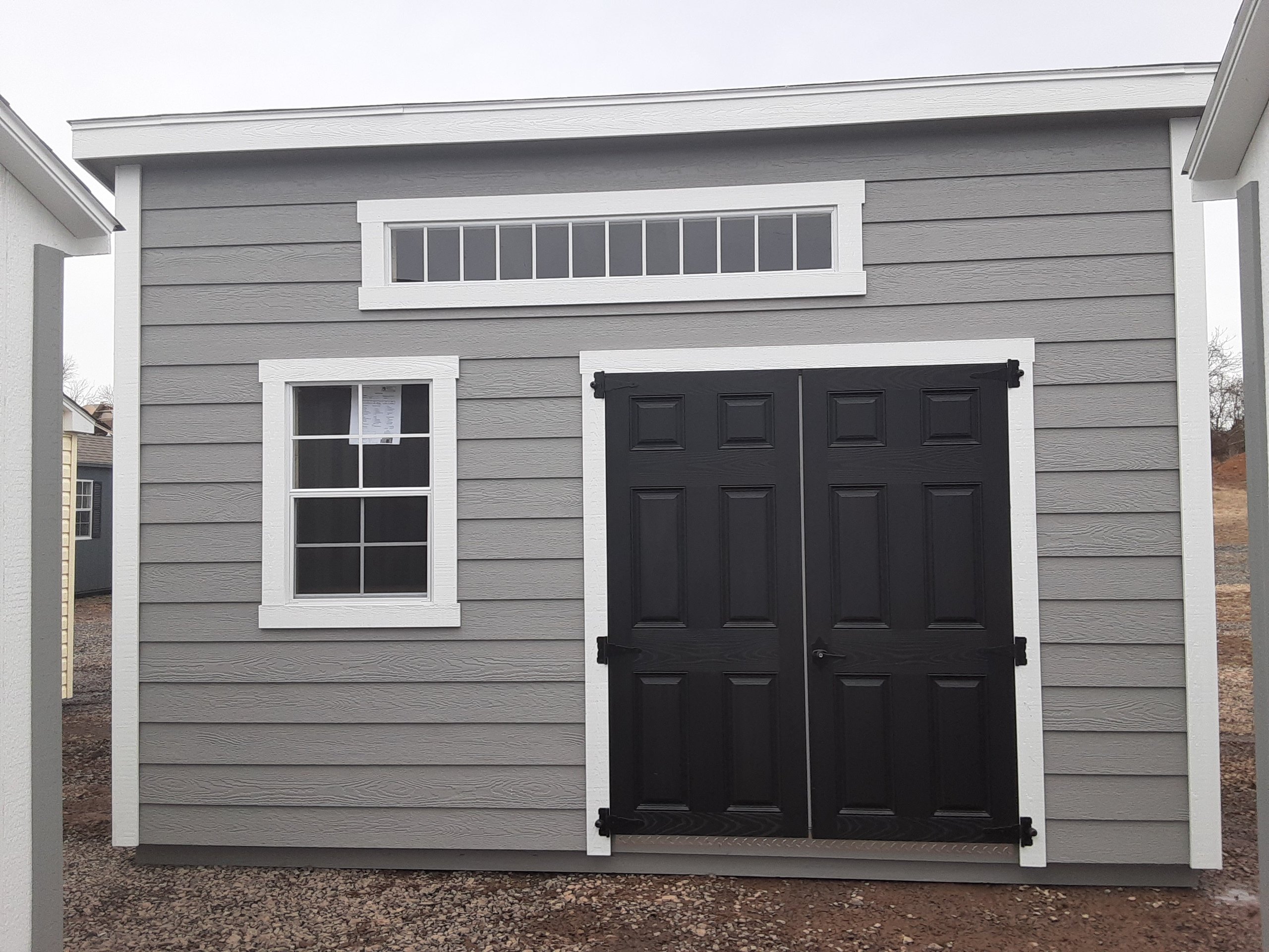 Introducing the Modern Lean To Storage Shed, meticulously crafted by Amish artisans. This 10×14 shed features durable LP Lap siding in a timeless Ronks Gray hue, accented by crisp White trim. The Charcoal-colored roof with shingles adds a touch of elegance. Six foot Workbench for added storage space. With one window and a double door, accessing your belongings is a breeze. The solid construction includes 2×4 studs for the walls and 2×4 rafters for the roof, ensuring durability. Elevate your storage solution with the Amish-built Modern Lean To Storage Shed today.