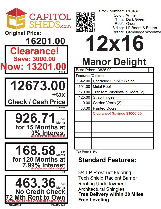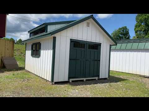 Charming and robust, our 12×16 Amish Manor Delight storage shed is a perfect blend of style and function. The white LP Board & Batten siding contrasts beautifully with the dark green trim and green metal roof, delivering a pleasing aesthetic. Two transom windows usher in natural light, while the strap hinges and garden vents add a touch of classic elegance. The metal roof upgrade offers increased durability. Crafted with 2×4 studs, rafters, and pressure-treated joists, all 16 inches on center, ensures a sturdy build. LP Tech Shield roofing and LP Prostruct flooring provide additional strength and longevity.