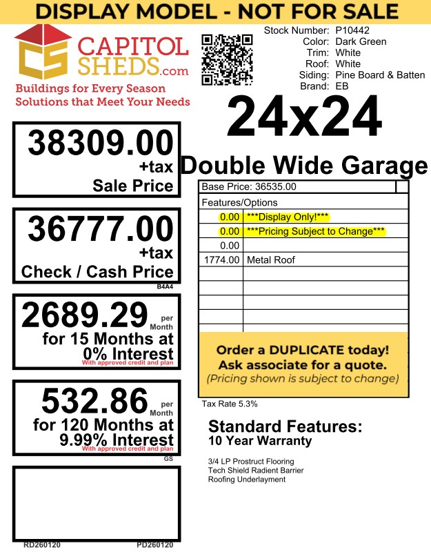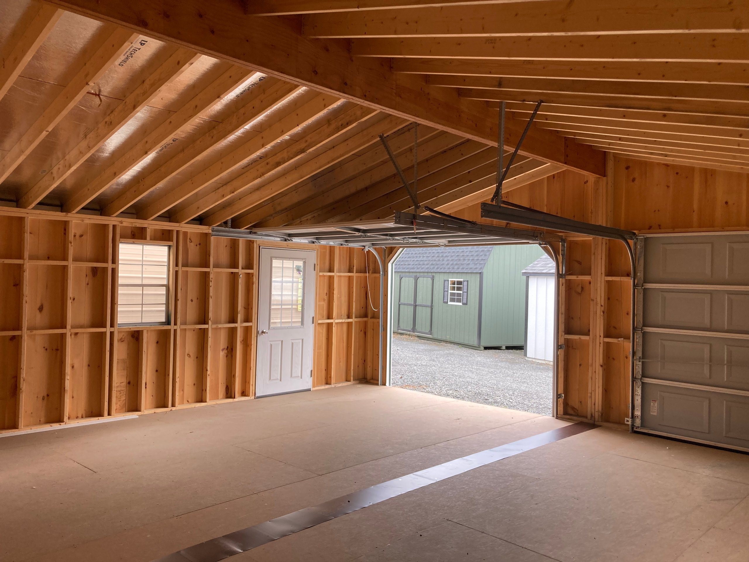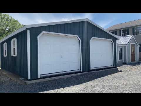 Introducing the Amish A-Frame Double Garage, a spacious 24×24 structure designed for both functionality and style. Its LP Smart Panel siding in a rich dark green hue, accented by crisp white trim, exudes classic charm. The contrasting white metal roof adds a touch of elegance while providing excellent durability.