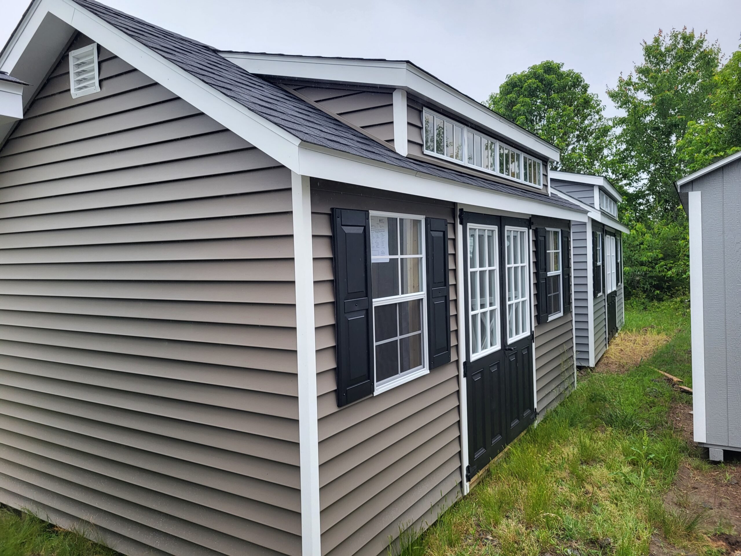 Introducing the A-Frame 10×16 Amish Built Storage Shed, a stunning combination of durability and elegance. With traditional vinyl siding in Whispering Timber and white trim, this shed exudes timeless charm. The 2×4 wall and roof framing ensure strength, while the LP Tech Shield roof sheeting provides protection. Six windows and 9-Lite doors offer ample natural light and easy access. Upgrades include Premium Vinyl, black painted doors, Butt Hinges, an 8/12 roof pitch, a 10′ row dormer with 4 windows, 24″x36″ window upgrades, and an 8″ overhang. Elevate your outdoor storage with the Kingston, the epitome of craftsmanship and style.