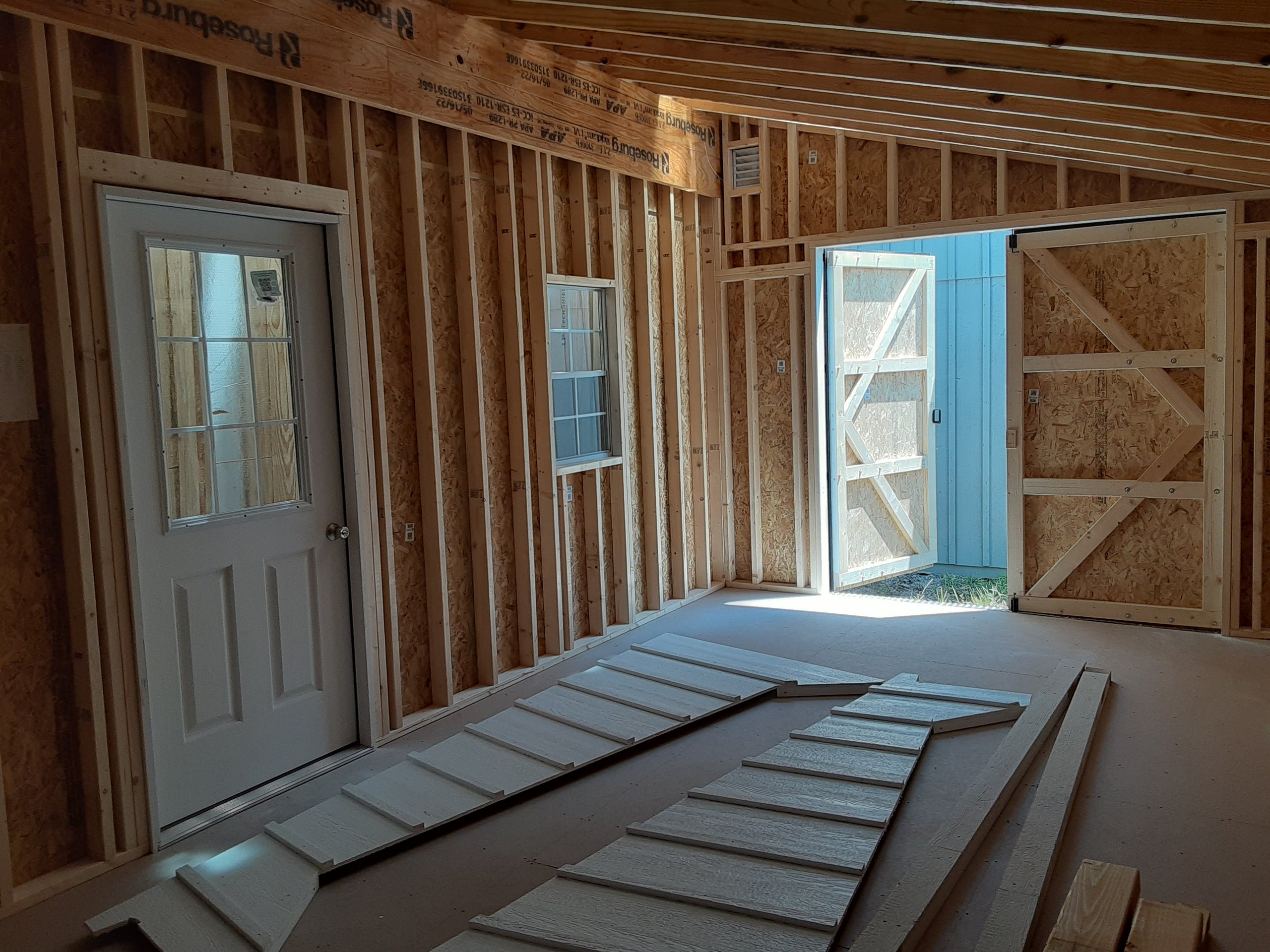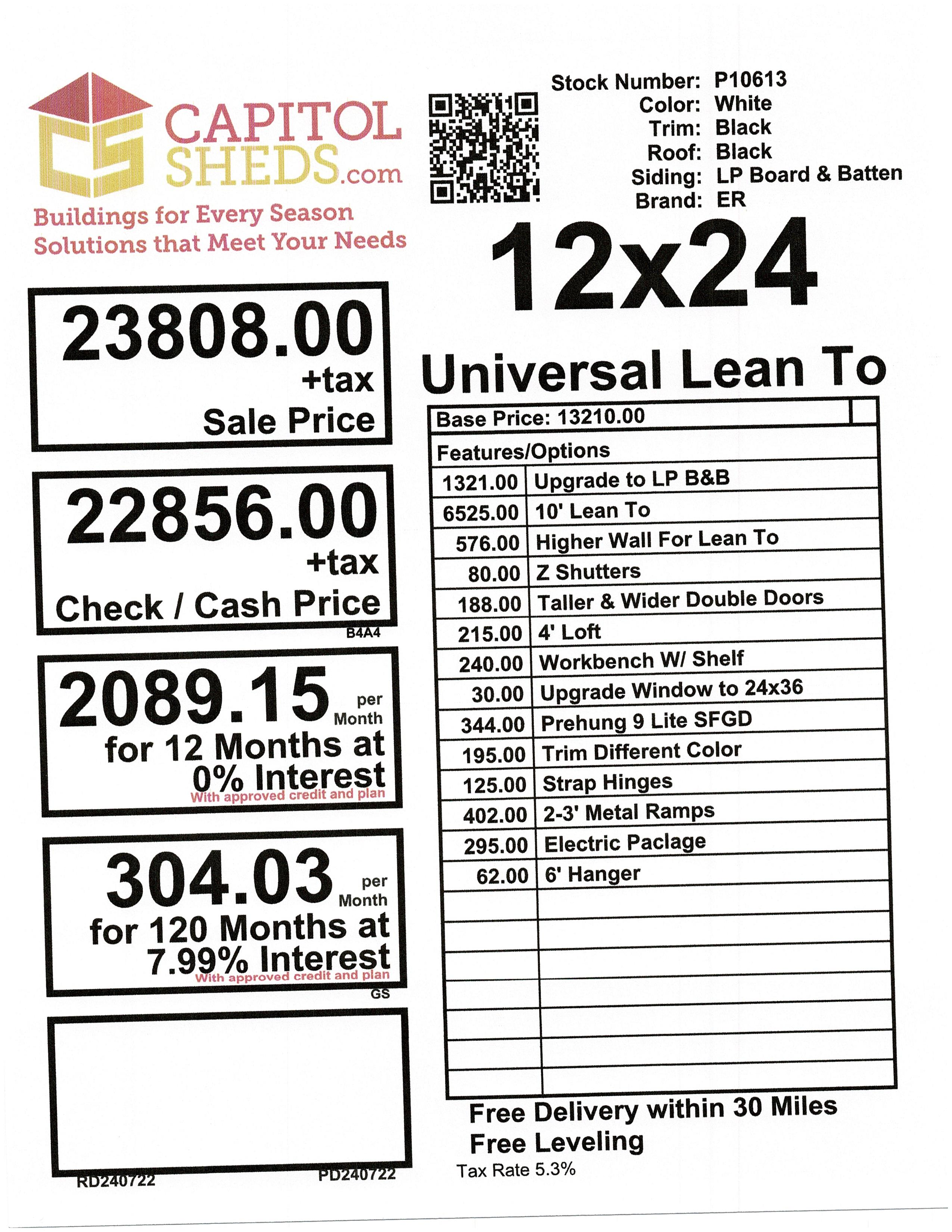 Introducing the Traditional Universal Lean-To -A masterpiece of craftmanship by the Amish artisans. This 12×24 Universal Lean-To is built to endure, offering exceptional quality and functionality for all your storage needs. The Universal Lean-To siding provides superior durability while exuding timeless elegance in White, complemented by pristine Black Trim. The Black colored dimensional Metal roof protect your belongings from the elements ensuring long-lasting reliability. With two doors for easy access, the interior boasts 2×4 stud wall framing, 2×4 rafter roof framing, and LP Tech Shield roof sheeting for added strength. The LP Prostruct Flooring, coupled with pressure-treated 2×4 floor joists ensures stability and longevity. invest in the Quaker Lean-To for a storage solution that’s built to last.