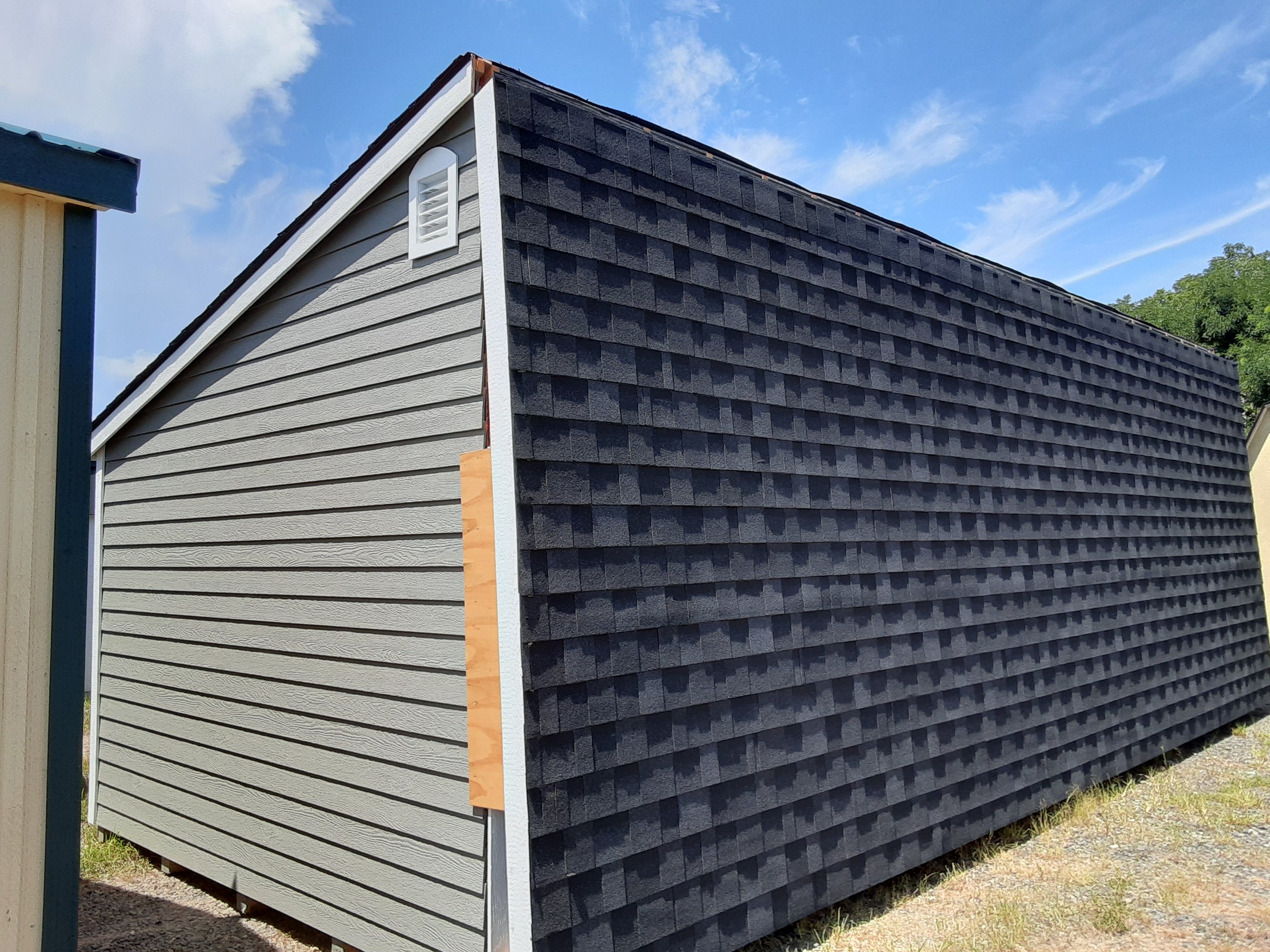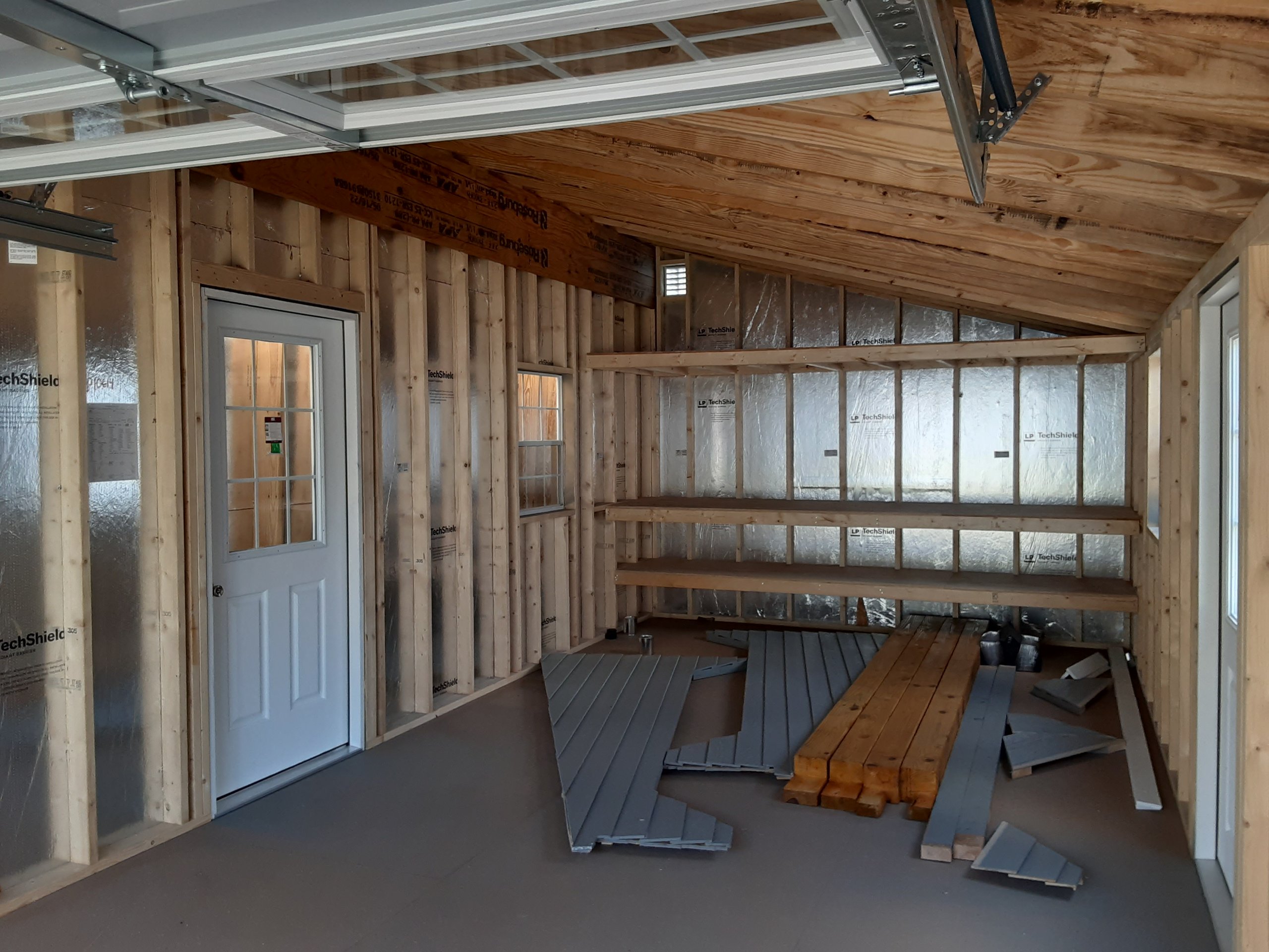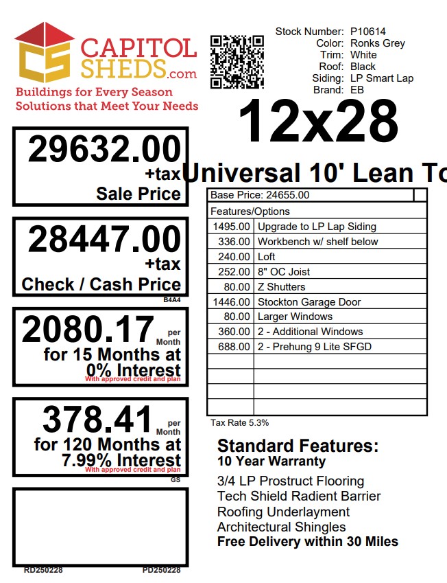 Style Name: Universal Lean To Size: 12×28 Siding: LP Smart Lap Main Color: Ronks Gray Trim Color: White Roof Color: Black Roofing: Architectural Shingles Roofing Underlayment: Tar Paper Number of Windows: 4 Number of Doors: 3 Wall Framing: 2×4 studs 16 inches on center Roof Framing: 2×4 rafters 16 inches on center Roof Sheeting: LP Tech Shield Flooring: LP Prostruct Floor Joists: Pressure Treated 2×4 joists 8 inches on center Included Upgrades: Upgraded LP Smart Lap Upgraded (4) 30×36 Windows 10′ Lean To 8×7 Stockton Garage Door Package (Z) Shutters with Trim (2) 16″ Shelves Workbench with Bottom Shelf (2) Prehung 9 Lite Fiberglass Doors 4′ Loft