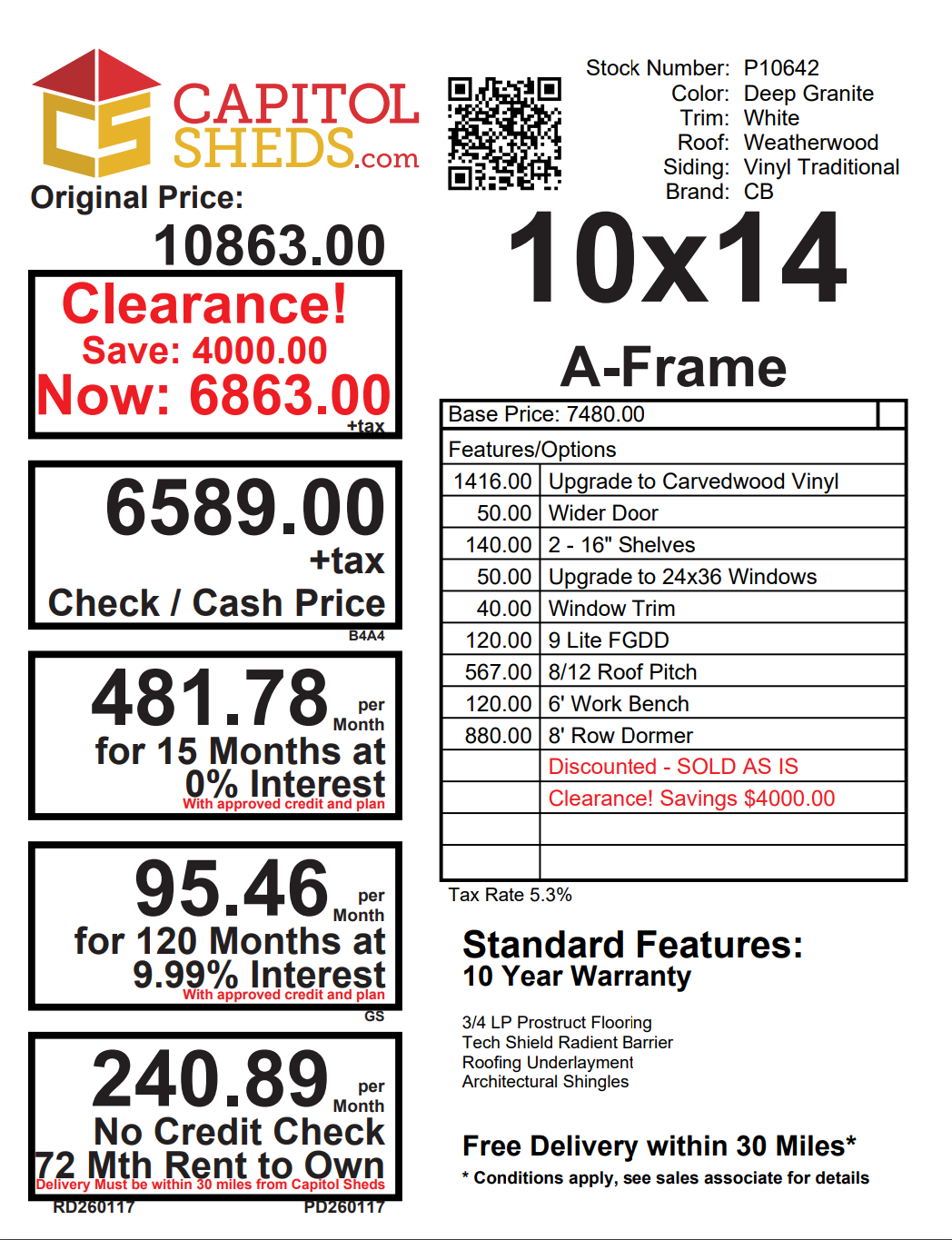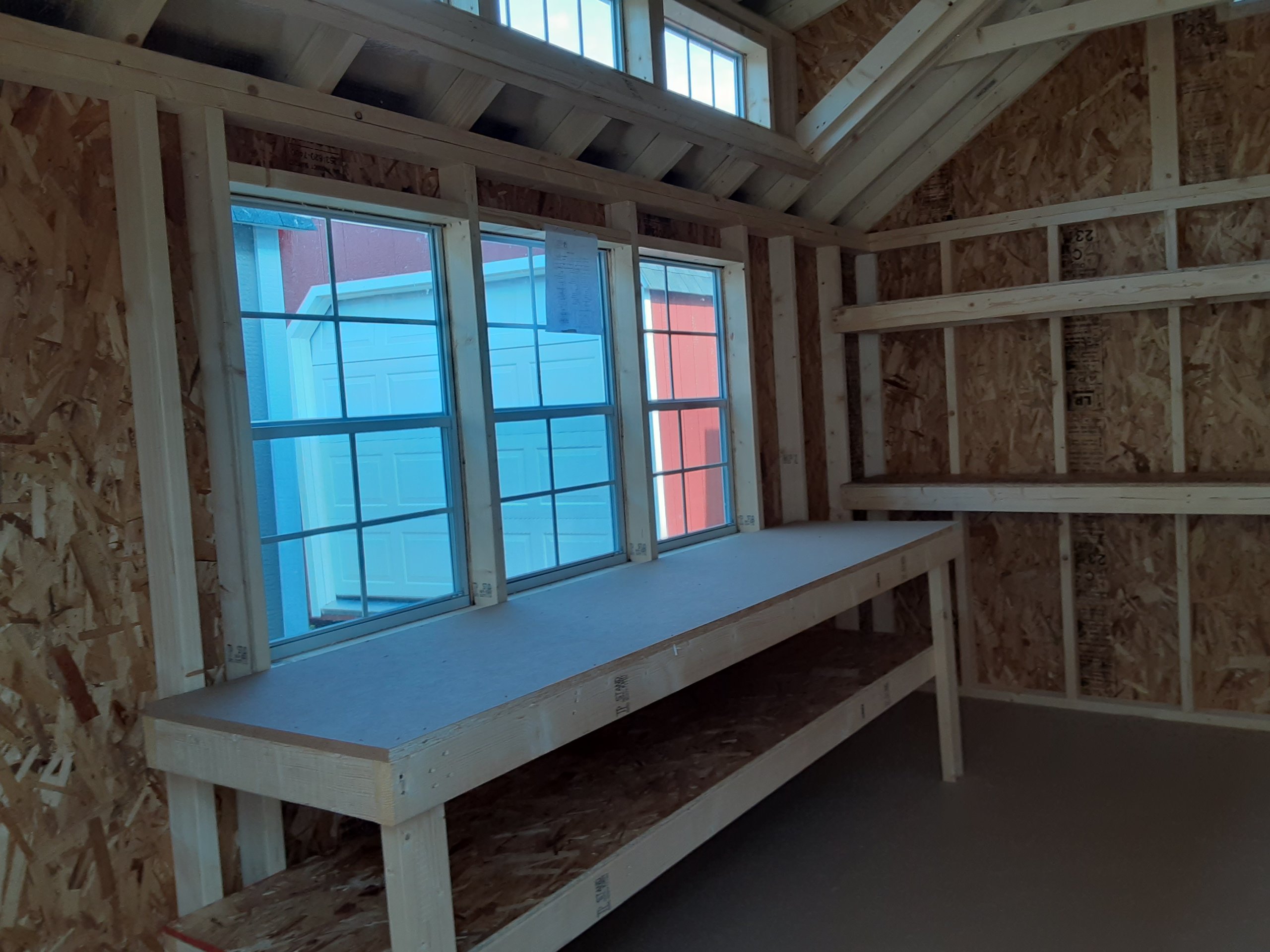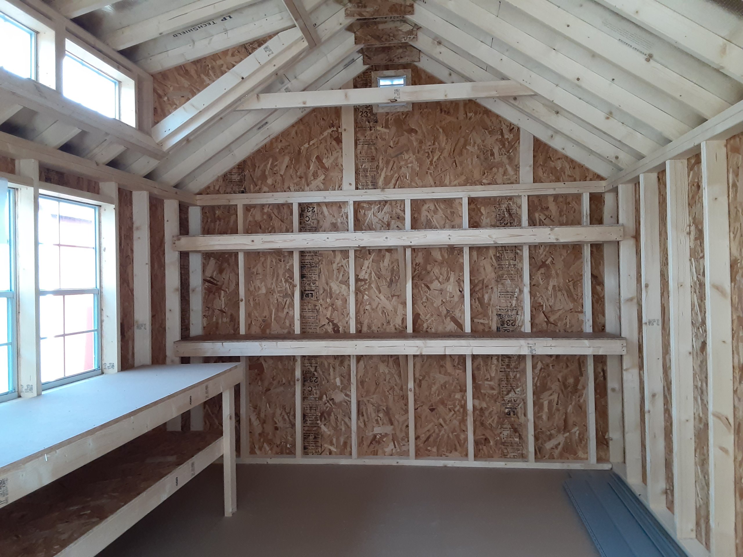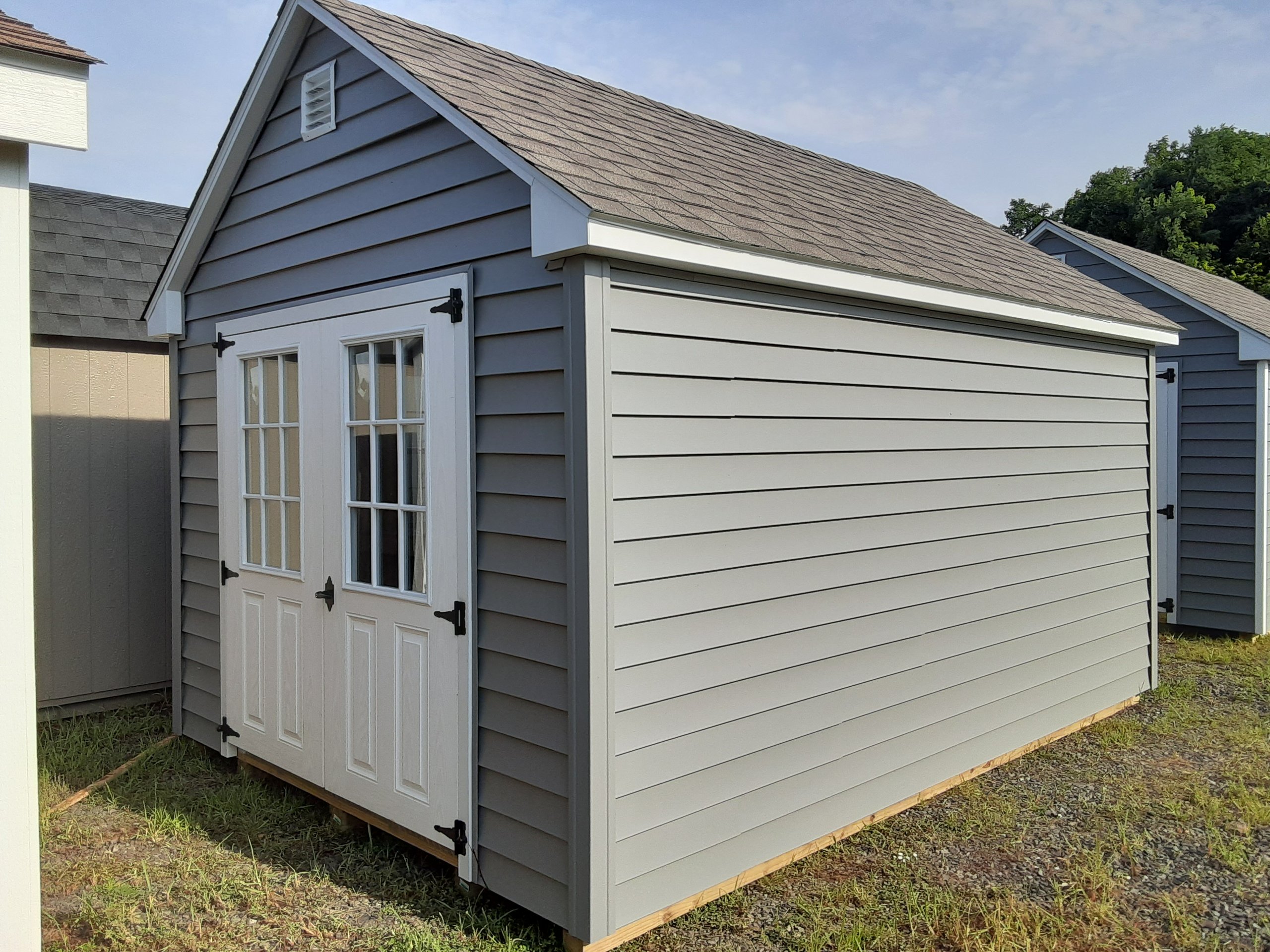 Introducing the Standard A-Frame Storage Shed, meticulously crafted by Amish artisans. This 10×14 shed features durable vinyl siding in a timeless Deep Granite hue, accented by crisp White trim. The Weatherwood-colored roof with shingles adds a touch of elegance. Two shelves and workbench for added storage space. With two windows and a double door, accessing your belongings is a breeze. The solid construction includes 2×4 studs for the walls and 2×4 rafters for the roof, ensuring durability. Elevate your storage solution with the Amish-built Standard A-Frame Storage Shed today.