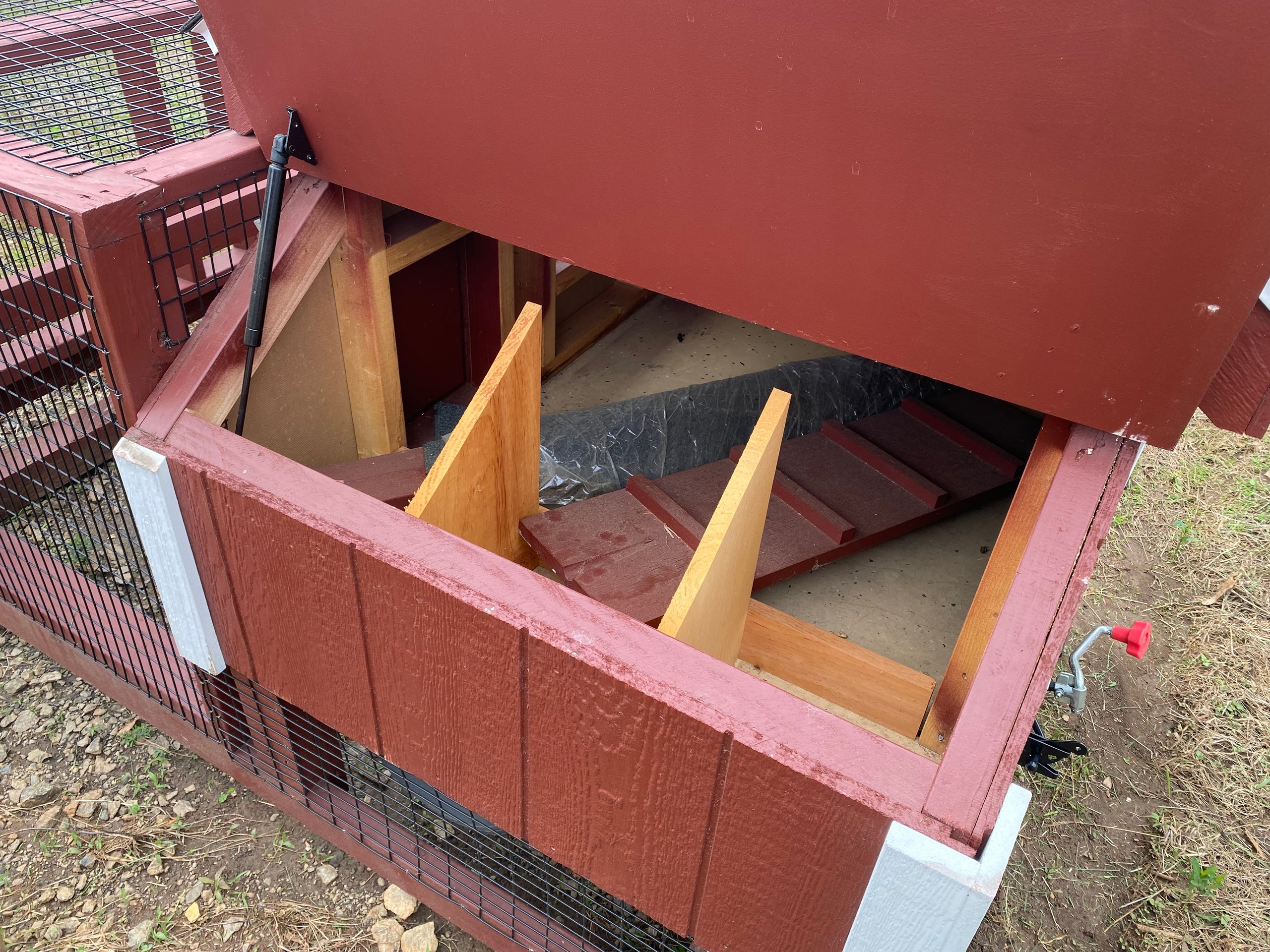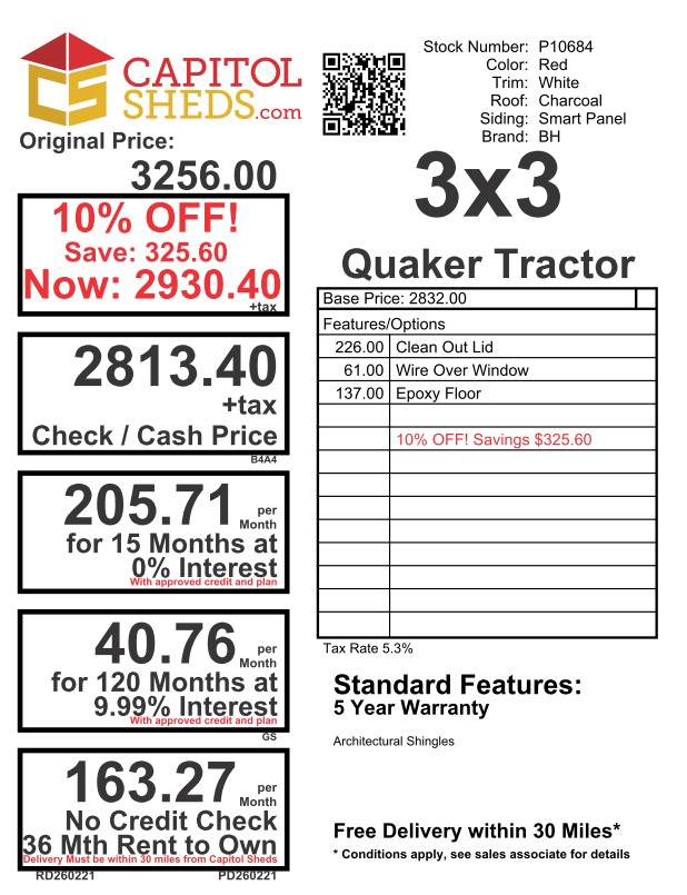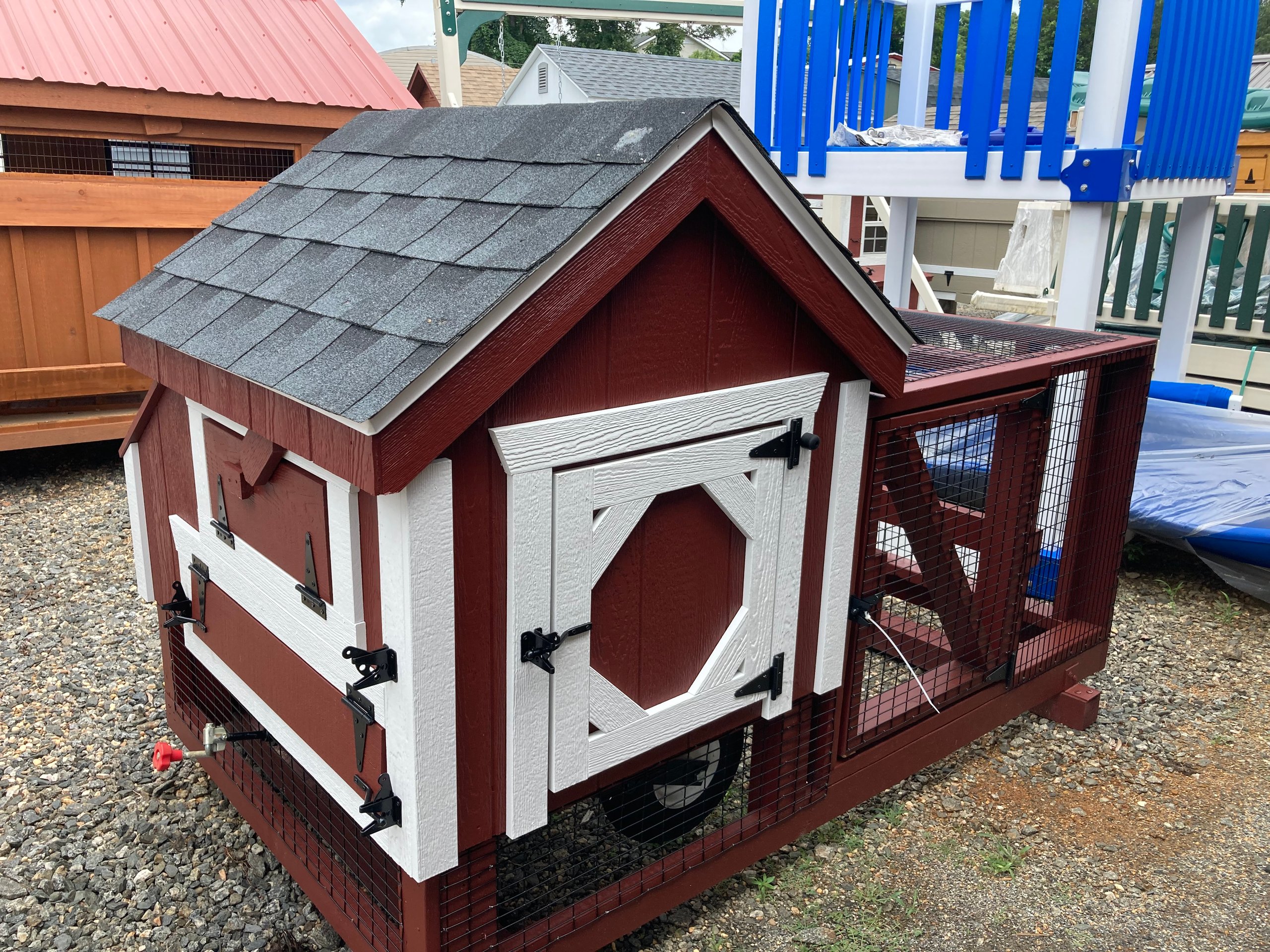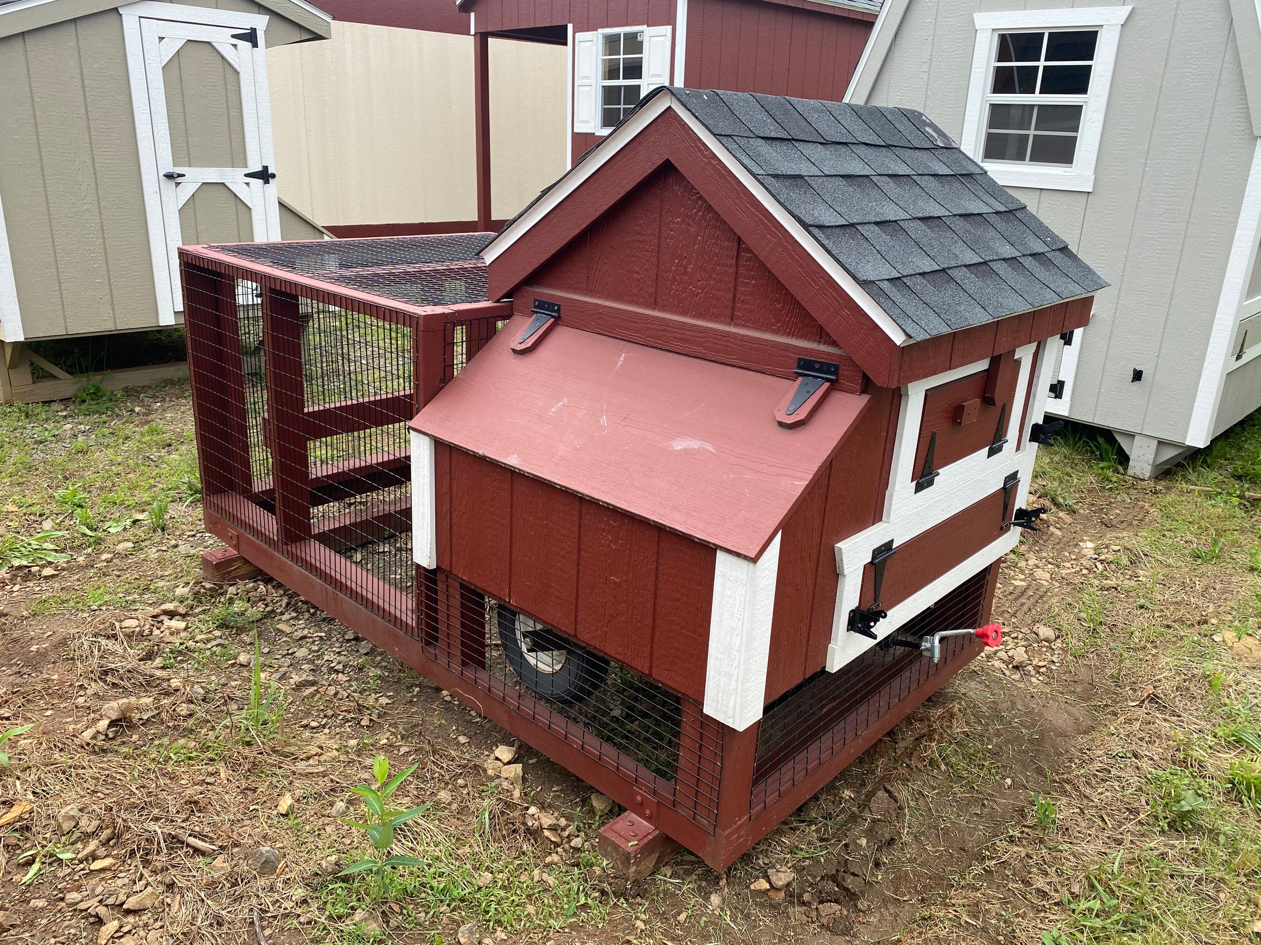 Name: Tractor Coop Size: 3×3 Siding: LP Smart Panel Main Color: Red Trim Color: White Roof Color: Charcoal Roof: Shingled Number of Windows: 1 Number of Doors: 1 Epoxy Floor Wire over window Clean out Lid Wall Framing: studs 16 inches on center Framing:2×4 rafters 16 inches on center Sheeting: Tech Shield Flooring: Prostruct Flooring