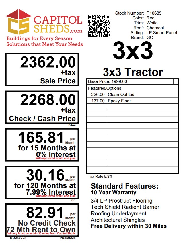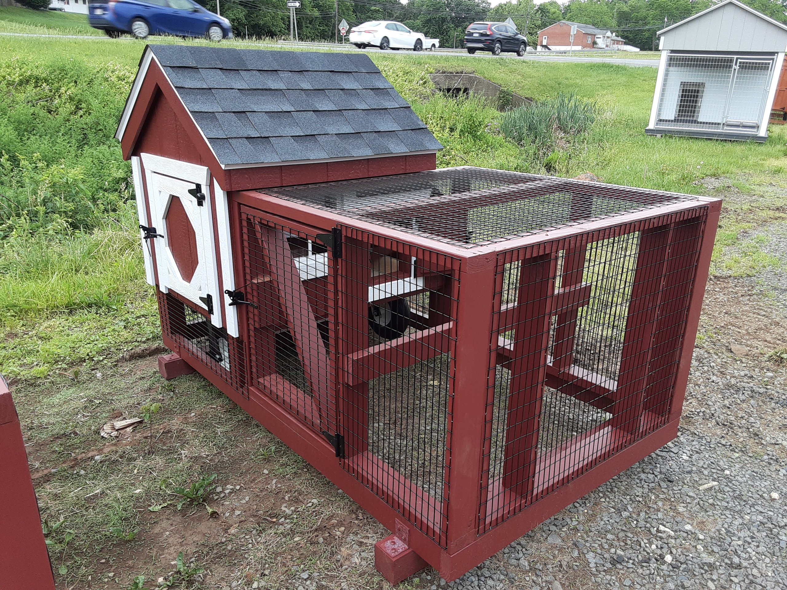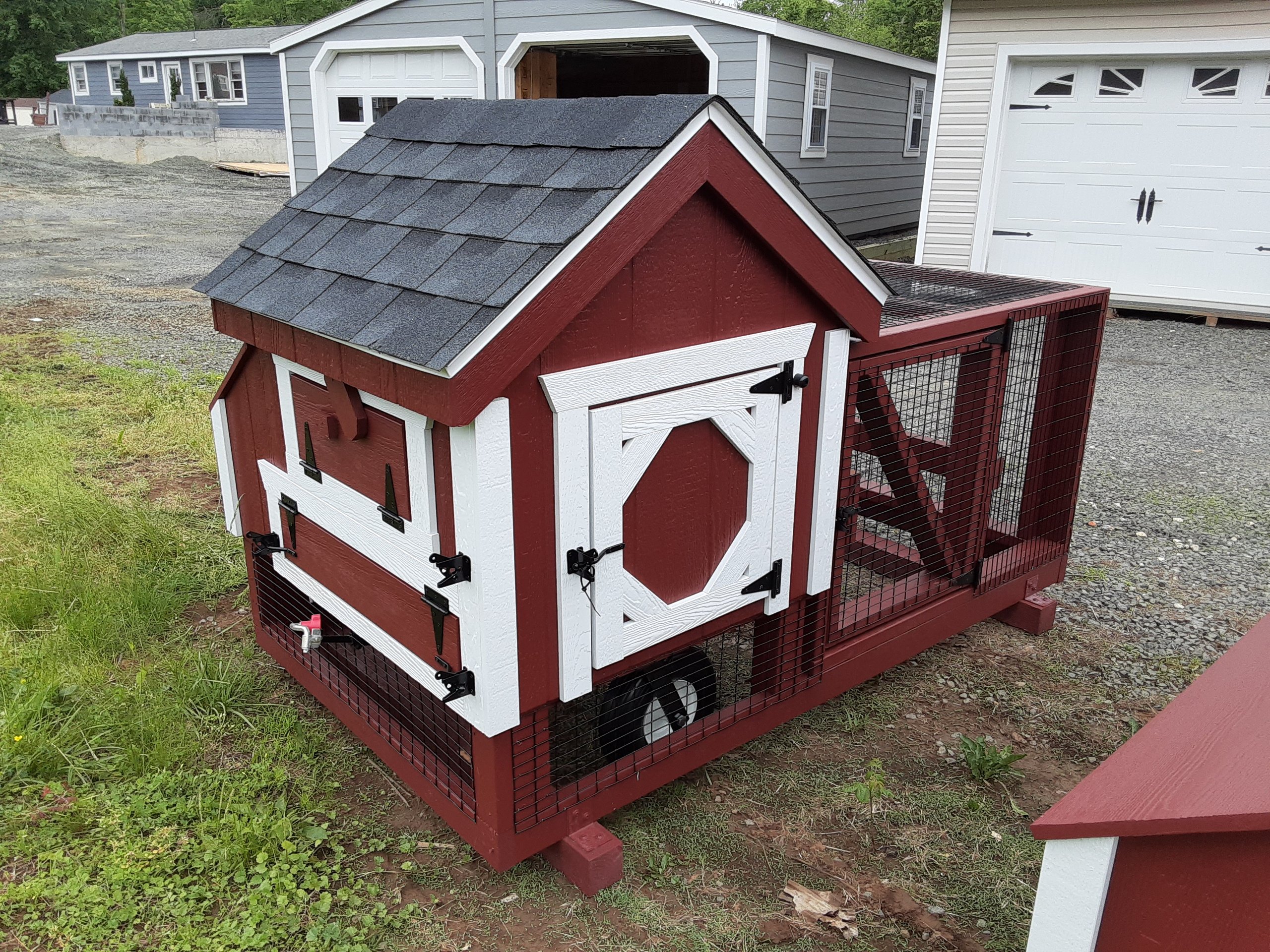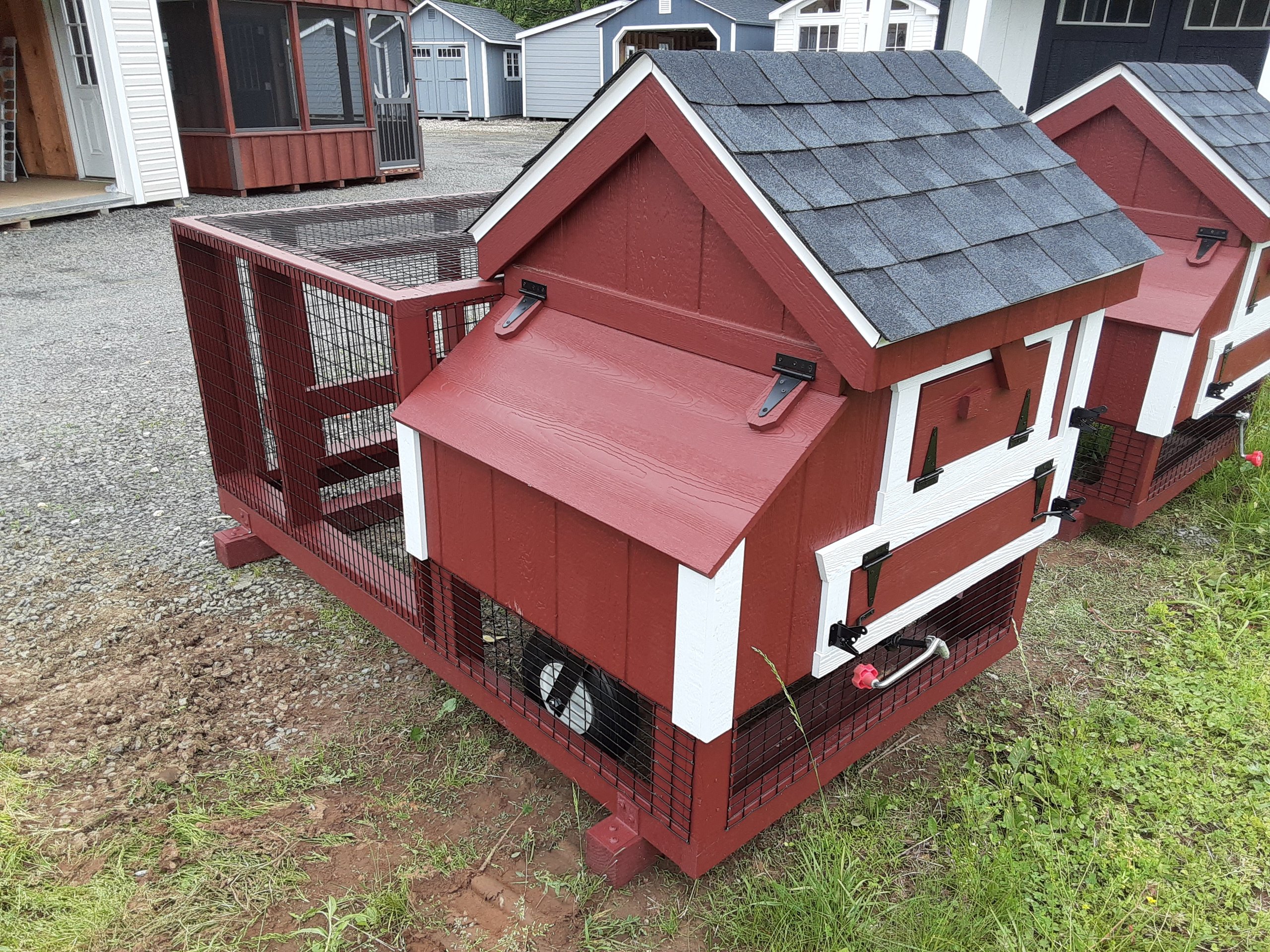 Style Name: Chicken Coop Size: 3×3 Siding: LP Smart Panel Main Color: Red Trim Color: White Roof Color: Charcoal Roofing: Shingles Roofing Underlayment: Roof Felt Wall Framing: 2×4 studs 16 inches on center Roof Framing: 2×4 rafters 16 inches on center Roof Sheeting: LP Tech Shield Upgraded Features: Epoxy Floor