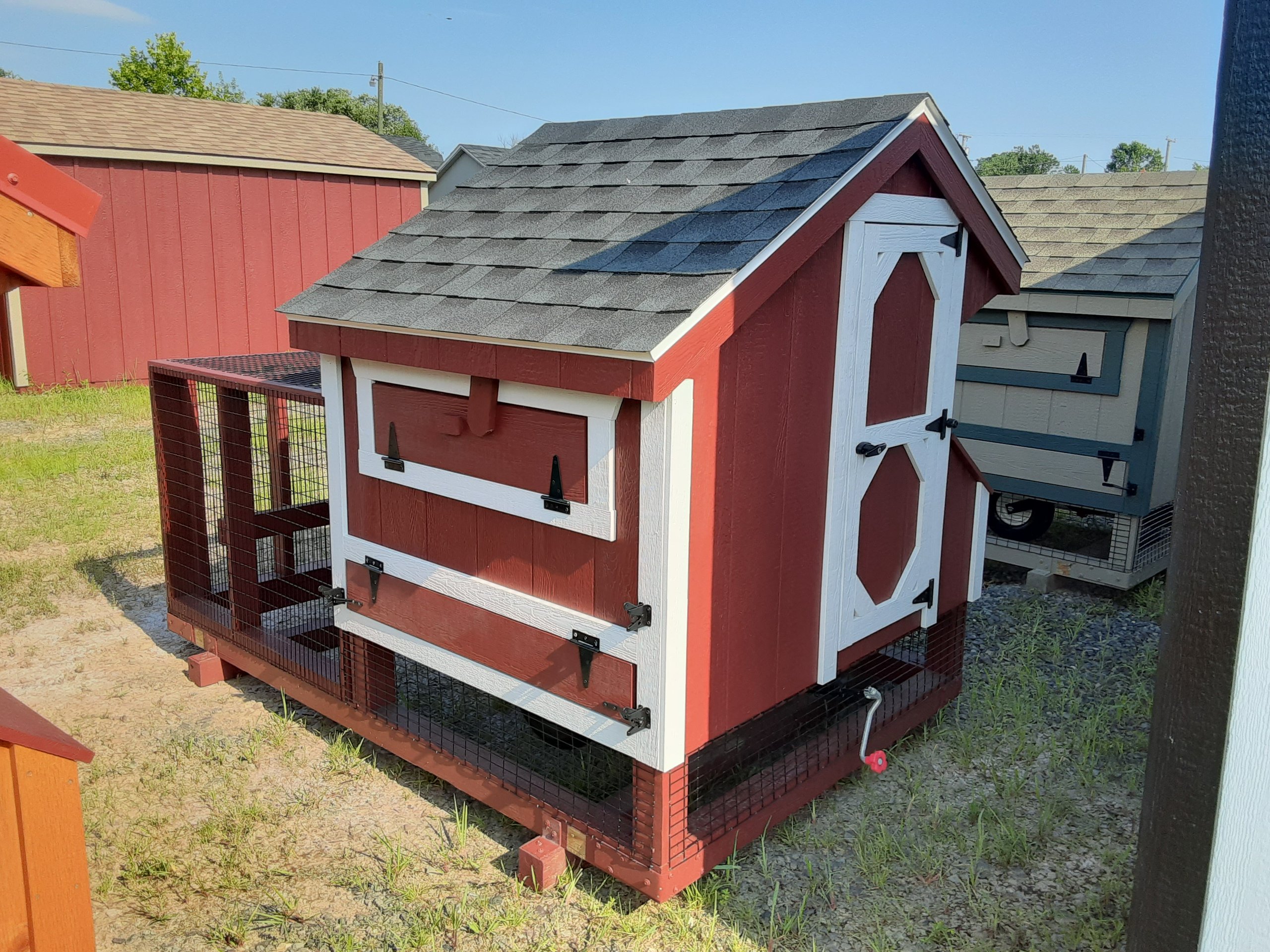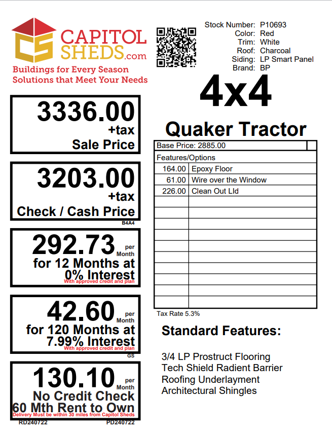 Welcome to the Tractor Coop, the charming Amish-built haven for your beloved chickens. This 4×4 coop features Red Smart Panel and White Trim, accentuated by a Charcoal Shingled roof. Sturdy 2×4 framing and LP Prostruct Flooring ensure a cozy and durable space. 1 windows allow ample natural light, for care. Experience exceptional upgrades, including Epoxy floor, Pamper your feathered friends with this functional and stylish Tractor Coop. Limited stock available, so seize this opportunity to provide your chickens with their dream home.