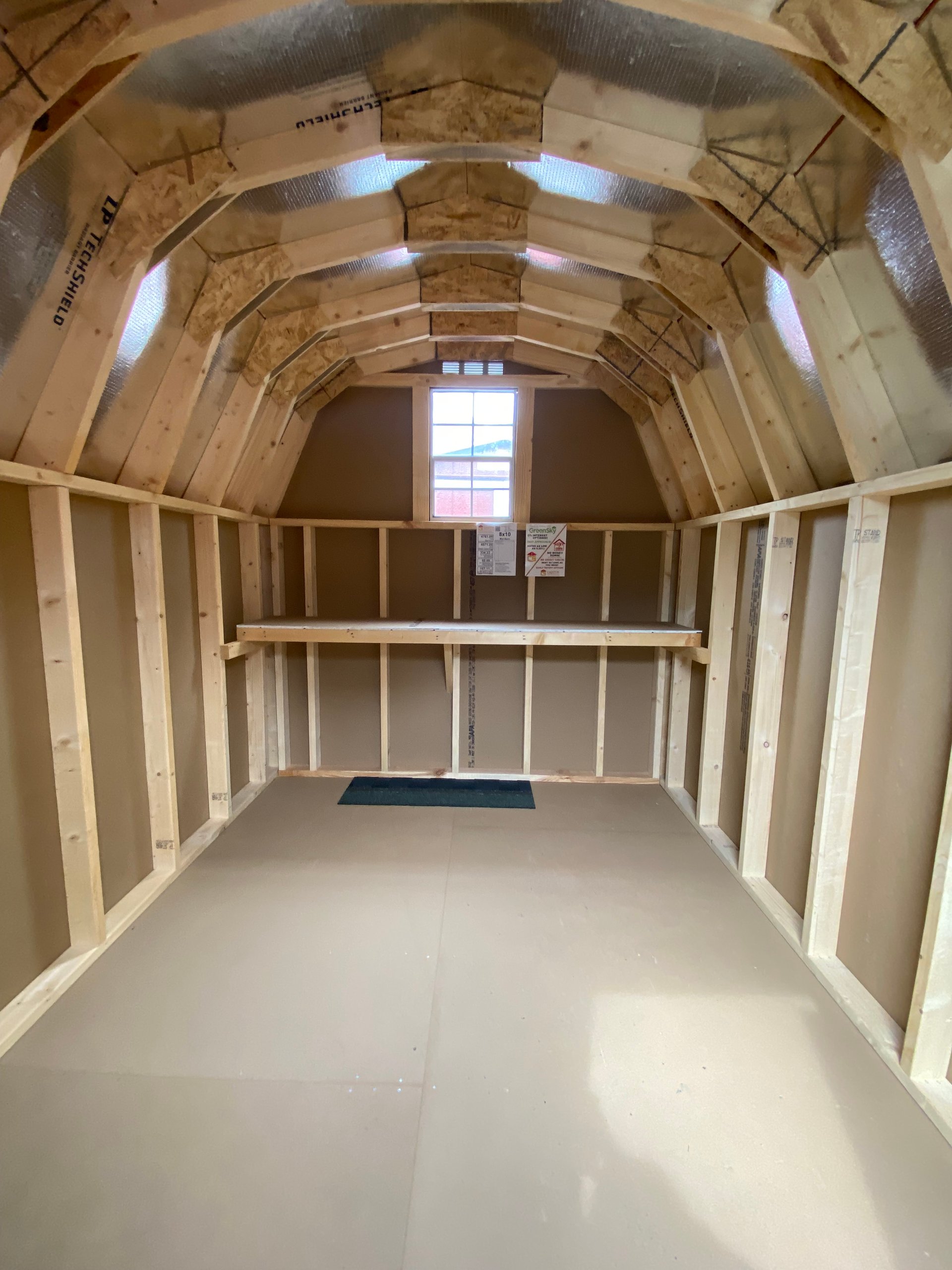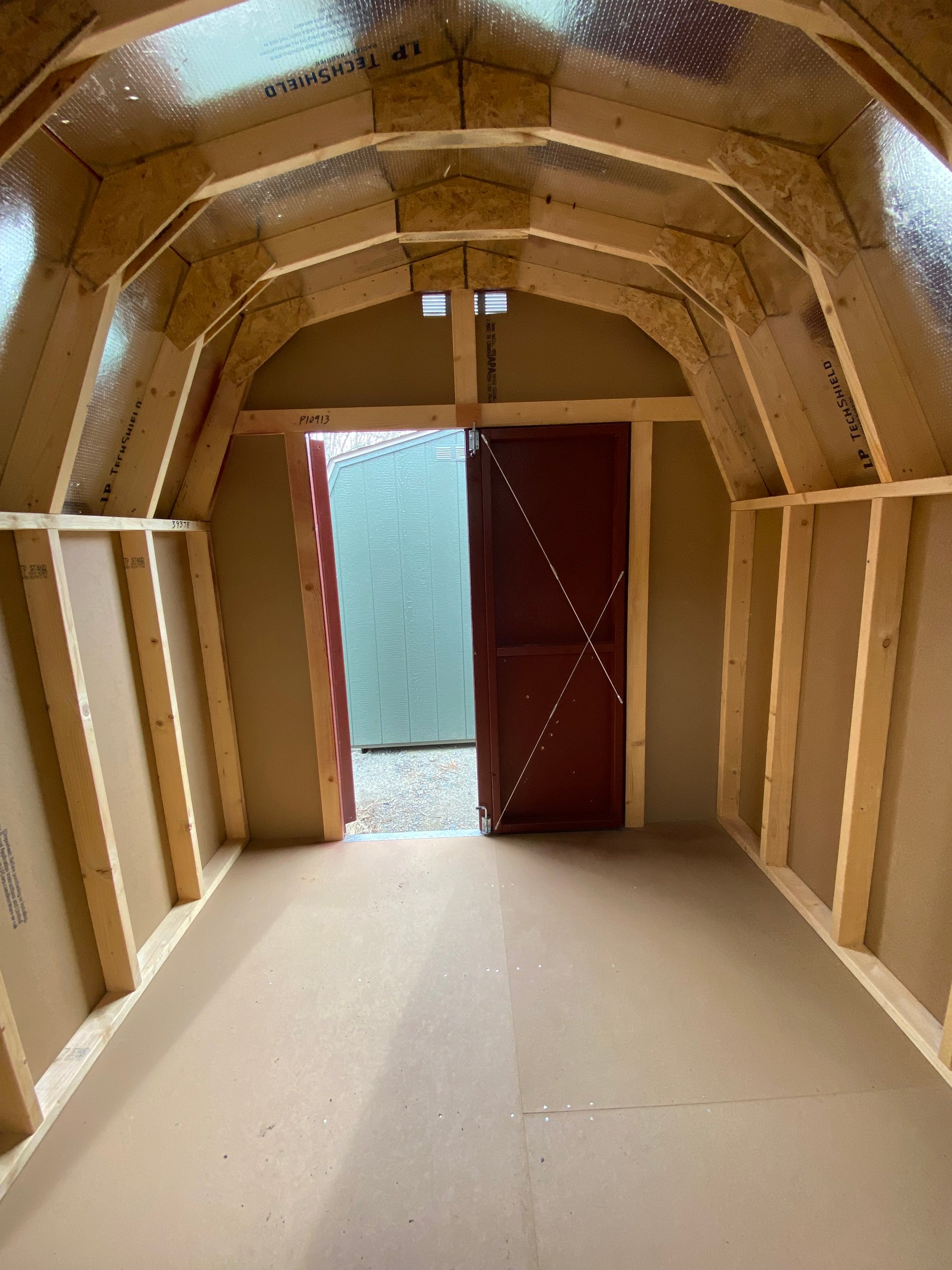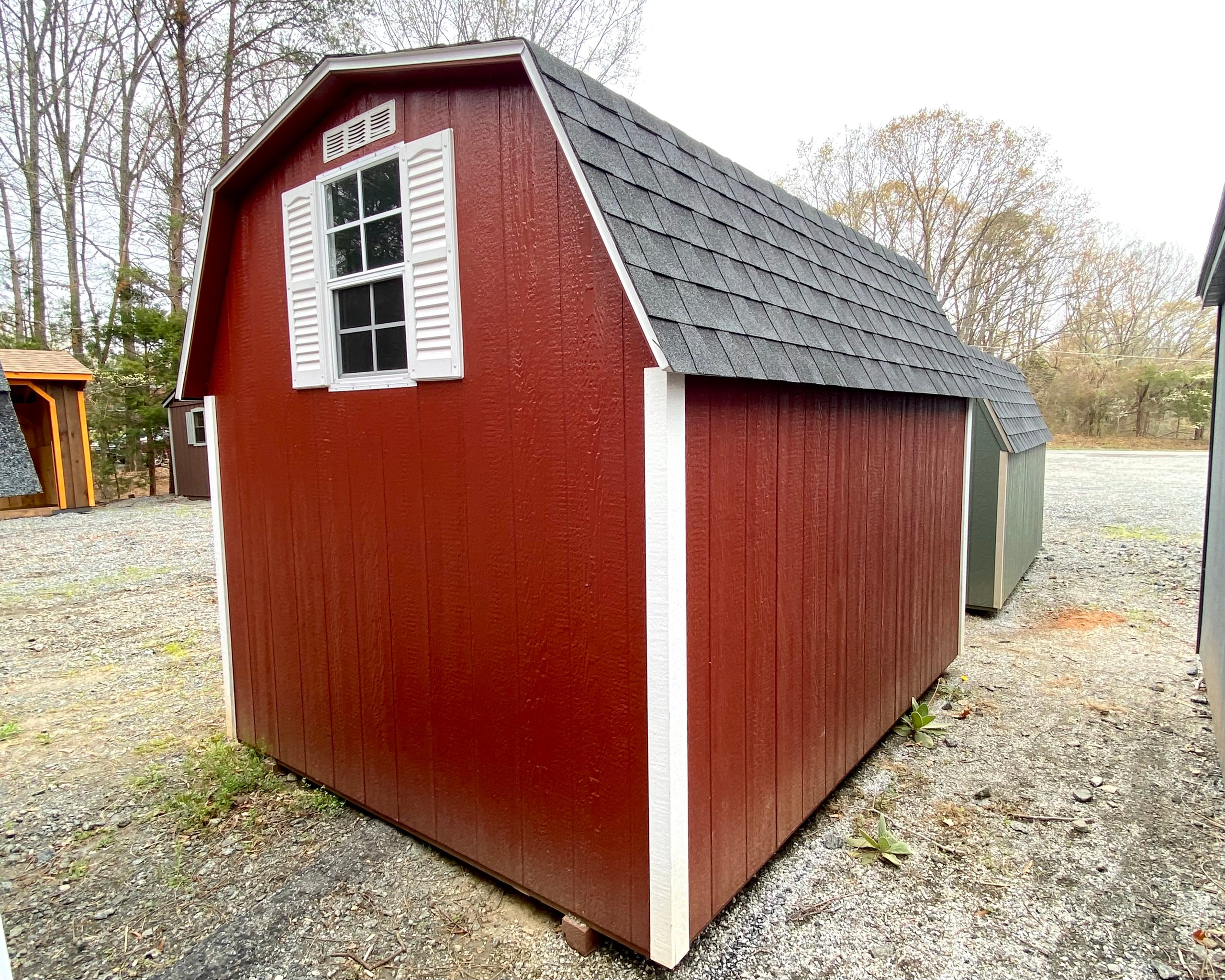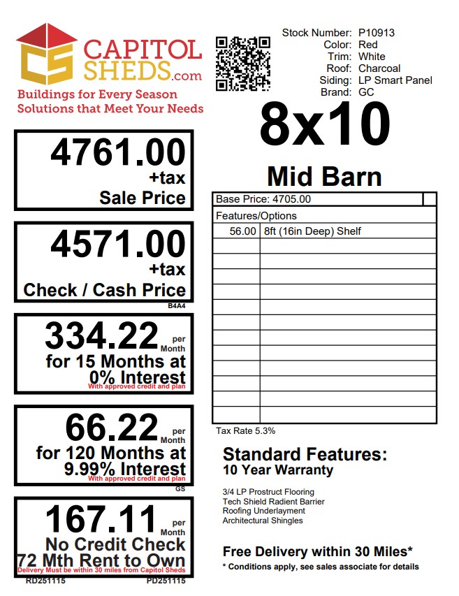 Style Name: Mid Barn Size: 8×10 Siding: LP Smart Panel Main Color: Red Trim Color: White Shingle Color: Charcoal Shingles: IKO Cambridge Dimensional Shingles Number of Windows: 1 Number of Doors: 2 Wall Framing:2×4 studs 16 inches on center Roof Framing:2×4 rafters 16 inches on center Roof Sheeting:LP Tech Shield Flooring: LP Prostruct Flooring Floor Joists:Pressure Treated 2×4 joists 16 inches on center Included Upgrades: 16″ Shelf
