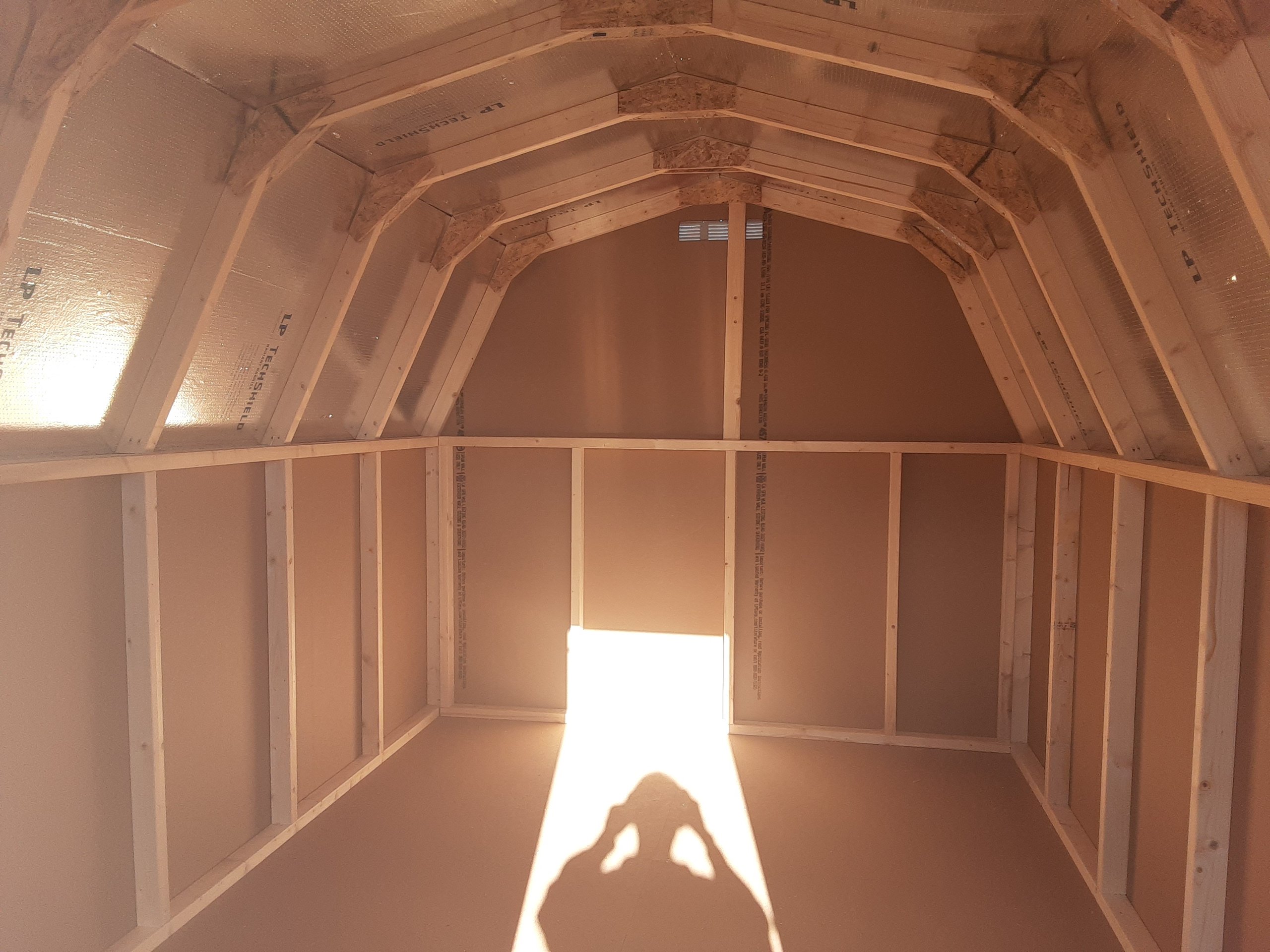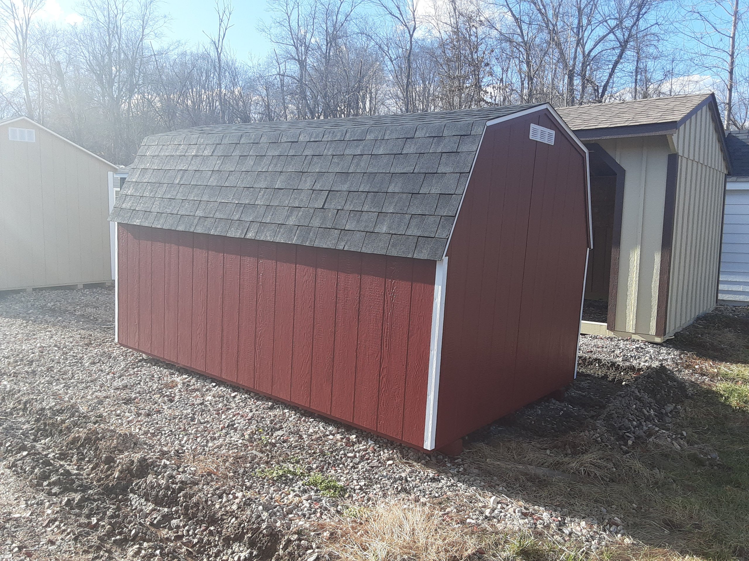 Style Name: Economy Barn Size: 8×12 Siding: LP Smart Panel Main Color: Red Trim Color: White Roof Color: Charcoal Roof: Shingles Number of Doors: 1 Wall Framing:2×3 studs 24 inches on center Roof Framing:2×3 rafters 24 inches on center Roof Sheeting:LP Tech Shield Flooring: LP Prostruct Flooring Floor Joists:Pressure Treated 2×4 joists 16 inches on center