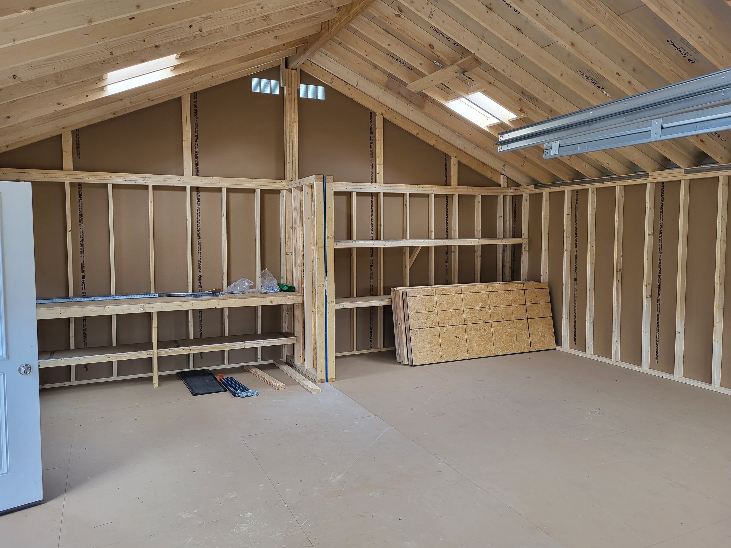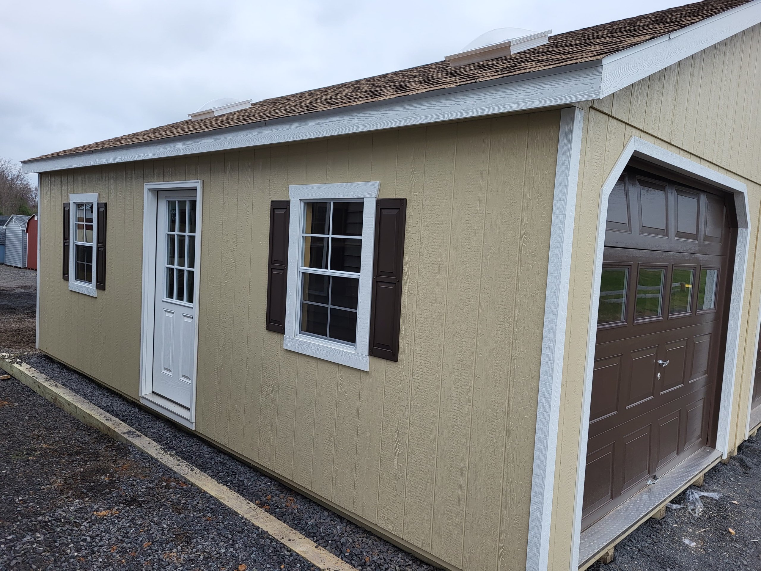 The 24×24 Modular Garage is a robust and spacious structure featuring LP Smartpanel siding in a cream main color with white trim, topped with a Shakewood-colored shingle roof. Built with 2×4 studs and rafters 16 inches on center, it includes roof felt underlayment and LP Tech Shield roof sheeting for enhanced durability and insulation. Upgraded features add functionality and aesthetic appeal: two shelves, a workbench, a house door, a hinged roof, four skylights, glass in garage doors, and shutters. This garage combines practicality with style, making it a perfect solution for secure storage and workspace needs.