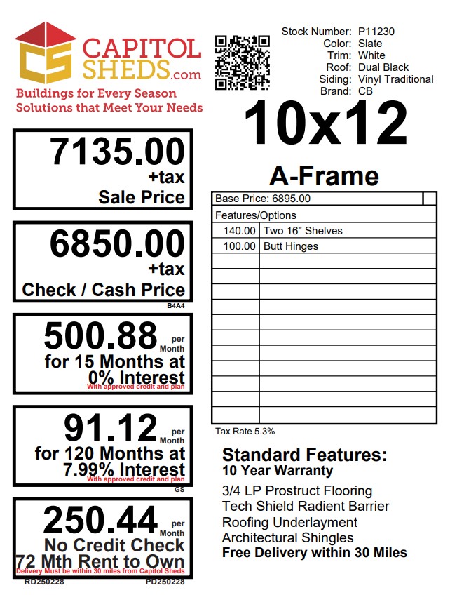 Upgrade your storage with this 10×12 Amish-built shed, designed for durability and style. Featuring sleek Slate vinyl siding with White trim, it’s topped with Dual Black dimensional shingles and roof felt underlayment for superior protection. Built with 2×4 wall and roof framing, LP Tech Shield roof sheeting, and premium butt hinges, it ensures lasting strength. Inside, two spacious shelves provide efficient organization for tools, equipment, and supplies. Whether used for storage, a workspace, or a backyard retreat, this shed combines expert craftsmanship with practical upgrades, offering a reliable and attractive solution for your outdoor storage needs.