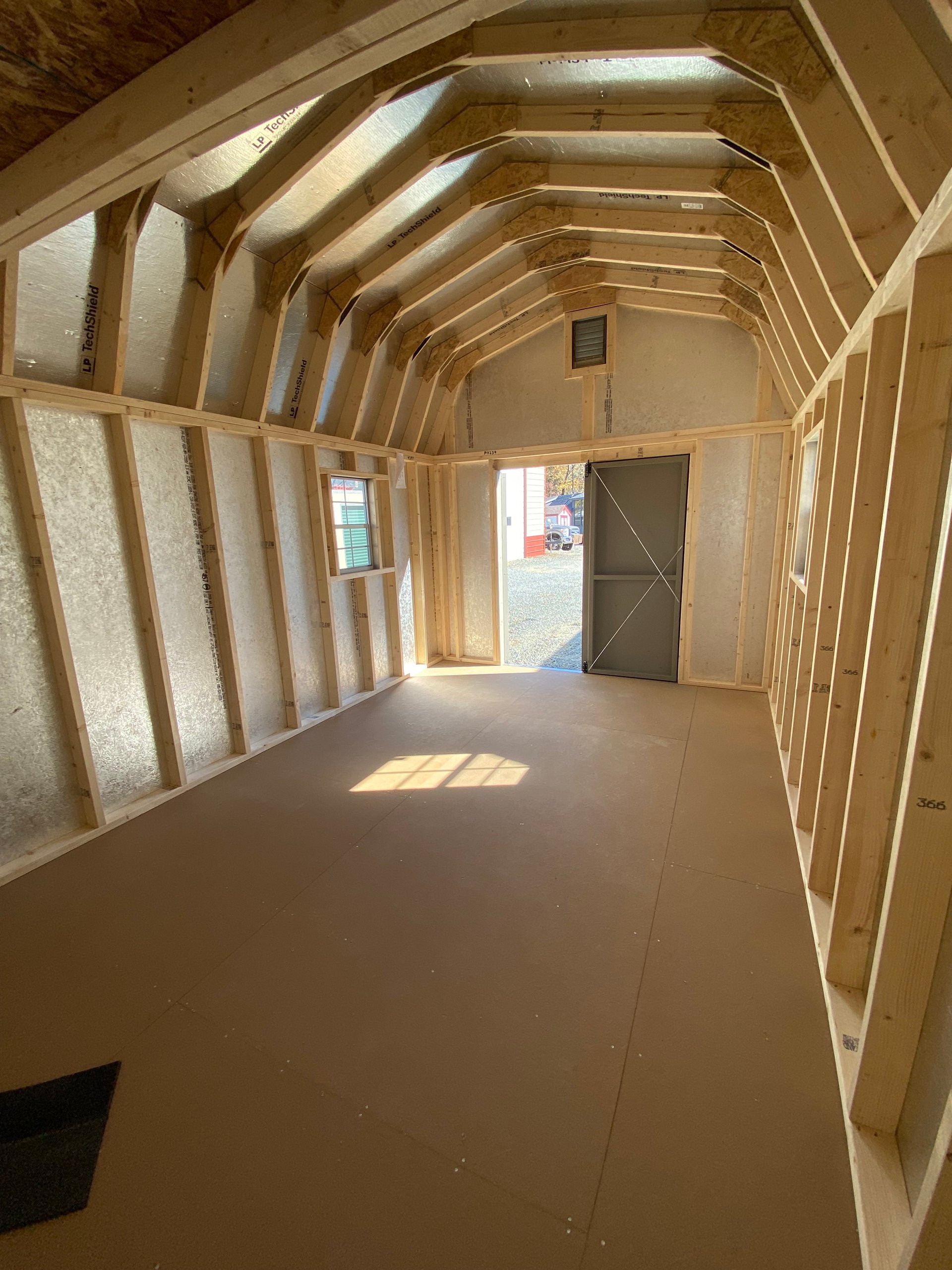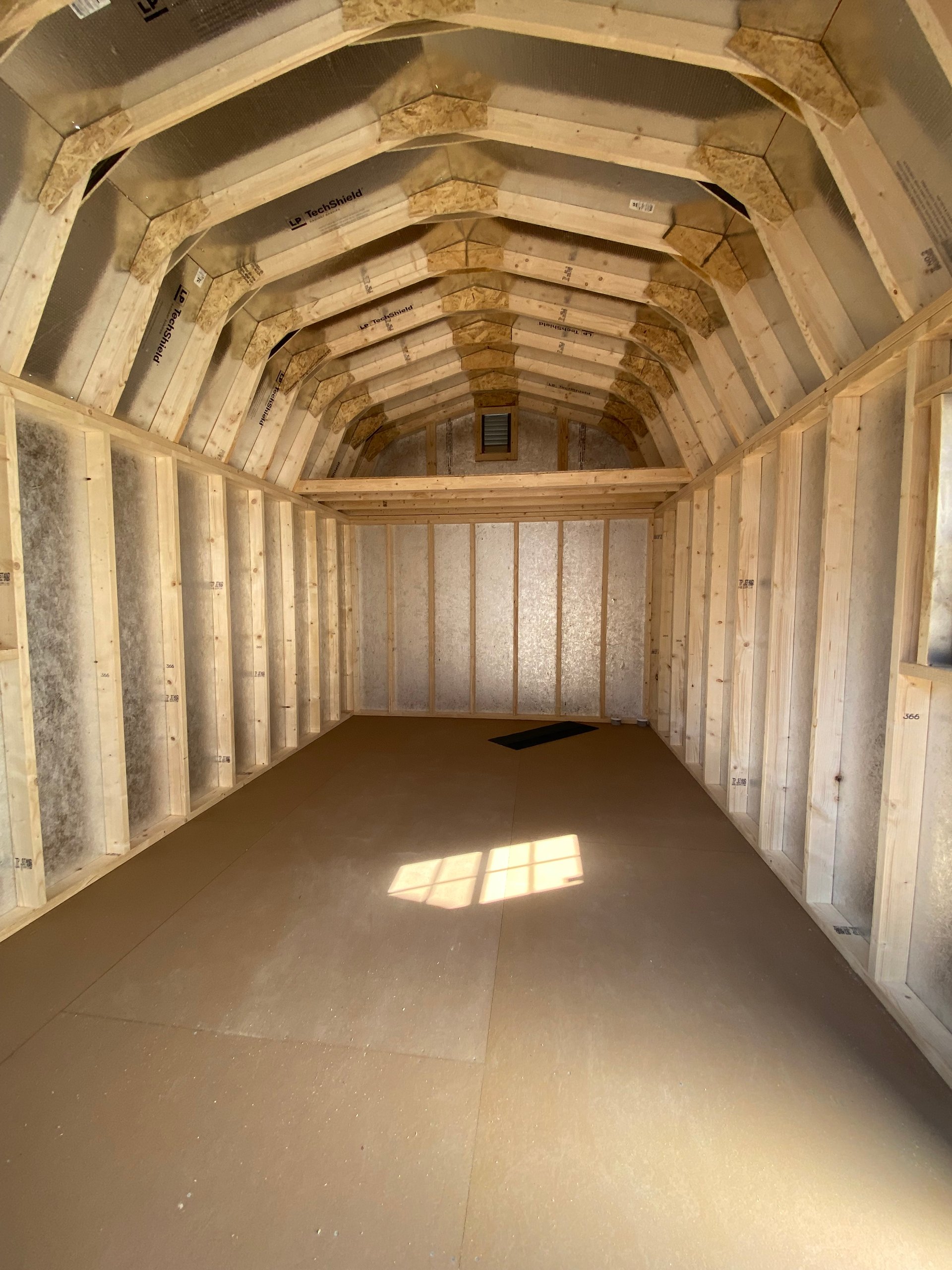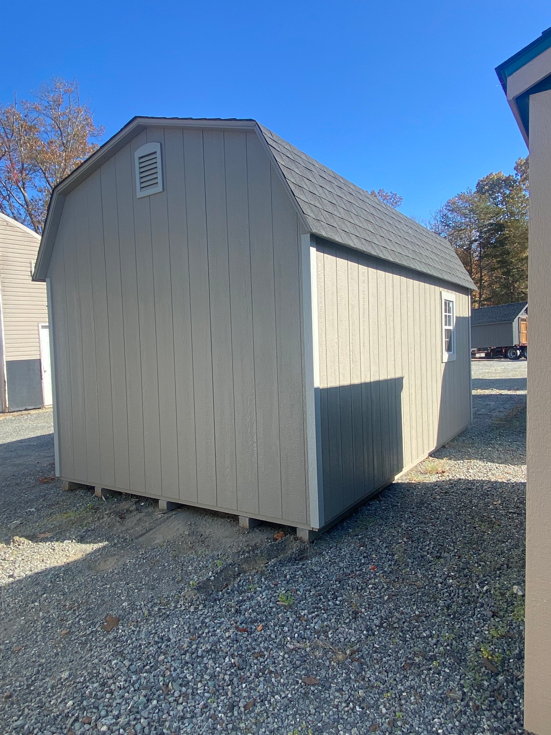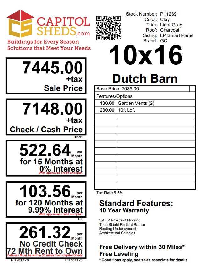 Maximize your storage with this 10×16 Amish-built Dutch Barn, designed for durability and efficiency. Featuring Clay LP Smart Panel siding with Light Grey trim, it’s topped with Charcoal architectural shingles and roof felt underlayment for superior weather protection. Built with 2×4 wall and roof framing, LP Tech Shield roof sheeting, and LP T&G Prostruct flooring, this barn ensures lasting strength. Two garden vents enhance airflow, while a spacious 10ft loft provides additional overhead storage. With two windows for natural light and double doors for easy access, this barn is the perfect blend of practicality, craftsmanship, and long-term reliability.