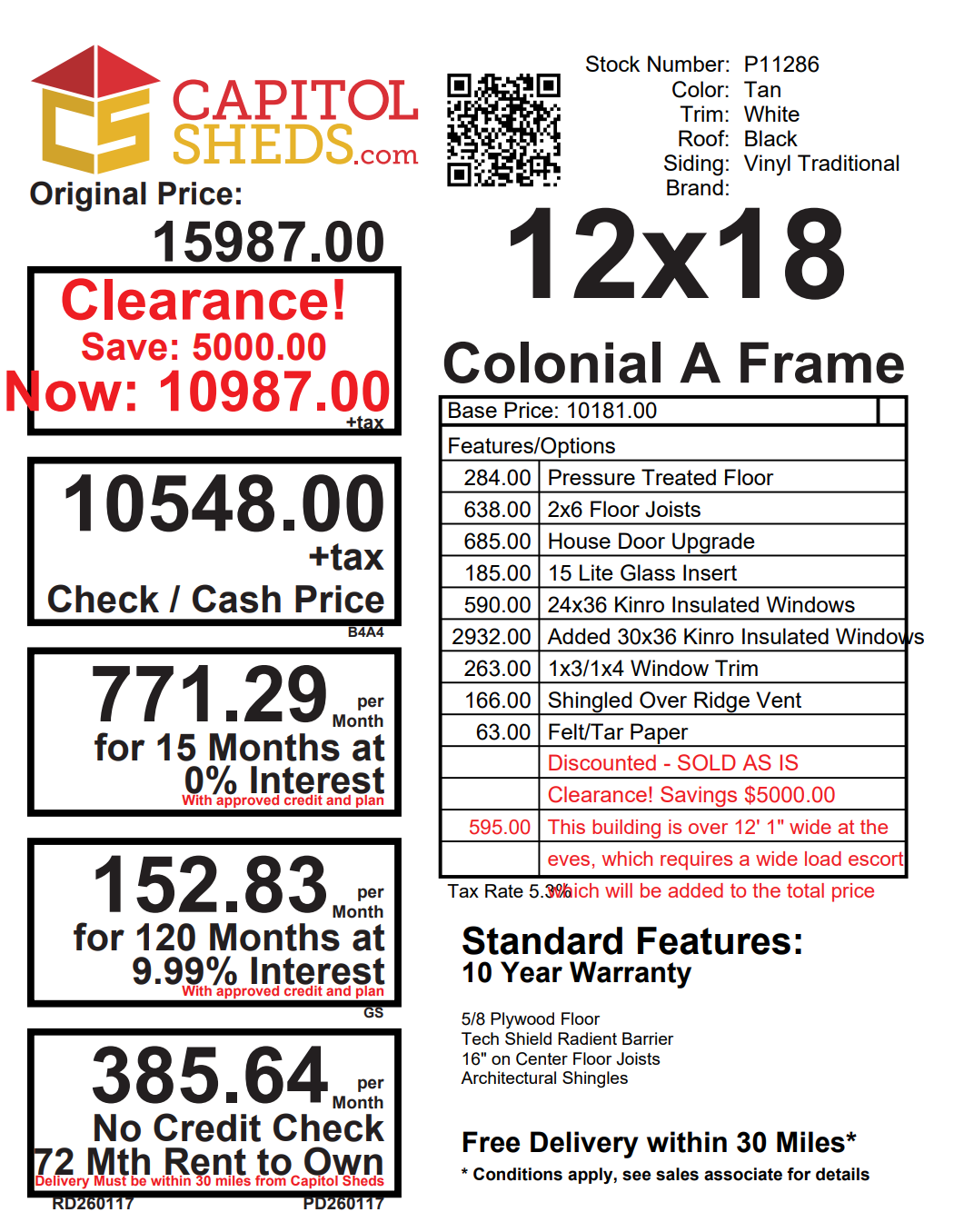 Reserve this building for a $500 deposit. Within 1 business day a representative will contact you to discuss delivery details and discounts you may qualify for such as cash/check, military/1st responder, etc.5Location: Stafford
