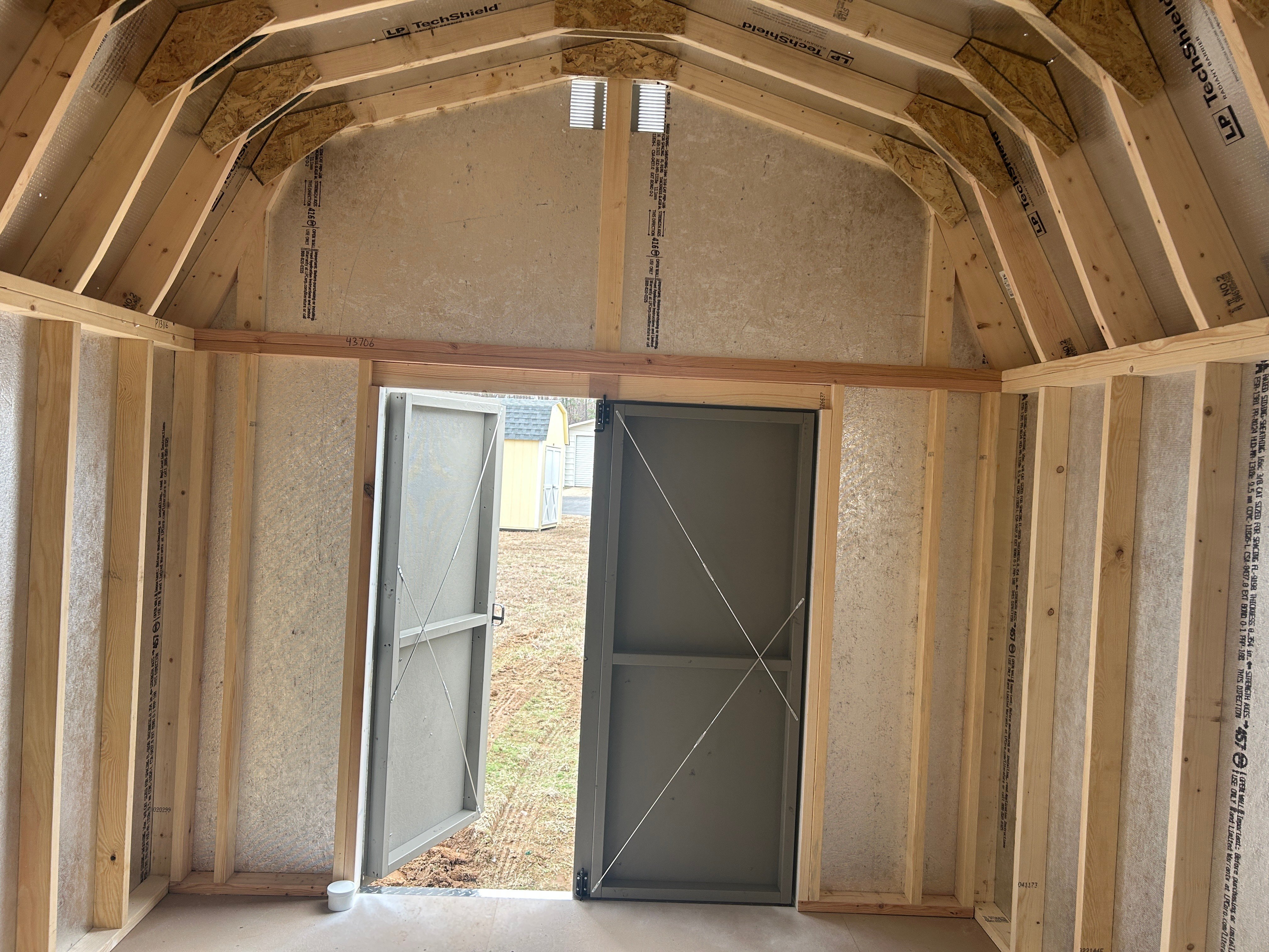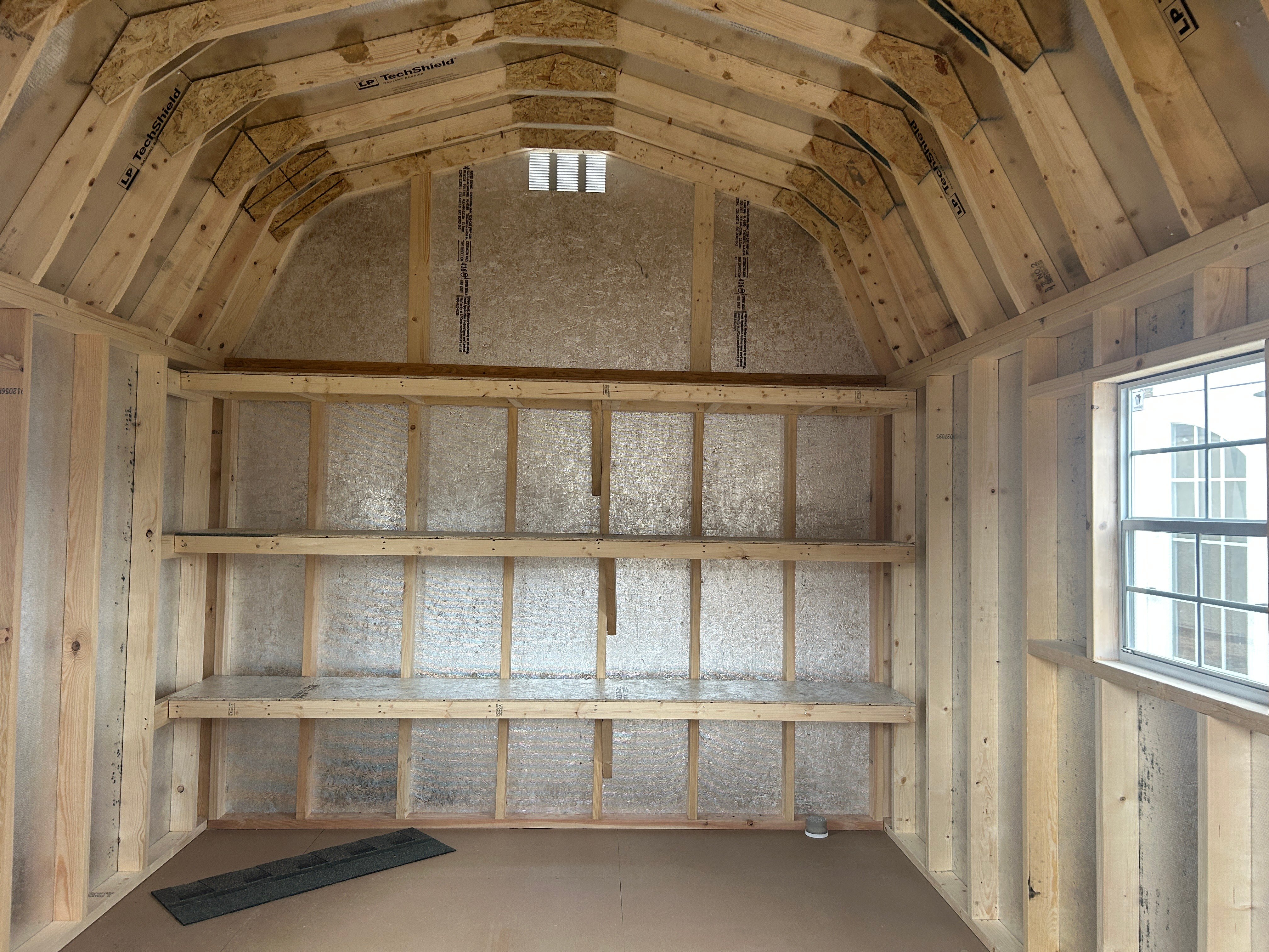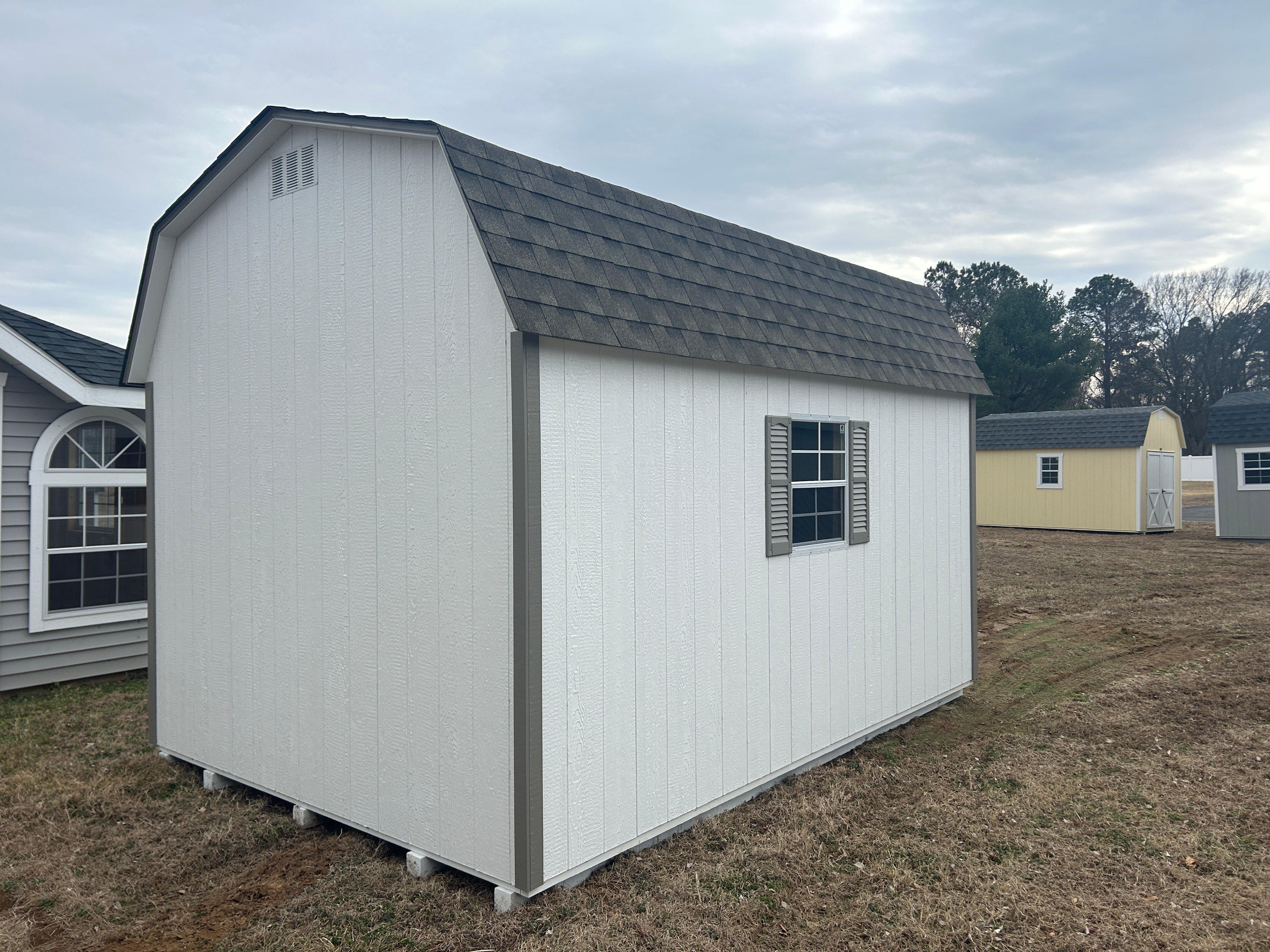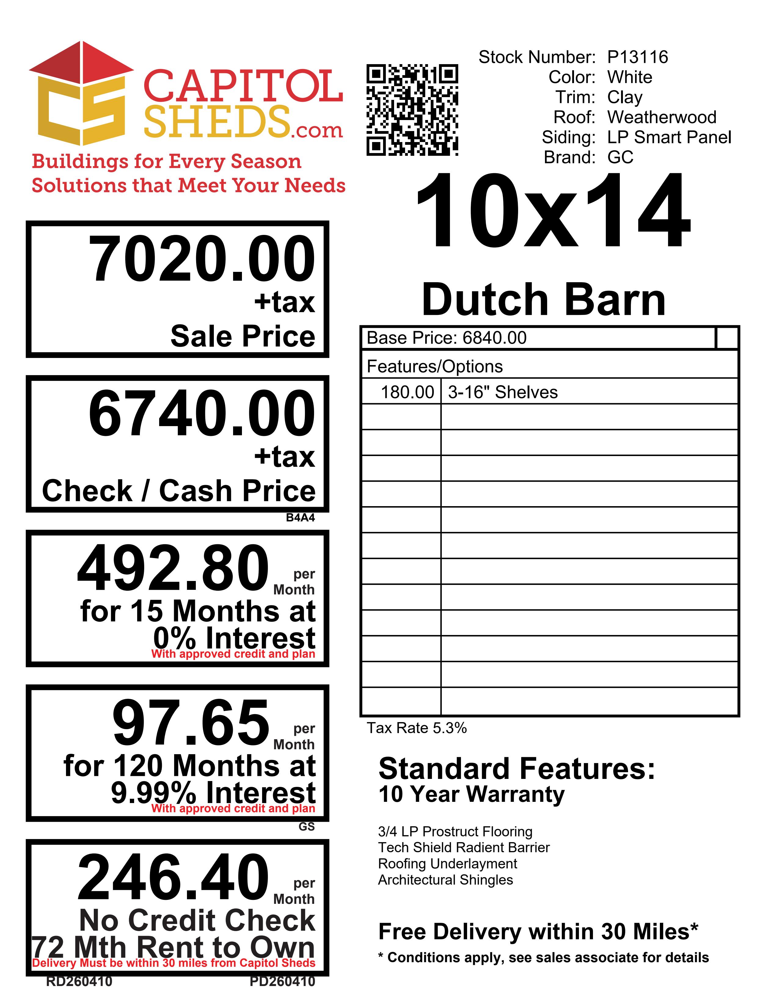 Add timeless charm and practical storage to your backyard with this 10×14 Dutch Barn shed, handcrafted by Amish builders for dependable quality. Featuring clean white LP Smart Panel siding with clay trim and a warm weatherwood shingle roof, it offers classic appeal and durability. Two windows provide natural light, while the spacious interior is enhanced with 16″ shelves for organized storage. A single door ensures easy access, making it perfect for tools, lawn equipment, and seasonal items.