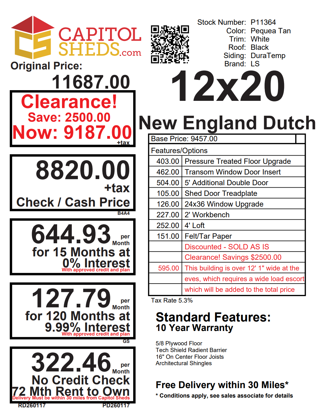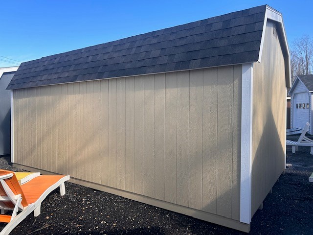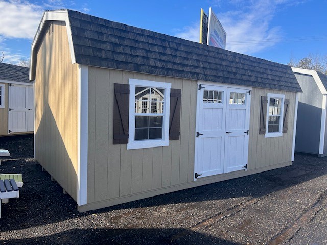 Experience the timeless elegance of the New England Dutch shed. With its 12×20 size, Duratemp siding, and Pequea Tan main color, it exudes charm. The Black shingle roof adds a touch of sophistication. Featuring 2 windows and 2 doors, this shed offers ample natural light and convenient access. The 2×4 wall and roof framing ensure durability and strength. With a pressure-treated floor, a transom window door insert, and a 5′ extra double door, it’s designed to meet your storage needs. Enjoy the convenience of a shed door treadplate, a 24×36 window upgrade, a 2′ workbench, a 4×10′ loft, and felt roof paper.