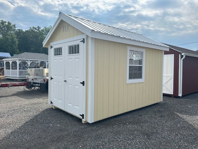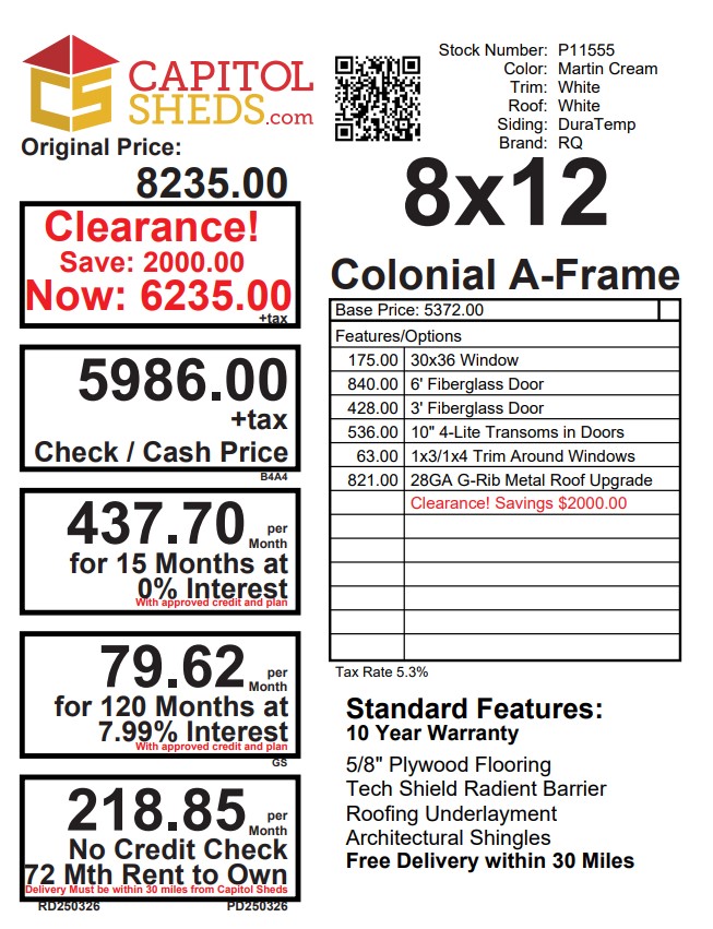 Step into elegance with the Colonial A-Frame, an 8×12 Amish-crafted retreat in Martin Cream Duratemp. Boasting 4 windows, 2 doors (including a 6′ fiberglass door), and intricate 1×3/1×4 window trim. LP Tech Shield roof, 28GA G-Rib Metal upgrade, and architectural shingles ensure enduring style. Transform your space with this timeless shed.