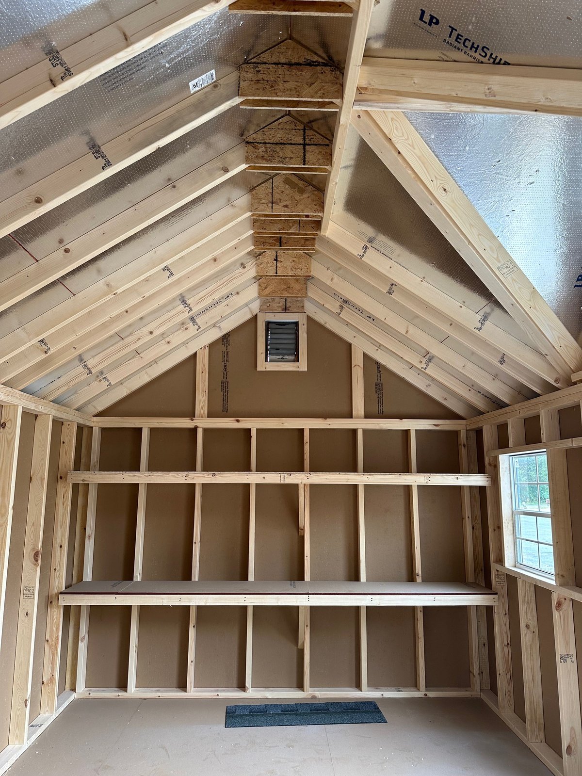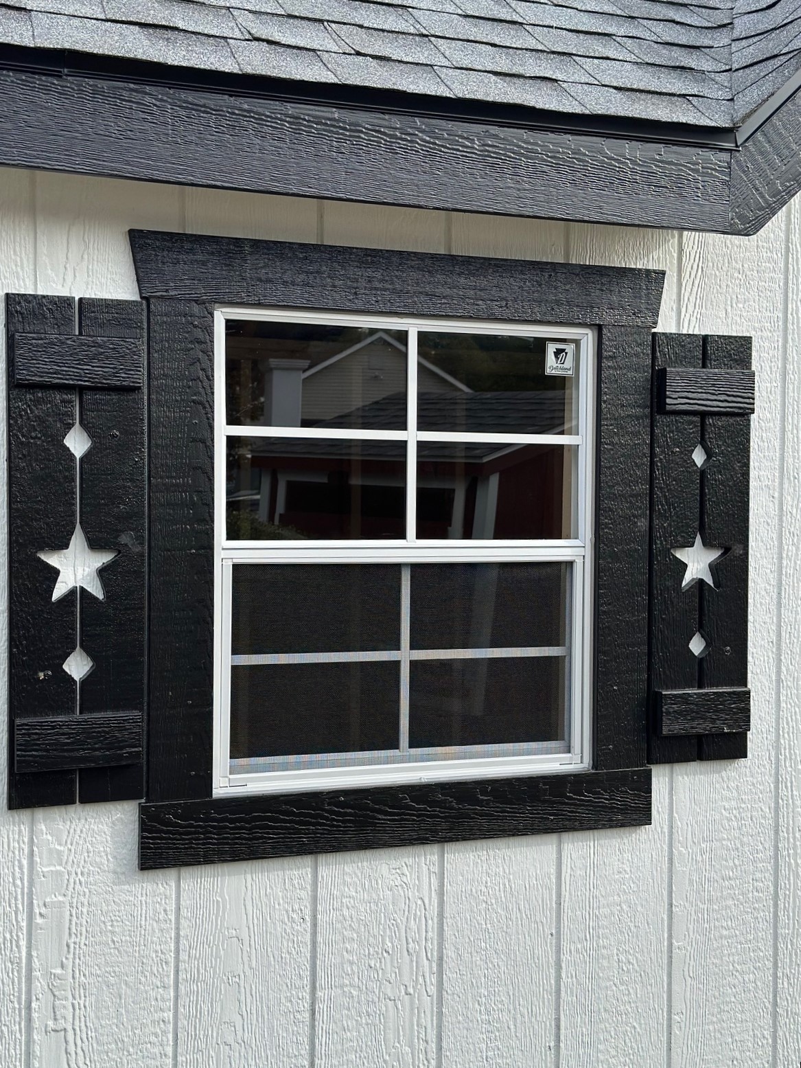 The 10×16 Kingston shed offers timeless charm with its classic white LP Smart Panel siding, bold black trim, and Pewter Gray shingle roof. Designed for durability, it features 2×4 wall and roof framing spaced 16 inches on center, LP Tech Shield roof sheeting, and LP Prostruct flooring over pressure-treated 2×4 joists. This model includes two windows, a convenient set of double doors, and a 9-lite fiberglass door that enhances curb appeal. Inside, two 16″x10″ shelves and garden vents come standard—perfect for ventilation and keeping your space organized. A versatile and attractive structure for storage or creative use.