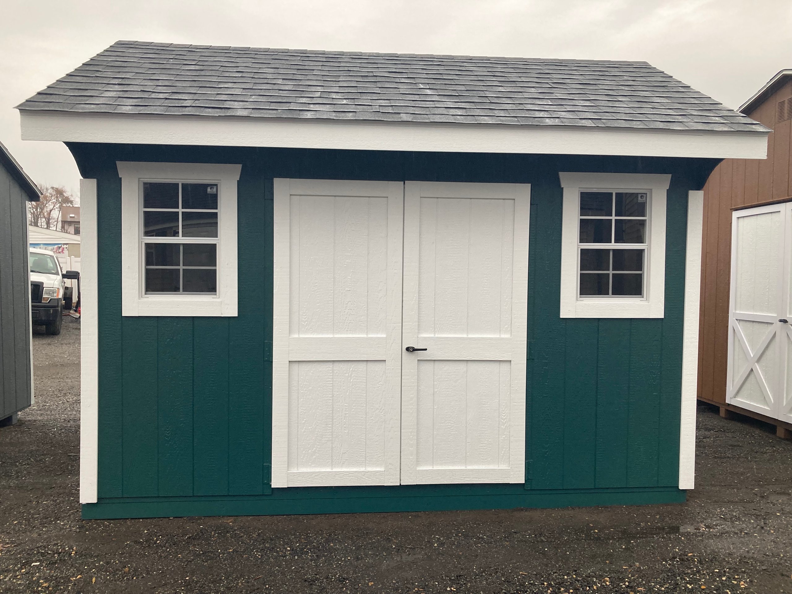 Introducing the Colonial Cottage 10×12 Storage Shed – a charming Amish creation. Adorned in soothing Green with crisp White trim, it’s a stylish storage solution. Crafted with durable LP Smart Panel siding and crowned with a Virginia Slate roof, featuring architectural shingles for lasting elegance. Embrace the outdoors through two windows, and enjoy easy access with a wider door. The 2×4 framing and LP Prostruct Flooring ensure durability, making it a timeless addition to your space. Redefine storage with this cottage-inspired masterpiece, where functionality meets aesthetics seamlessly.