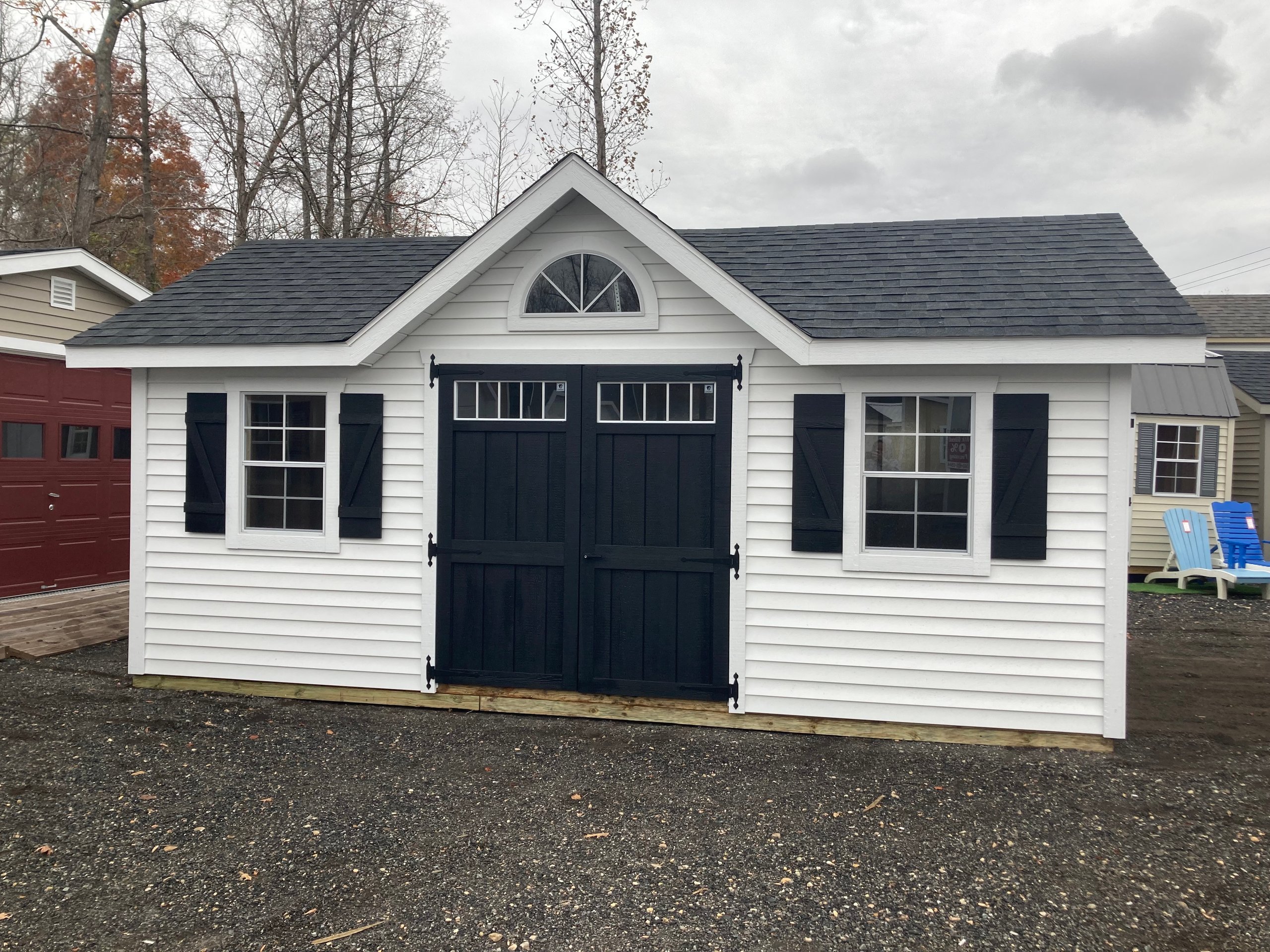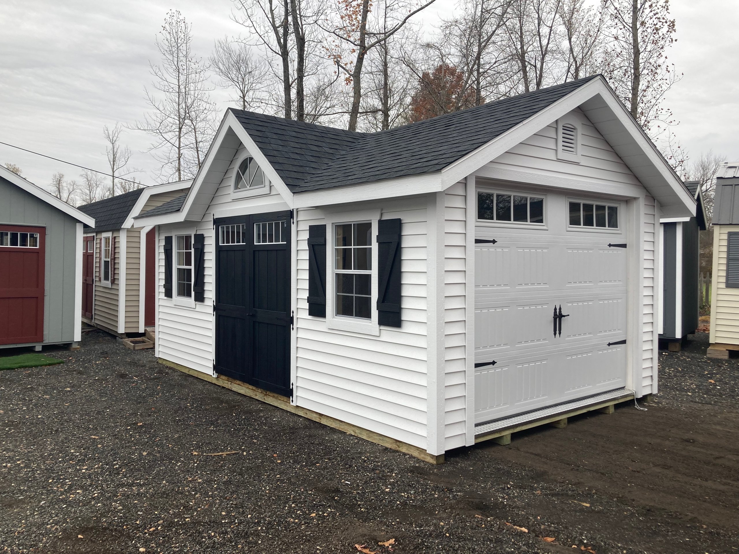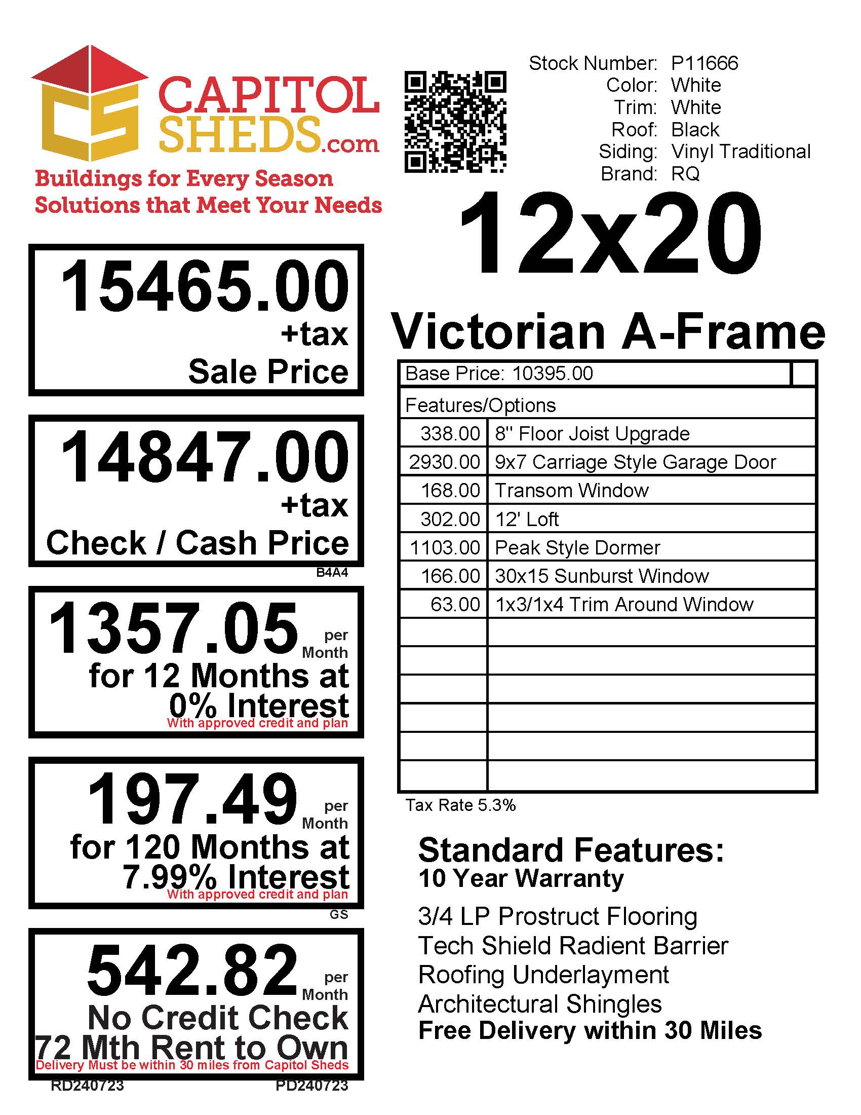 Elevate your property with the Victorian A-Frame Garage – a 12×20 marvel in pristine White vinyl. Amish-crafted with a Black roof, architectural shingles, and LP Tech Shield for durability. This garage boasts a stylish 9×7 carriage-style door, transom window, and a stunning 30×15 sunburst window. The 12′ loft and peak style dormer add functional elegance, while the upgraded LP Prostruct flooring and pressure-treated 8-inch-on-center floor joists ensure longevity. Immerse your space in natural light through two windows adorned with meticulous 1×3/1×4 trim. Unleash sophistication and utility in this iconic Victorian-inspired masterpiece.