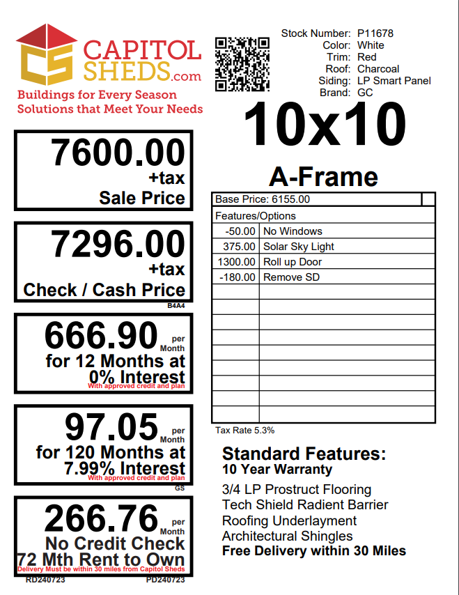 Introducing the Traditional A-Frame -A masterpiece of craftmanship by the Amish artisans. This 10×10 A-Frame is built to endure, offering exceptional quality and functionality for all your storage needs. The A-Frame siding provides superior durability while exuding timeless elegance in White , complemented by pristine Red. The Charcoal colored dimensional shingles protect your belongings from the elements ensuring long-lasting reliability. With two doors for easy access, the interior boasts 2×4 stud wall framing, 2×4 rafter roof framing, and LP Tech Shield roof sheeting for added strength. The LP Prostruct Flooring, coupled with pressure-treated 2×4 floor joists ensures stability and longevity. invest in the A-Frame for a storage solution that’s built to last.