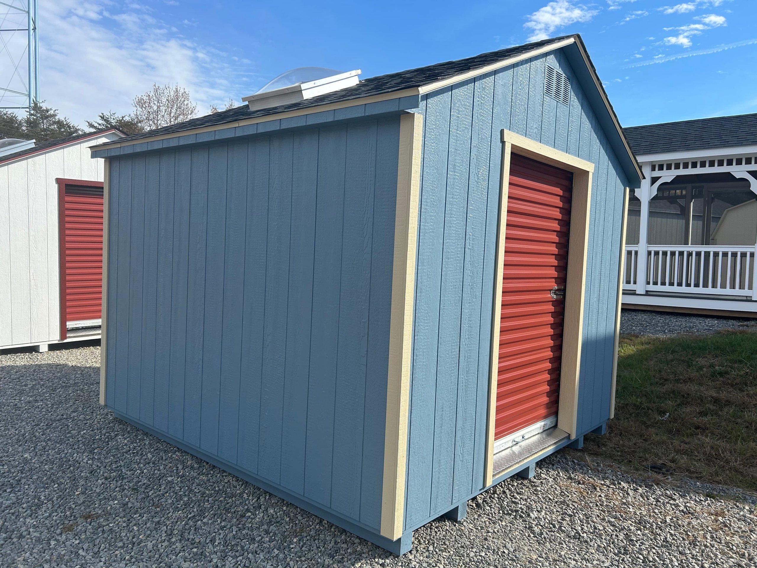 Unveil the epitome of storage elegance with our A-Frame 10×10 Shed, meticulously crafted by Amish artisans. Dressed in captivating Blue LP Smart Siding and adorned with Beige trim, this shed is a visual masterpiece. The Charcoal roof, crowned with Shingles and Roof Felt underlayment, ensures enduring protection. Revel in the ambiance of natural light through the skylight and access your belongings effortlessly with the Roll-up door. Engineered with precision using 2×4 studs, LP Tech Shield roofing, and Pressure Treated 2×4 Joists, this shed is a sanctuary of durability. Elevate your space further with the included Red Roll Up Door, a vibrant touch to timeless craftsmanship.