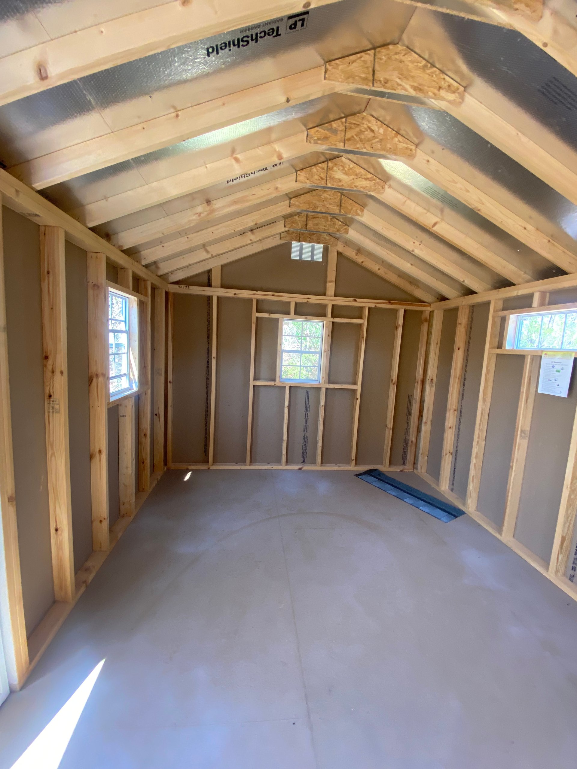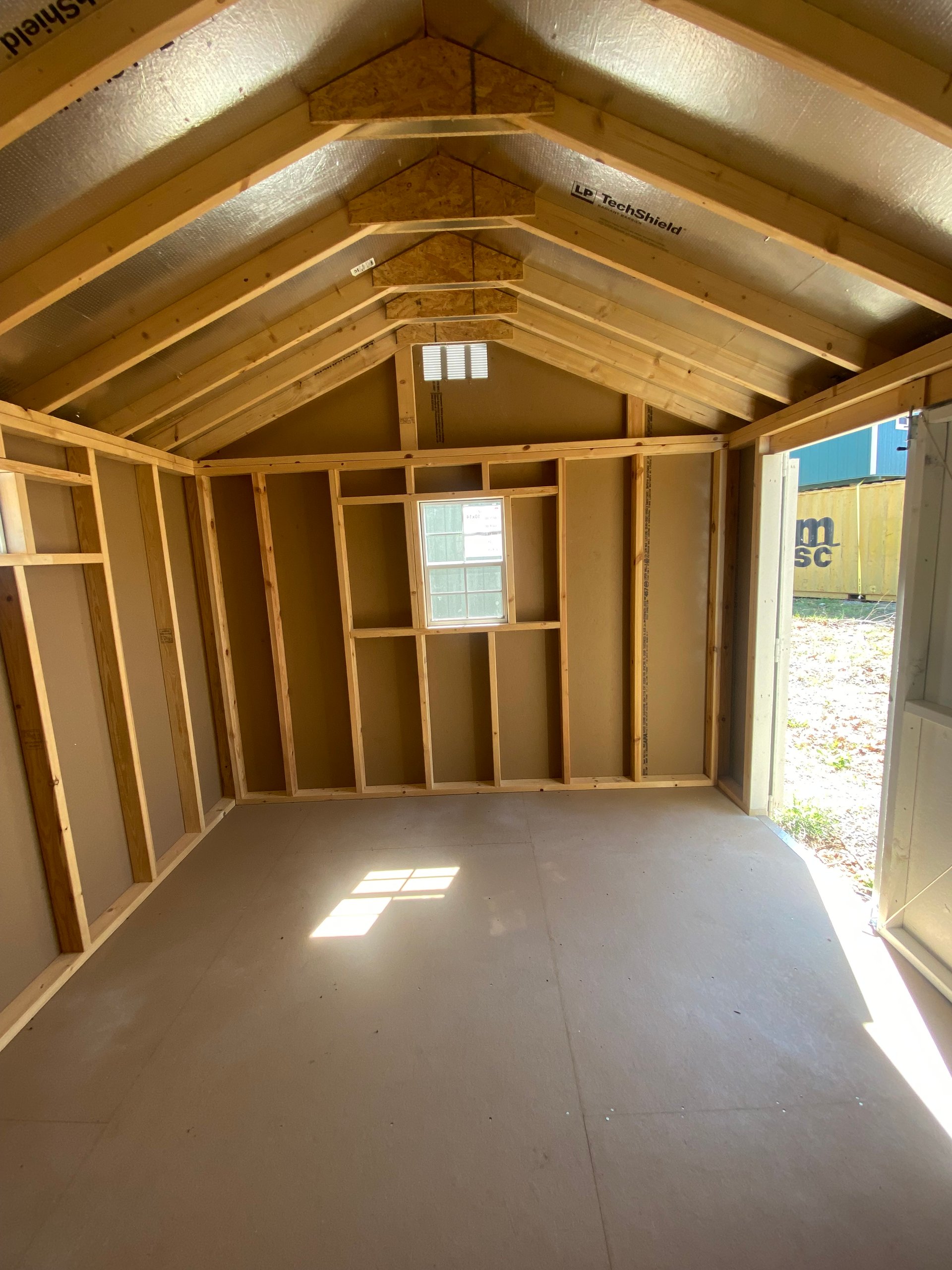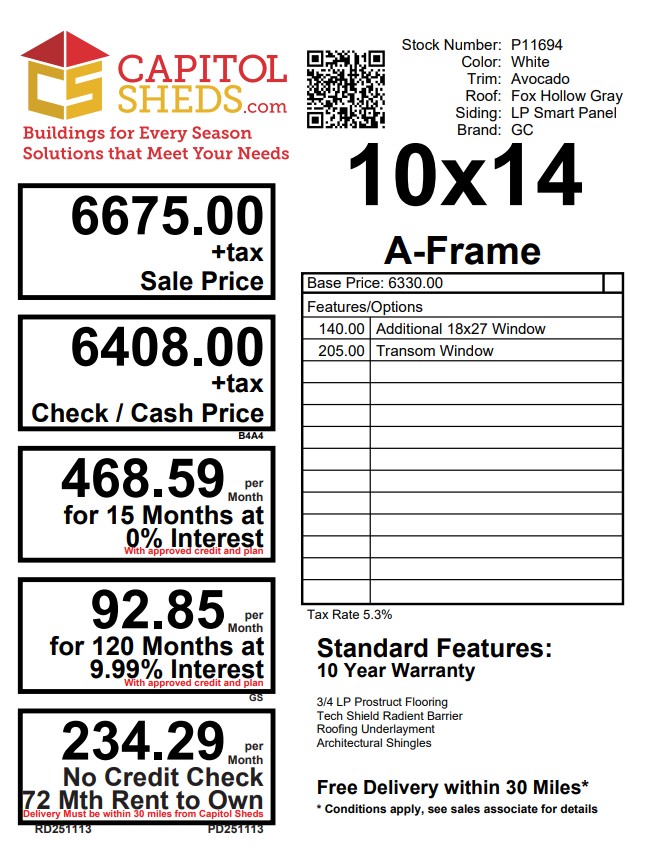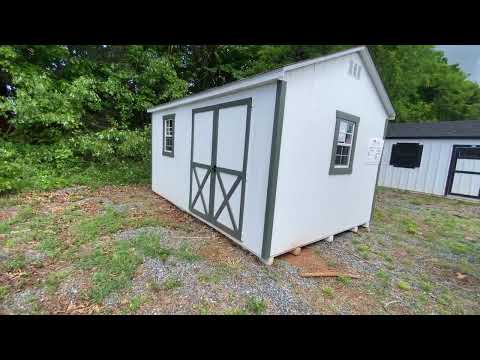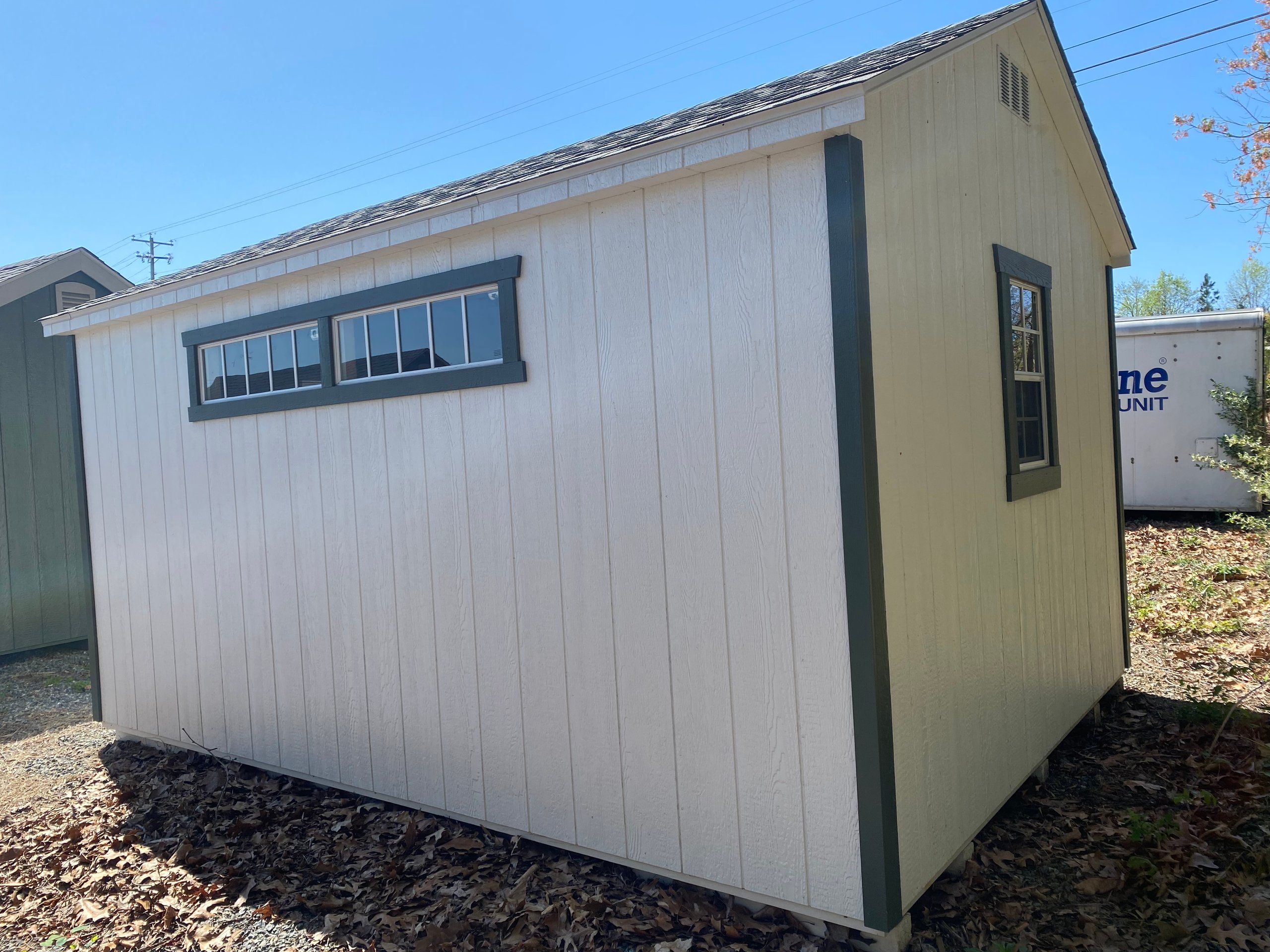 Style Name: Shed Size: 10×14 Siding: LP Smart Panel Main Color: White Trim Color: Avocado Roof Color: Fox Hollow Gray Roofing: Dimensional Shingles Roofing Underlayment: Roof Felt Wall Framing: 2×4 studs 16 inches on center Roof Framing: 2×4 rafters 16 inches on center Roof Sheeting: LP Tech Shield Upgraded Features: Extra Window