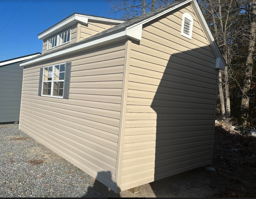 Introducing the Traditional A-Frame -A masterpiece of craftmanship by the Amish artisans. This 8×16 A-Frame is built to endure, offering exceptional quality and functionality for all your storage needs. The A-Frame siding provides superior durability while exuding timeless elegance in Sand Stone , complemented by pristine White. The Dual Gray colored dimensional shingles protect your belongings from the elements ensuring long-lasting reliability. With two doors for easy access, the interior boasts 2×4 stud wall framing, 2×4 rafter roof framing, and LP Tech Shield roof sheeting for added strength. The LP Prostruct Flooring, coupled with pressure-treated 2×4 floor joists ensures stability and longevity. invest in the A-Frame for a storage solution that’s built to last.