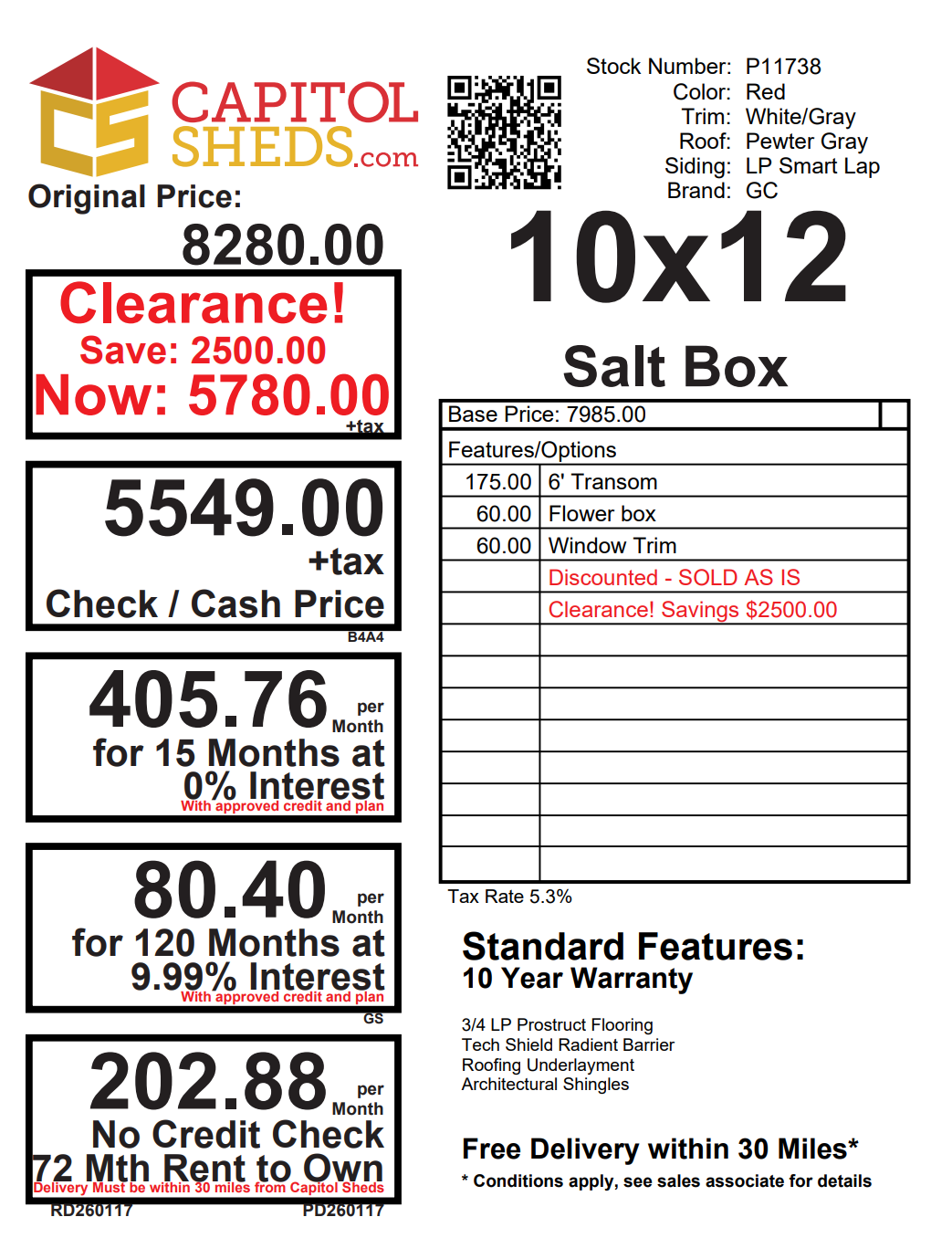 Reserve this building for a $500 deposit. Within 1 business day a representative will contact you to discuss delivery details and discounts you may qualify for such as cash/check, military/1st responder, etc.