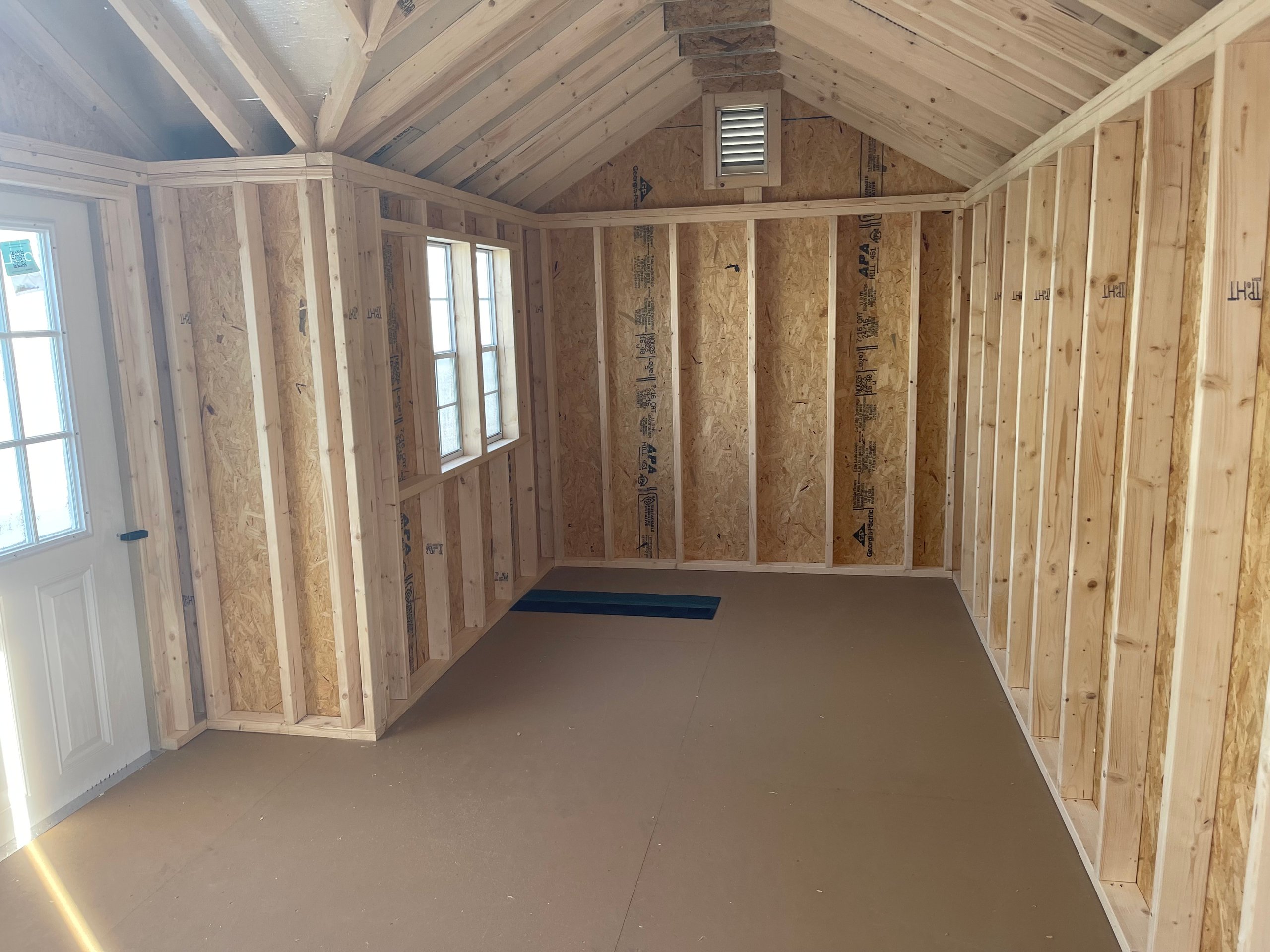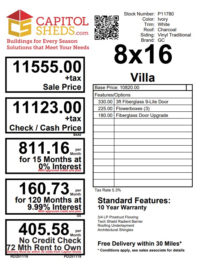 Discover the Villa, an elegant 8×16 retreat featuring pristine Ivory Vinyl siding and a sleek Charcoal roof. Enhanced with a 3′ Fiberglass 9 Lite Door, charming Flowerboxes, and a luxurious Fiberglass Door Upgrade. This stylish shed is built to impress.