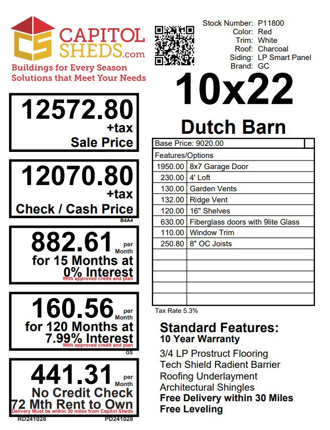 This 10×22 Hi Barn combines spacious design with a charming red and white color scheme, crafted with LP Smart Panel siding and durable charcoal architectural shingles. It features two windows and three doors, including an upgraded 8×7 garage door and fiberglass doors with elegant 9-lite glass. Inside, enjoy the utility of a 4-foot loft, 16-inch shelving, and reinforced 8-inch floor joists for heavy-duty storage. Enhanced ventilation is provided by garden vents and a ridge vent, maintaining airflow. Built with premium materials, including LP Tech Shield roof sheeting and pressure-treated floor joists, this barn is designed for strength and style.