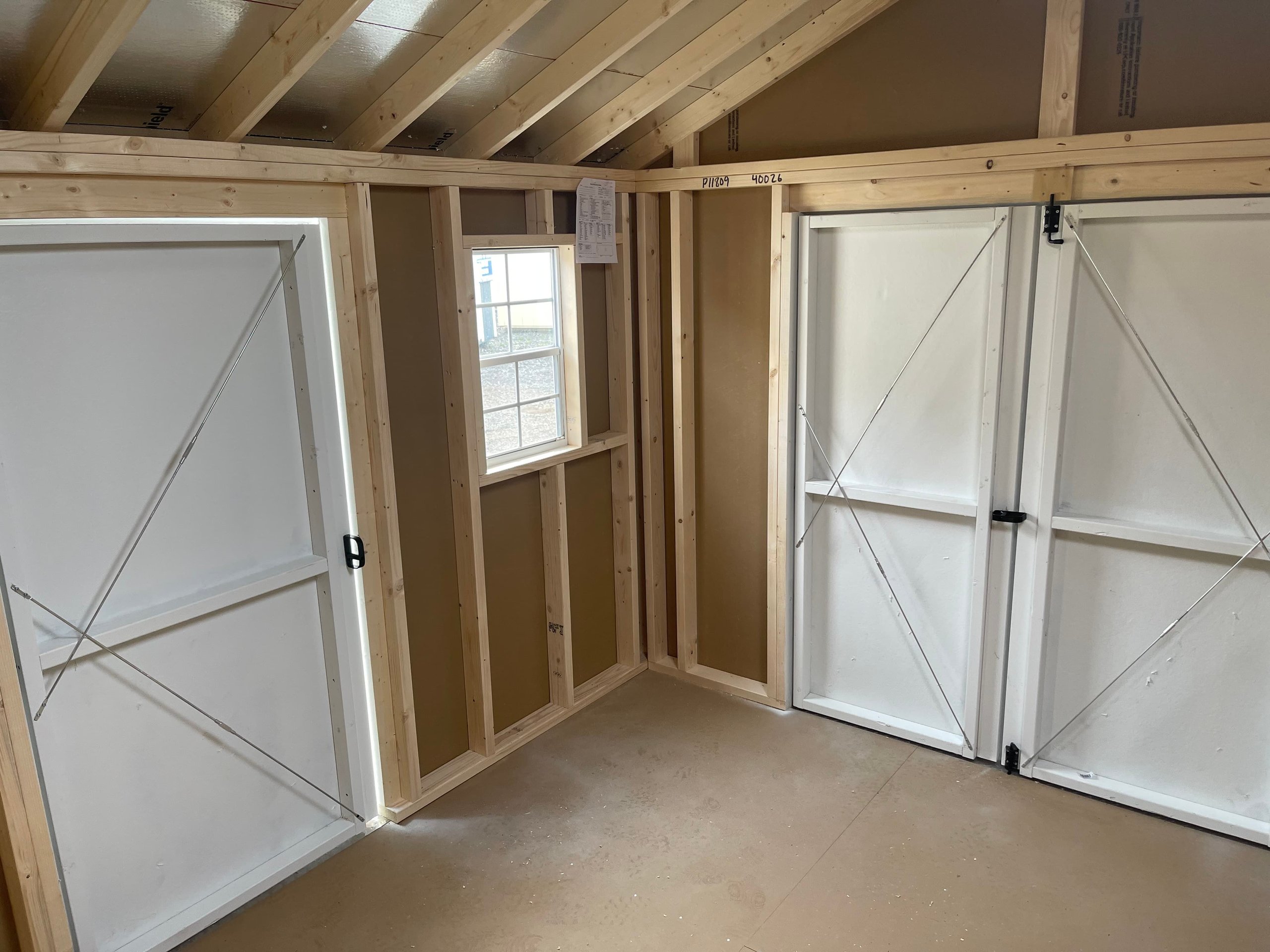 Style Name: A Frame Size: 10×12 Siding: LP Smartpanel Main Color: White Trim Color: Black Roof Color: Charcoal Roofing: Shingles Roofing Underlayment: Roof Felt Wall Framing: 2×4 studs 16 inches on center Roof Framing: 2×4 rafters 16 inches on center Roof Sheeting: LP Tech Shield Upgraded Features: Extra 3′ Door Skylight