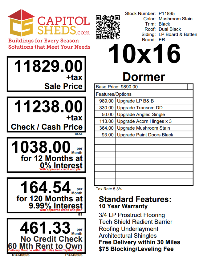Reserve this building for a $500 deposit. Within 1 business day a rep will contact you to discuss delivery and discounts you may qualify for such as cash/check, military/1st responder, etc.