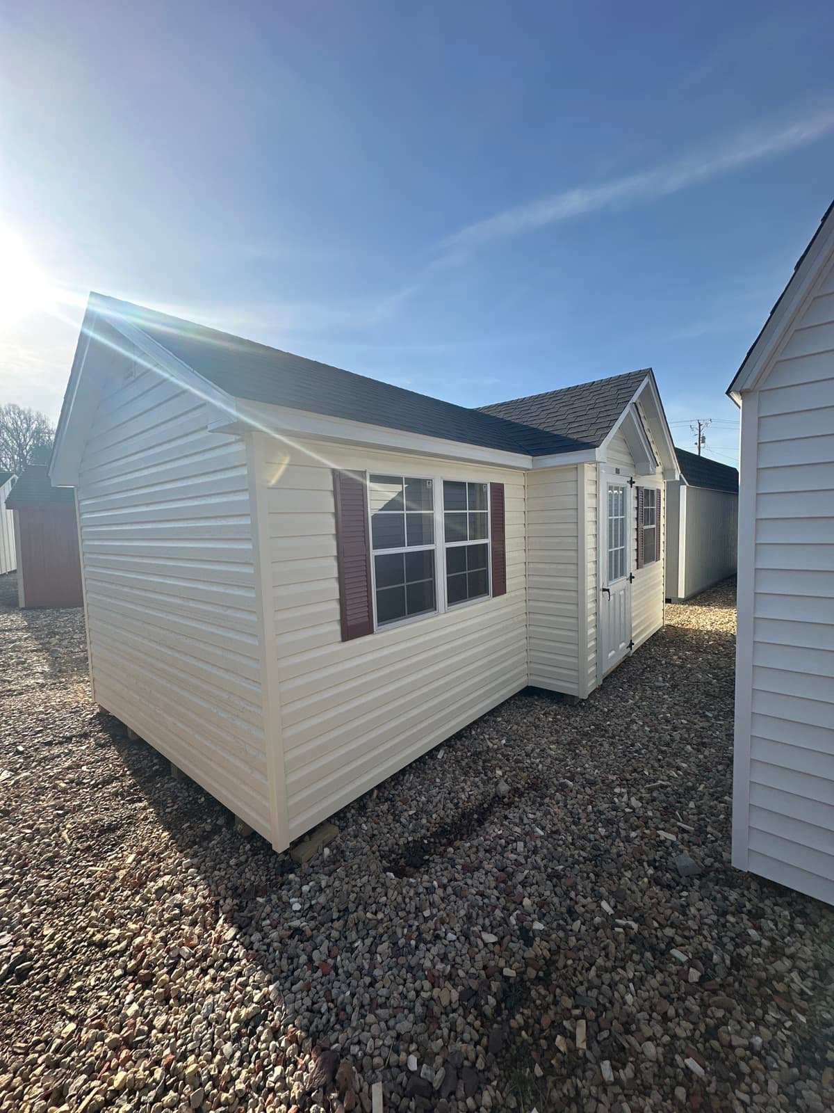 Introducing The Villa, a majestic 10×20 storage solution crafted with precision by Amish artisans. Encased in durable Vinyl Dutch Lap siding in serene Ivory with crisp White trim, it stands as a testament to both elegance and endurance. The Charcoal roof crowns this masterpiece, fortified by Roof Felt and Dimensional Shingles. With 3 windows to invite natural light and  Fiberglass Double Doors, accessing your belongings is effortless. Enhanced with LP Tech Shield roof sheeting and LP Prostruct Flooring supported by Pressure Treated 2×4 joists, this shed embodies unmatched quality. Elevate your space with The Villa – where craftsmanship meets functionality.