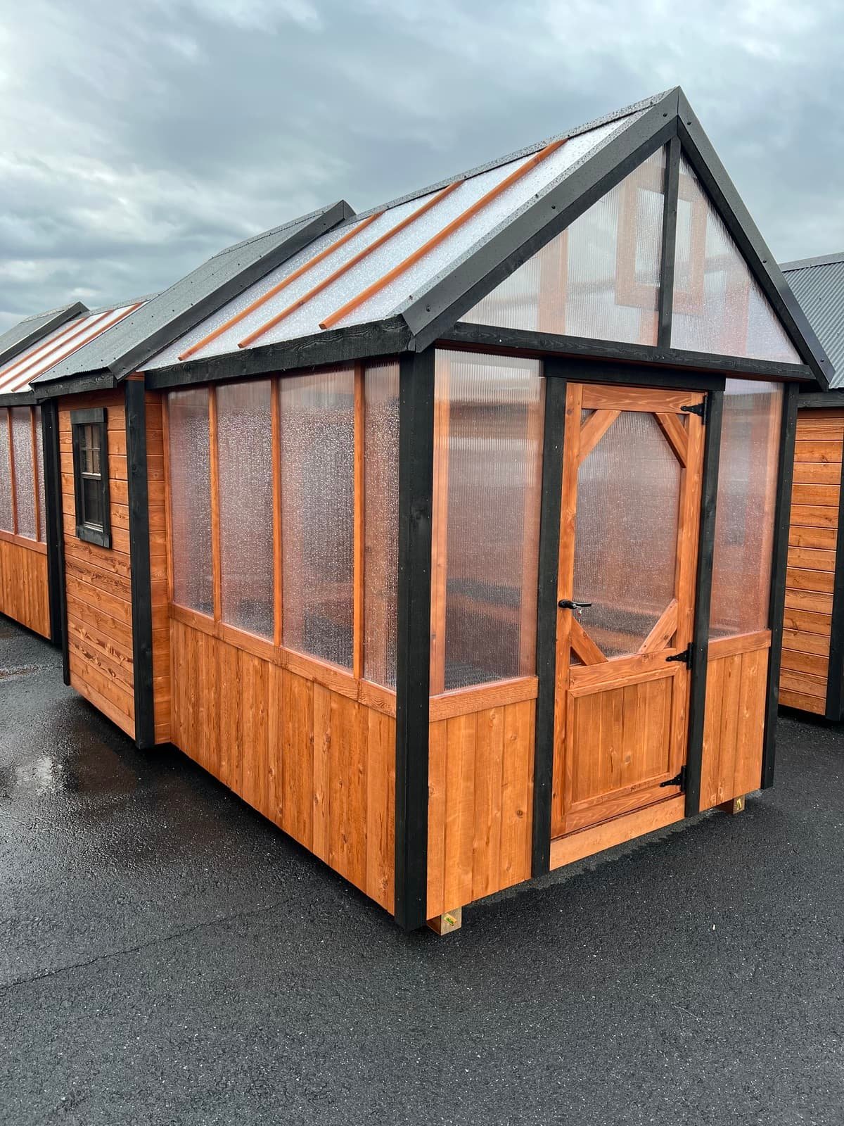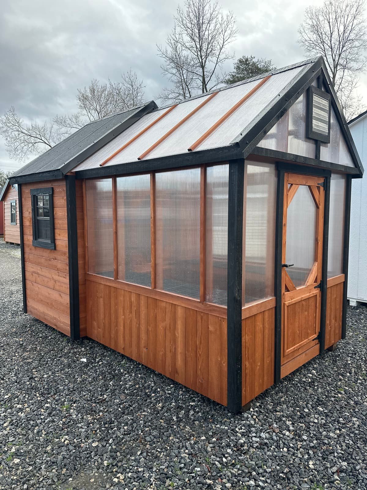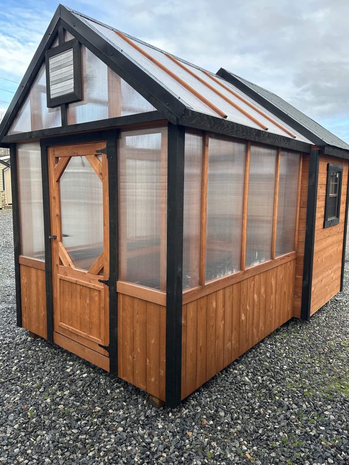 Style Name: Pergola Greenhouse Size: 8×12 Siding: Cedar Dutch Lap Main Color: Stain Trim Color: Black Number of Windows: 1 Number of Doors: 3 Wall Framing: 2×4 studs 16″ on center Roof Framing: 2×4 studs 16″  on center Included Upgrades: Exhaust Fan (2) 16″ Shelf