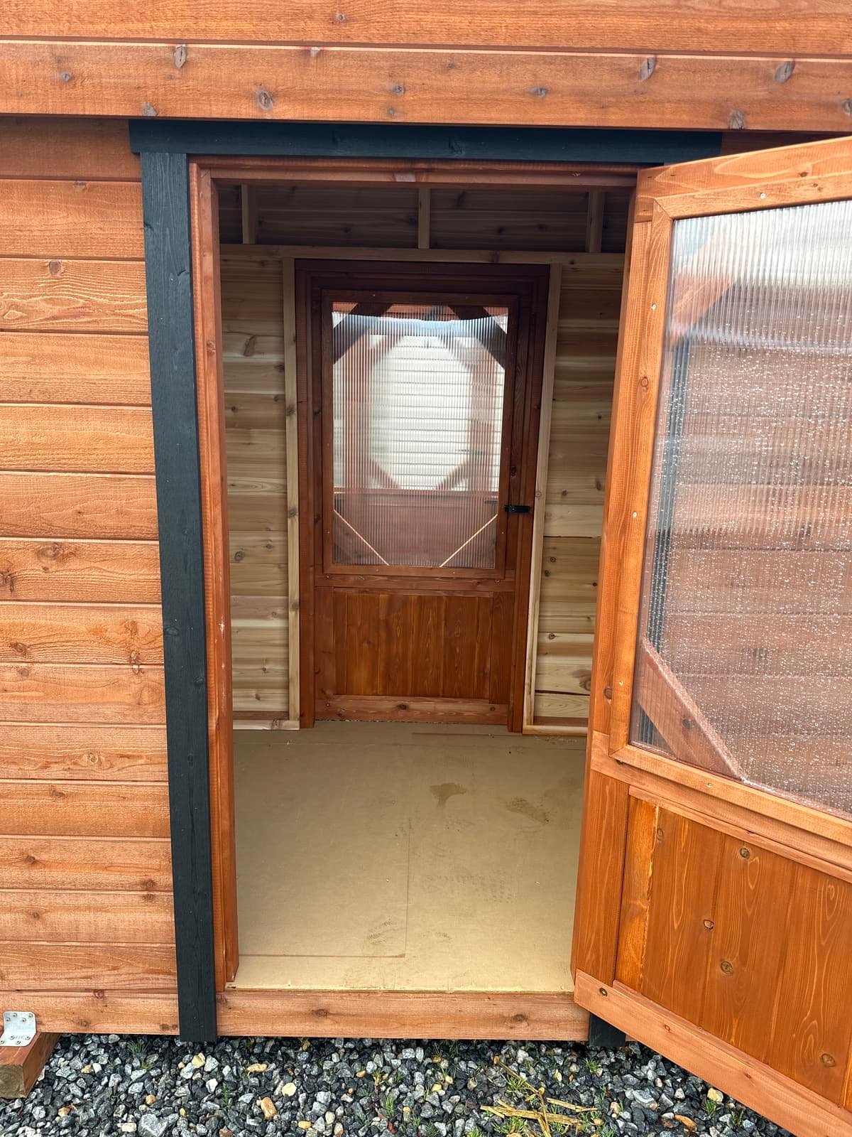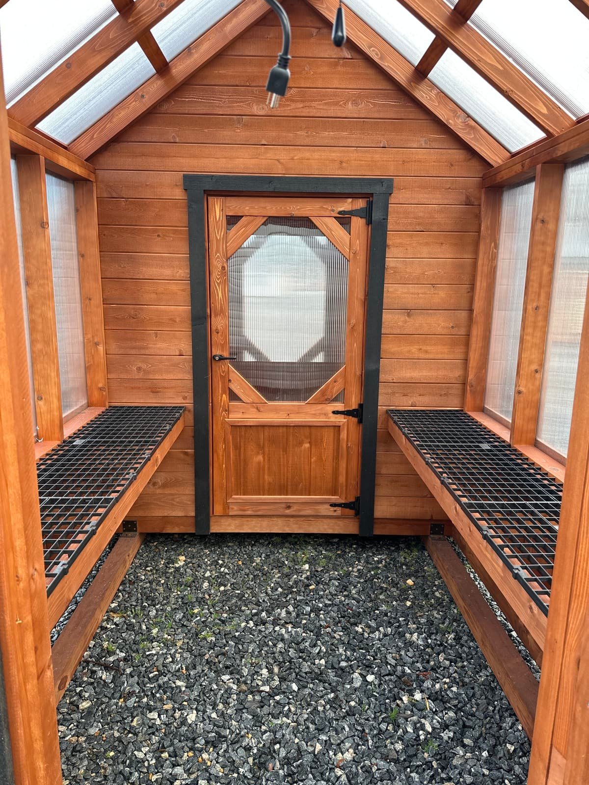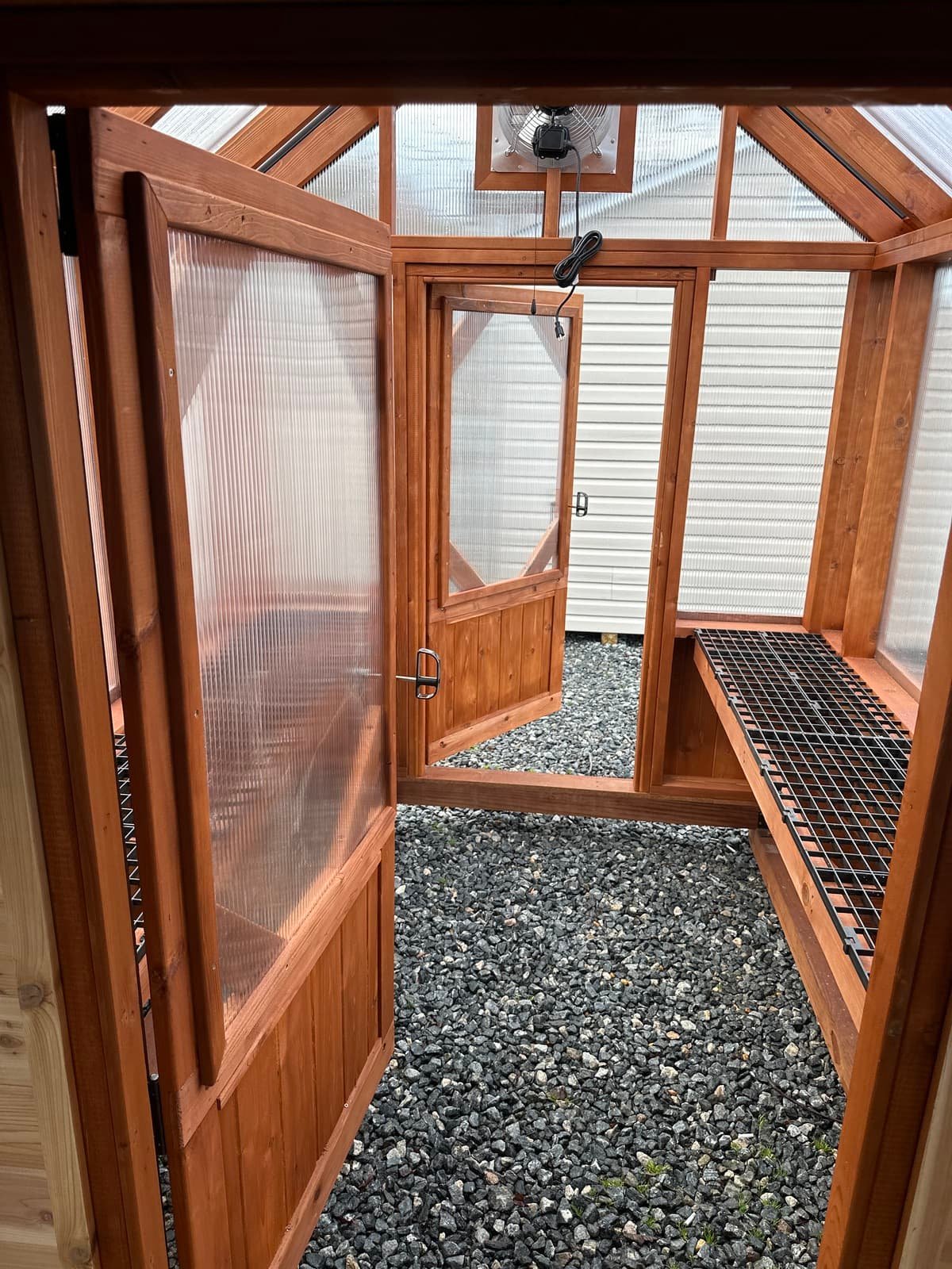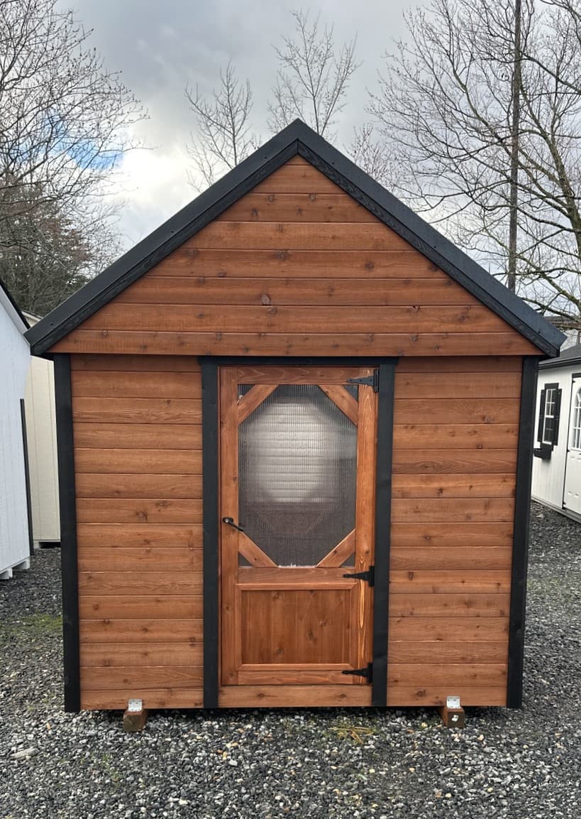 Style Name: Pergola Greenhouse Size: 8×12 Siding: Cedar Dutch Lap Main Color: Stain Trim Color: Black Number of Windows: 1 Number of Doors: 3 Wall Framing: 2×4 studs 16″ on center Roof Framing: 2×4 studs 16″  on center Included Upgrades: Exhaust Fan (2) 16″ Shelf