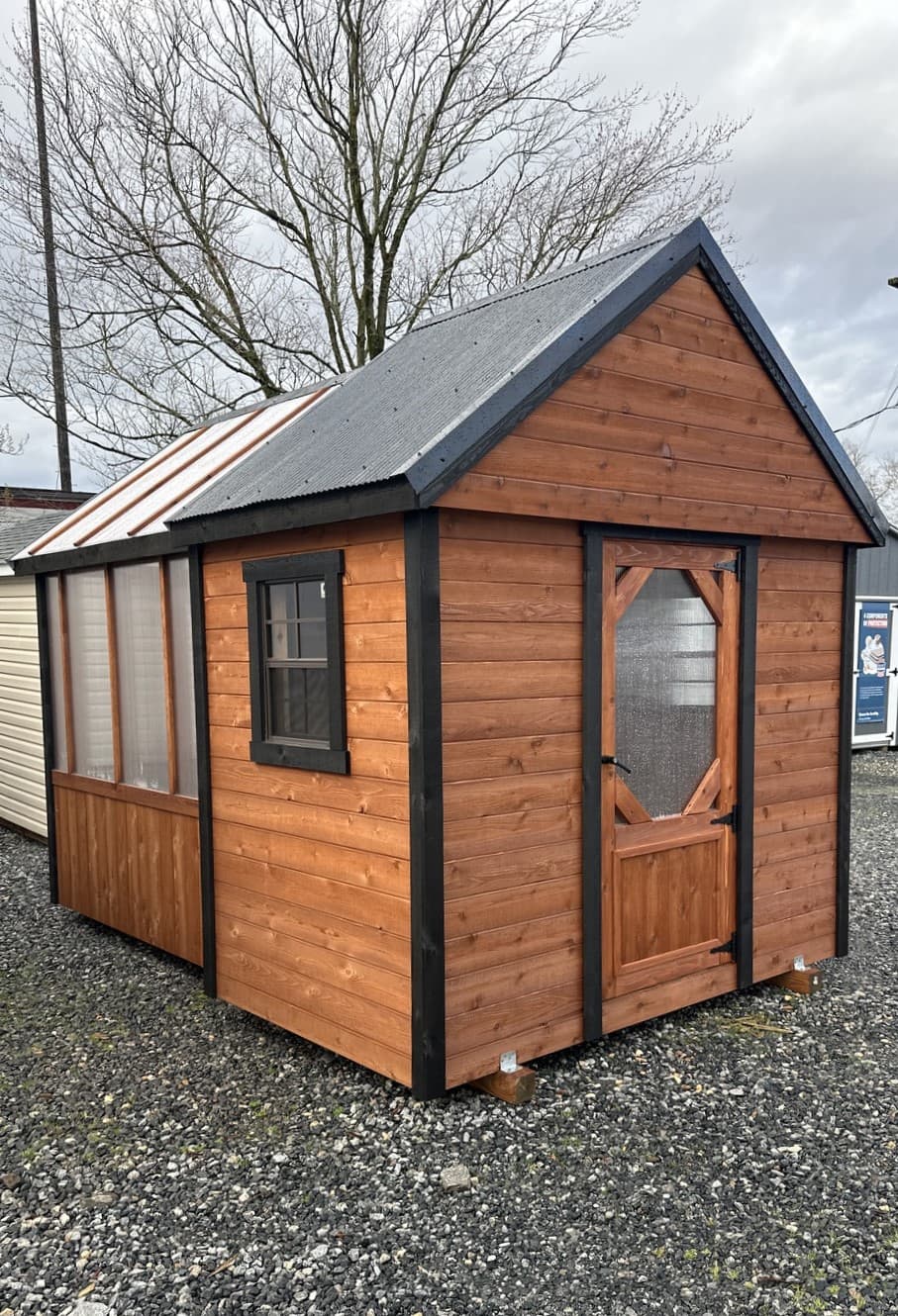 Introducing the Shed Greenhouse, a stunning addition to your outdoor space. Crafted by skilled Amish artisans, this 8×12 greenhouse boasts sturdy Cedar Dutch Lap siding, beautifully stained for timeless charm. With sleek black trim, it exudes elegance. with an exhaust fan for ventilation and two 16″ shelves for your plants. Elevate your backyard with this premium-quality greenhouse that blends style and practicality seamlessly. Embrace Amish craftsmanship and transform your outdoor oasis today.