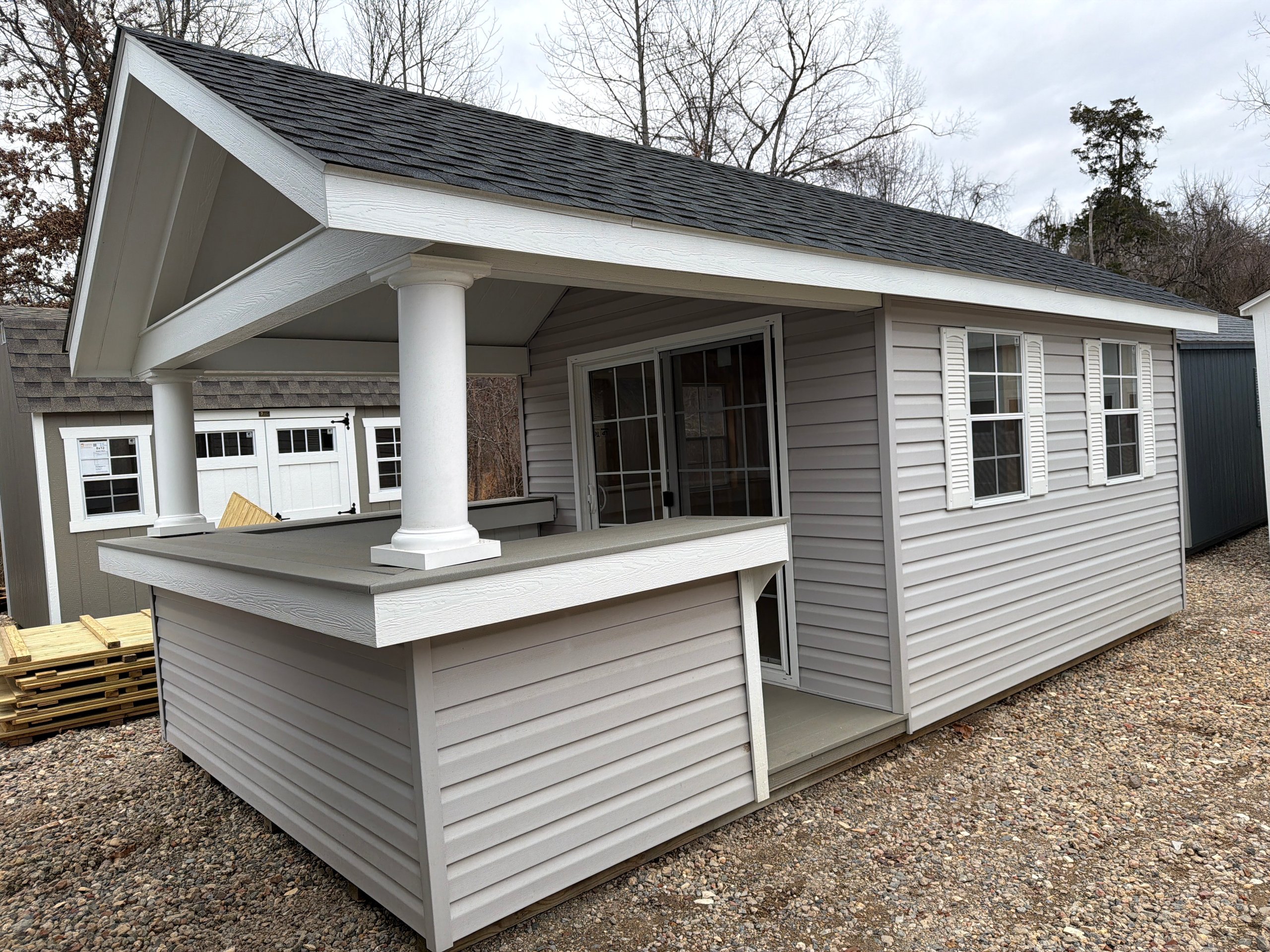 Style Name: A-Frame Pool House With Bar Size: 10×20 Siding: Vinyl Sided Main Color: Pewter Trim: White Roof Color: Charcoal Roof : Shingles Number of Windows: 4 8×10 Deck Bar Counter 6″ Higher Walls Upgrade Window Size Sliding Glass Screened Door Wall Framing: 2×4 Studs 16 inches on center Roof Framing: 2×4 rafters 16 inches on center Roof Sheeting: LP Tech Shield Flooring: LP Prostruct Flooring Floor Joists: Pressure Treated 2×4 Joists 16 inches on center Included Upgrades: 8×10 Deck, Bar Counter, Additional Window, Sliding Glass Door, Larger Windows