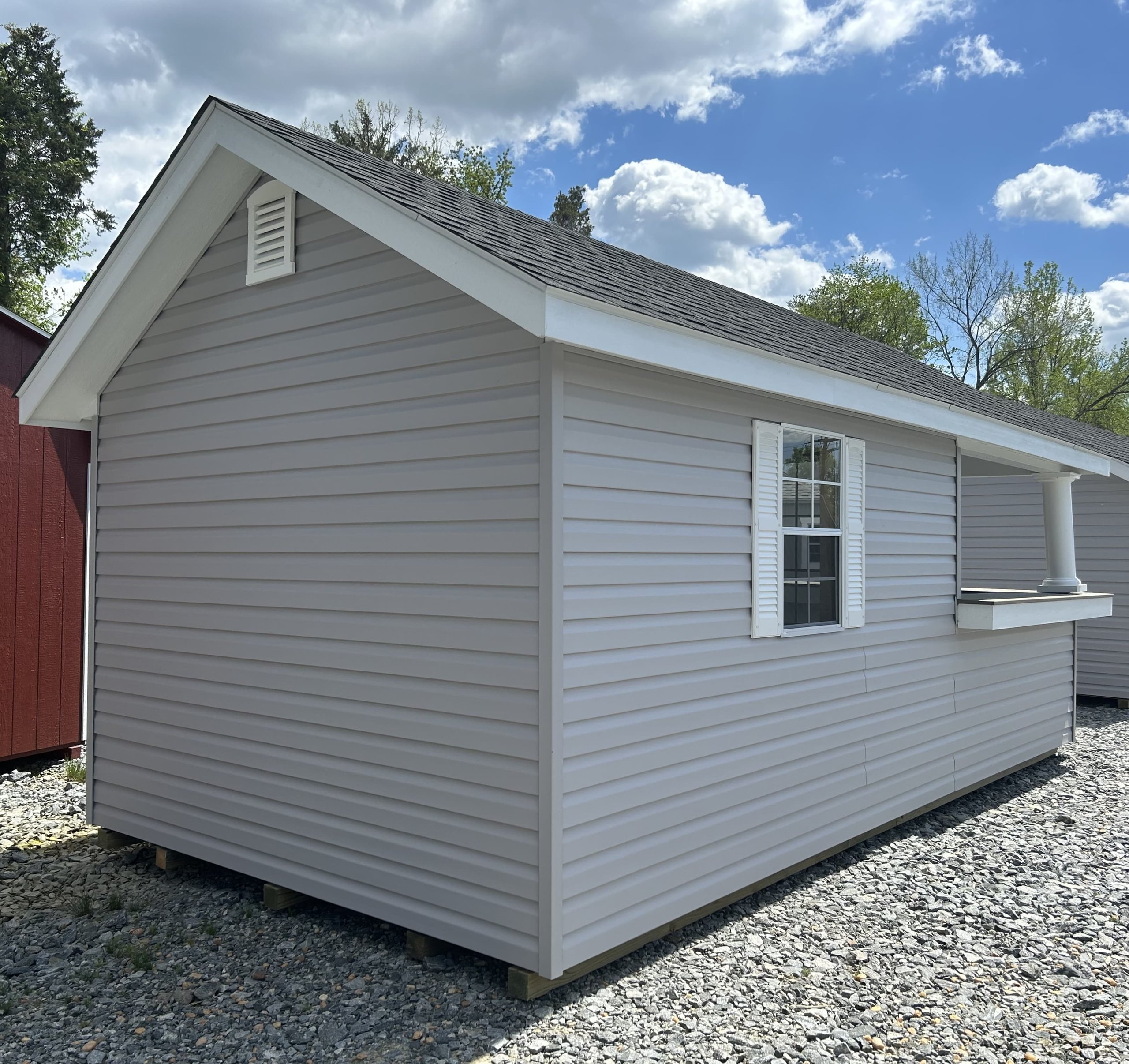 This 10×20 A-Frame Pool House with Bar is the ultimate backyard upgrade, combining functionality with resort-style flair. Featuring Pewter vinyl siding with crisp white trim and a charcoal shingle roof, it’s built with 2×4 studs and rafters 16″ on center, LP Tech Shield sheathing, and LP Prostruct flooring over pressure-treated joists. Enjoy an 8×10 front deck, a built-in bar counter, upgraded larger windows, and a sliding glass screened door for seamless indoor-outdoor entertaining. With higher 6″ walls for added space and airflow, this pool house is perfect for lounging, hosting, or creating your personal retreat.