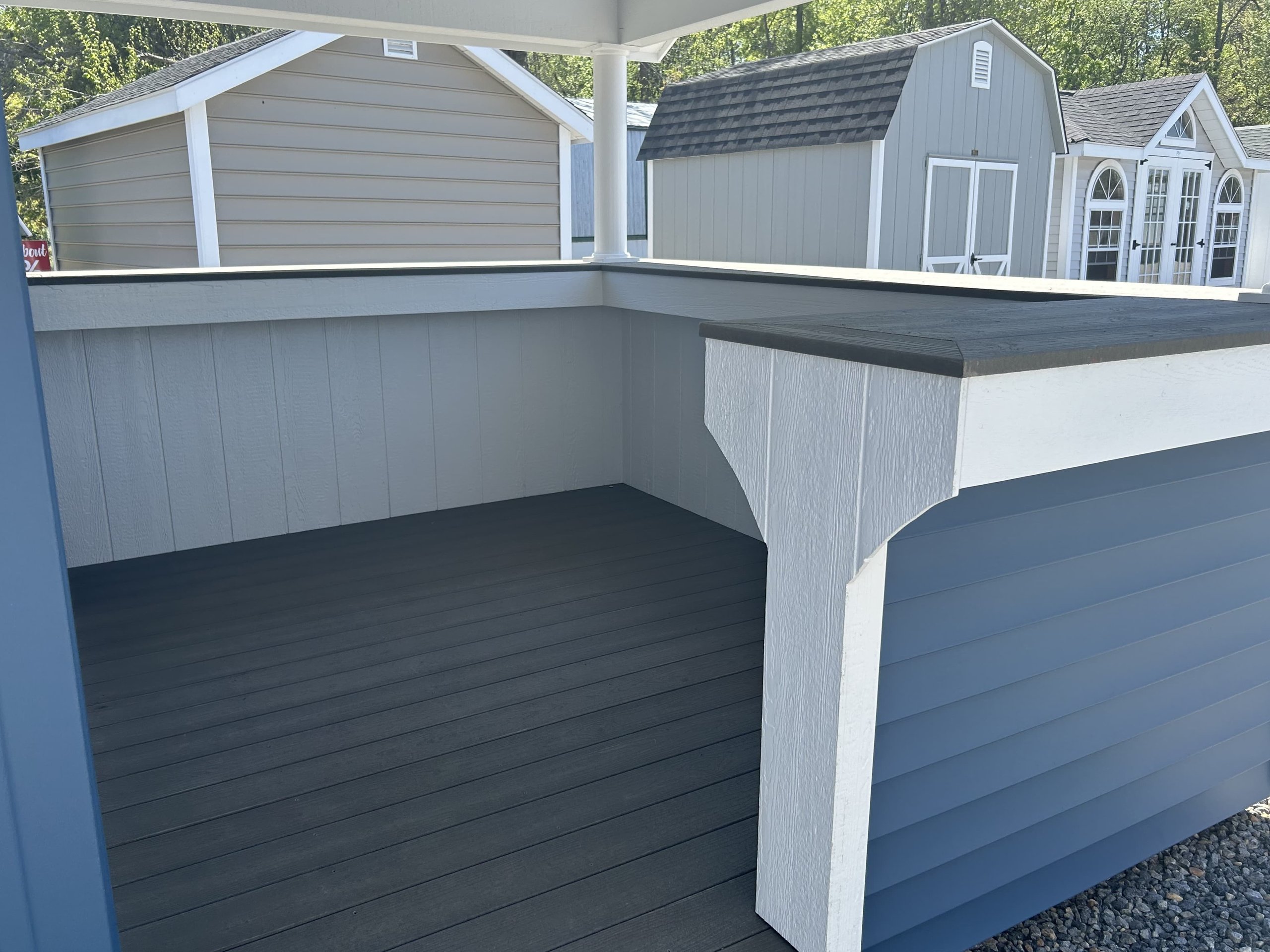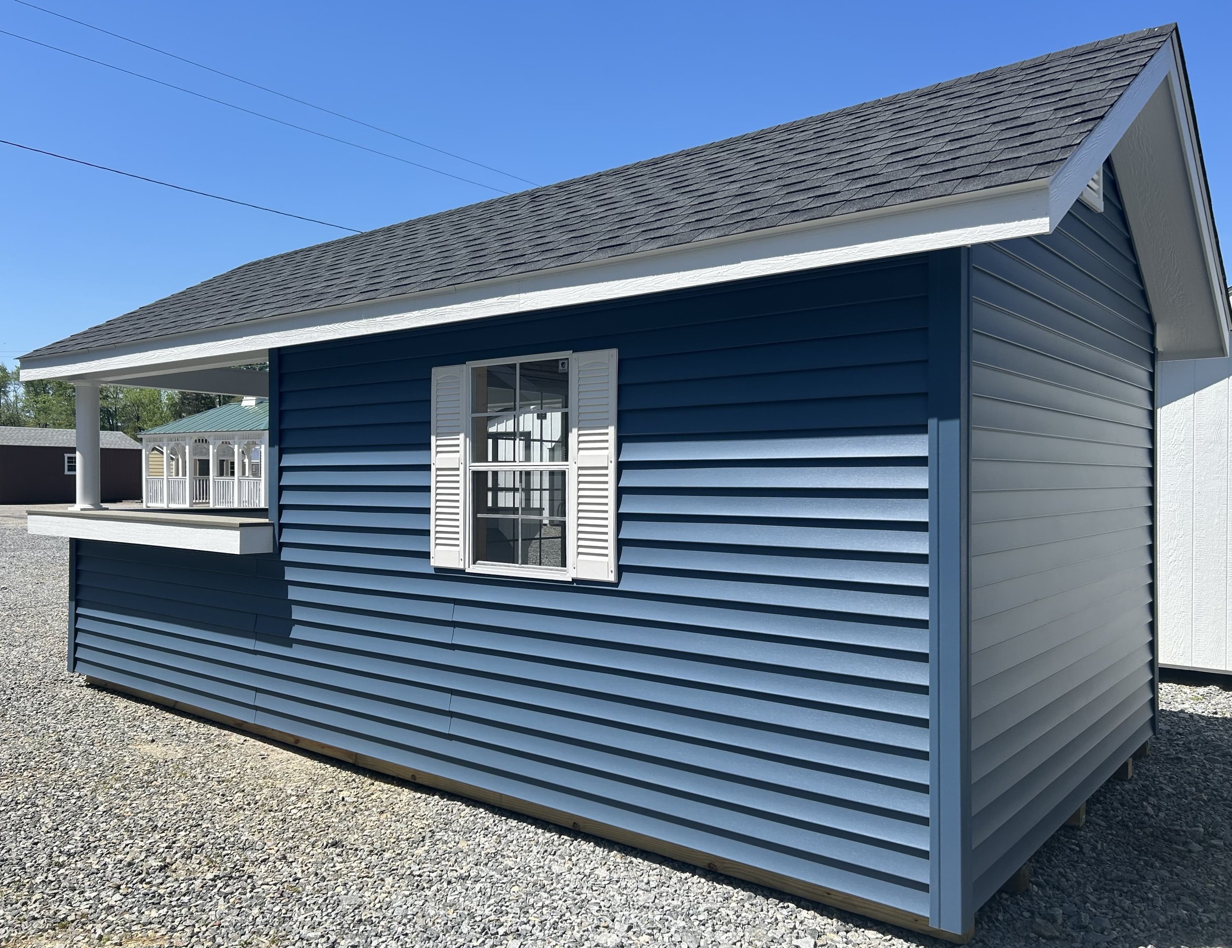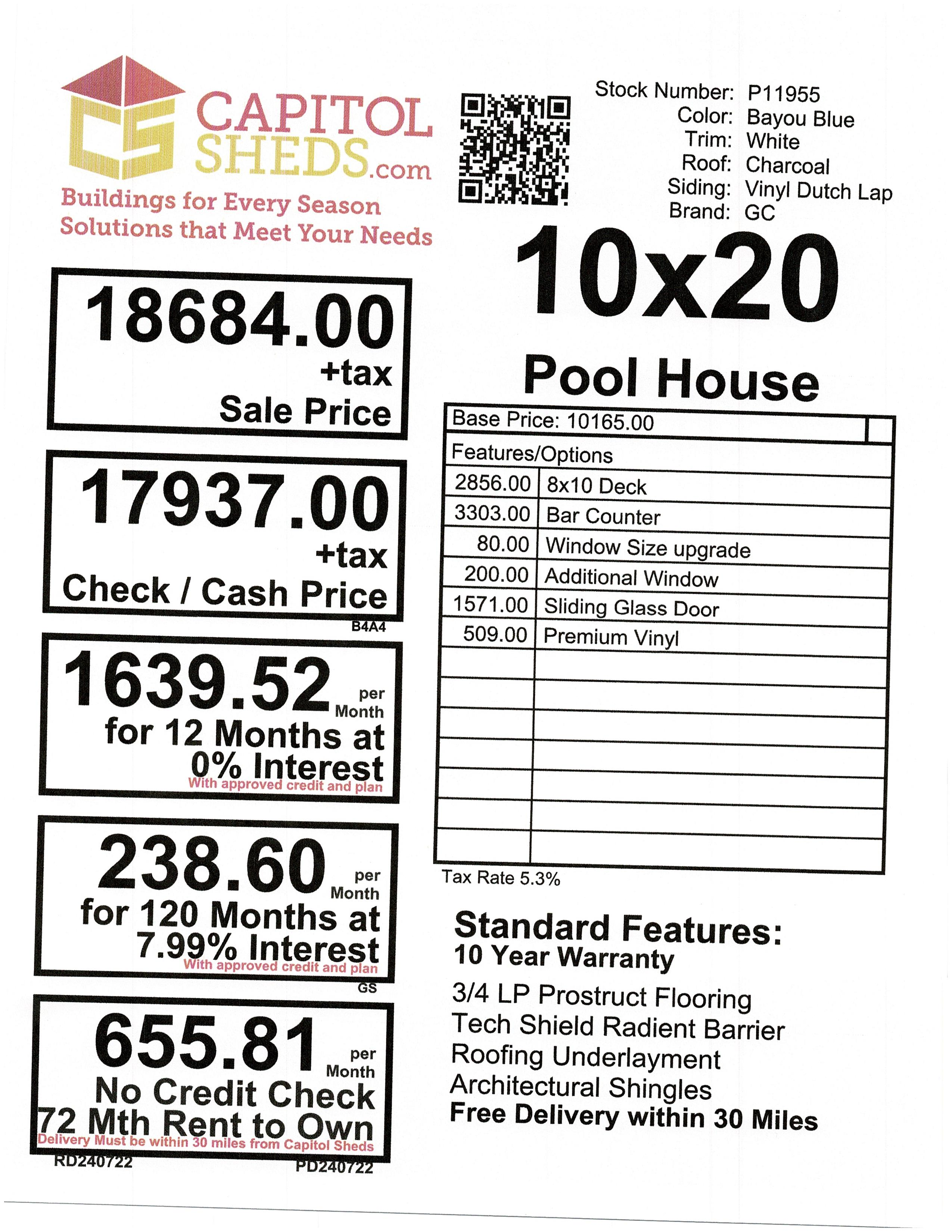 Style Name: A-Frame Pool House With Bar Size: 10×20 Siding: Vinyl Sided Main Color: Bayou Blue Trim: White Roof Color: Charcoal Roof : Shingles Number of Windows: 4 8×10 Deck Bar Counter 6″ Higher Walls Upgrade Window Size Sliding Glass Screened Door Wall Framing: 2×4 Studs 16 inches on center Roof Framing: 2×4 rafters 16 inches on center Roof Sheeting: LP Tech Shield Flooring: LP Prostruct Flooring Floor Joists: Pressure Treated 2×4 Joists 16 inches on center