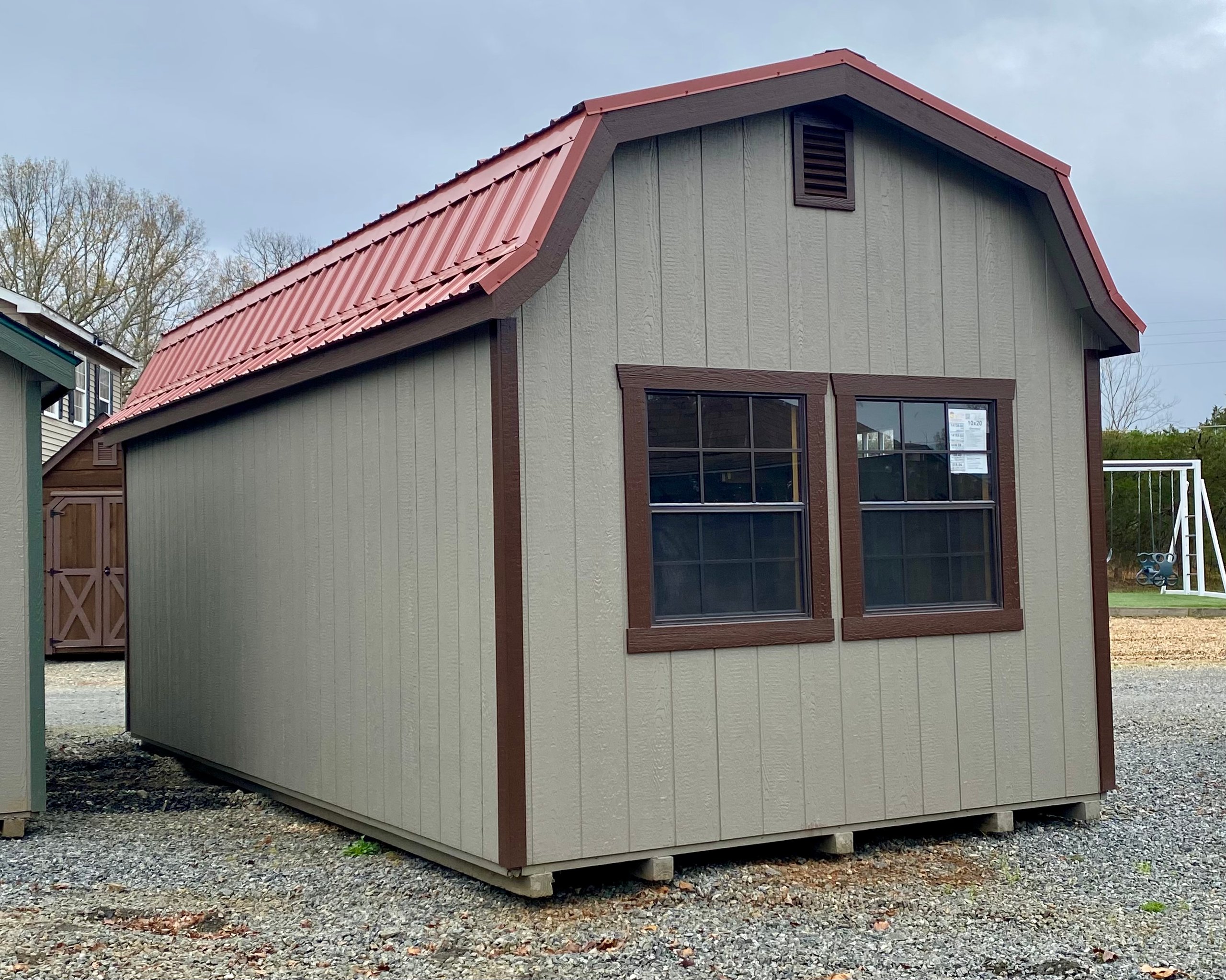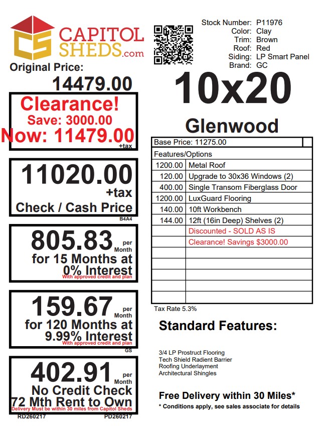 Discover spacious charm and functionality with our 10×20 Glenwood Barn. Crafted with LP Smart Panel siding in a warm Clay hue with Brown trim and topped with a bold Red metal roof, this Amish-built structure blends rustic style with dependable quality. Inside, 2×4 framing and LP Tech Shield roof sheeting provide strength and energy efficiency. Upgraded features include large 30×36 windows, transom-accented fiberglass doors, garden vents, a 10′ workbench, two 16″x12′ shelves, and durable LuxGuard flooring. With three doors and abundant natural light, this barn is perfect for storage, projects, or a creative retreat in your backyard.