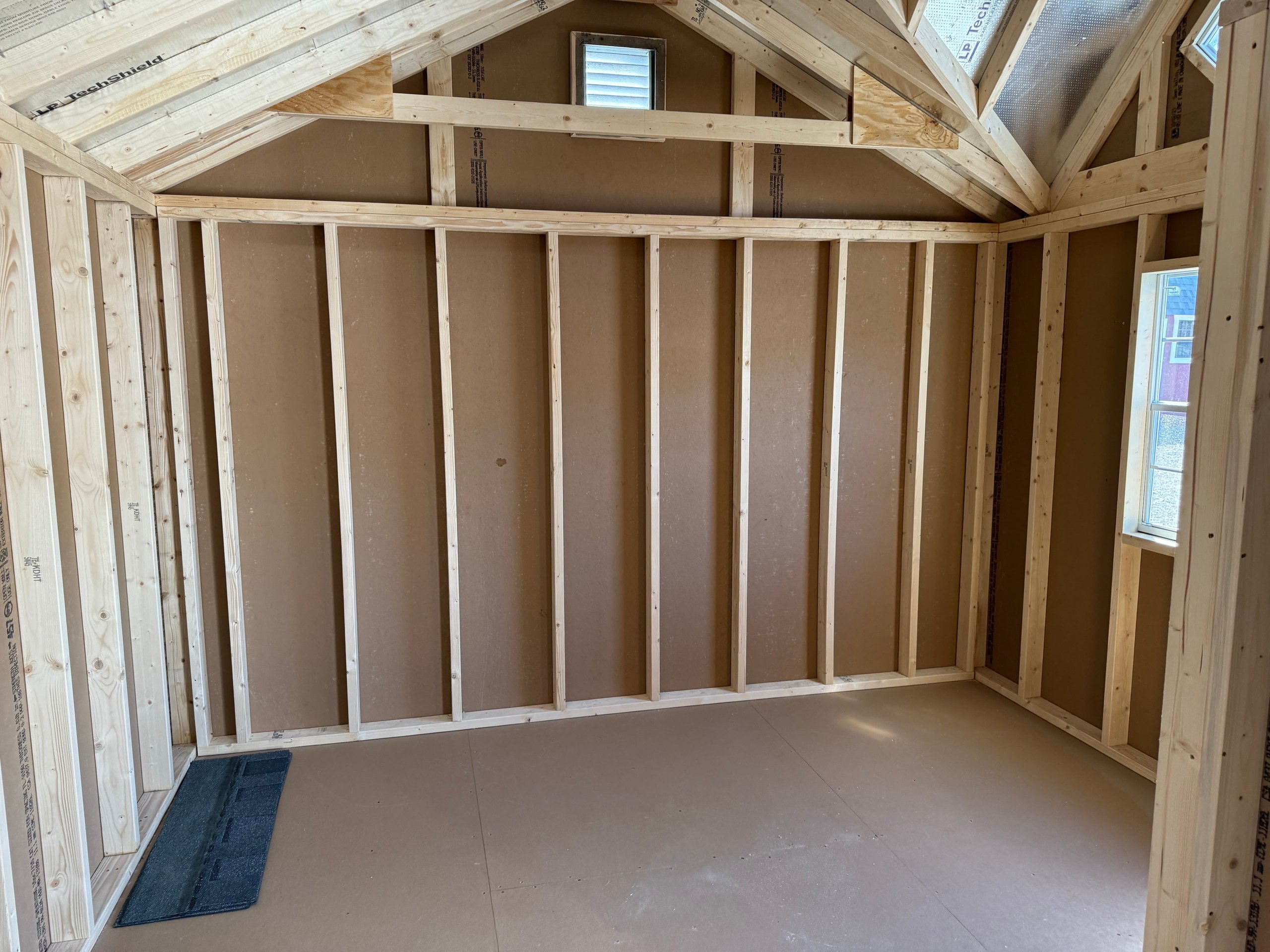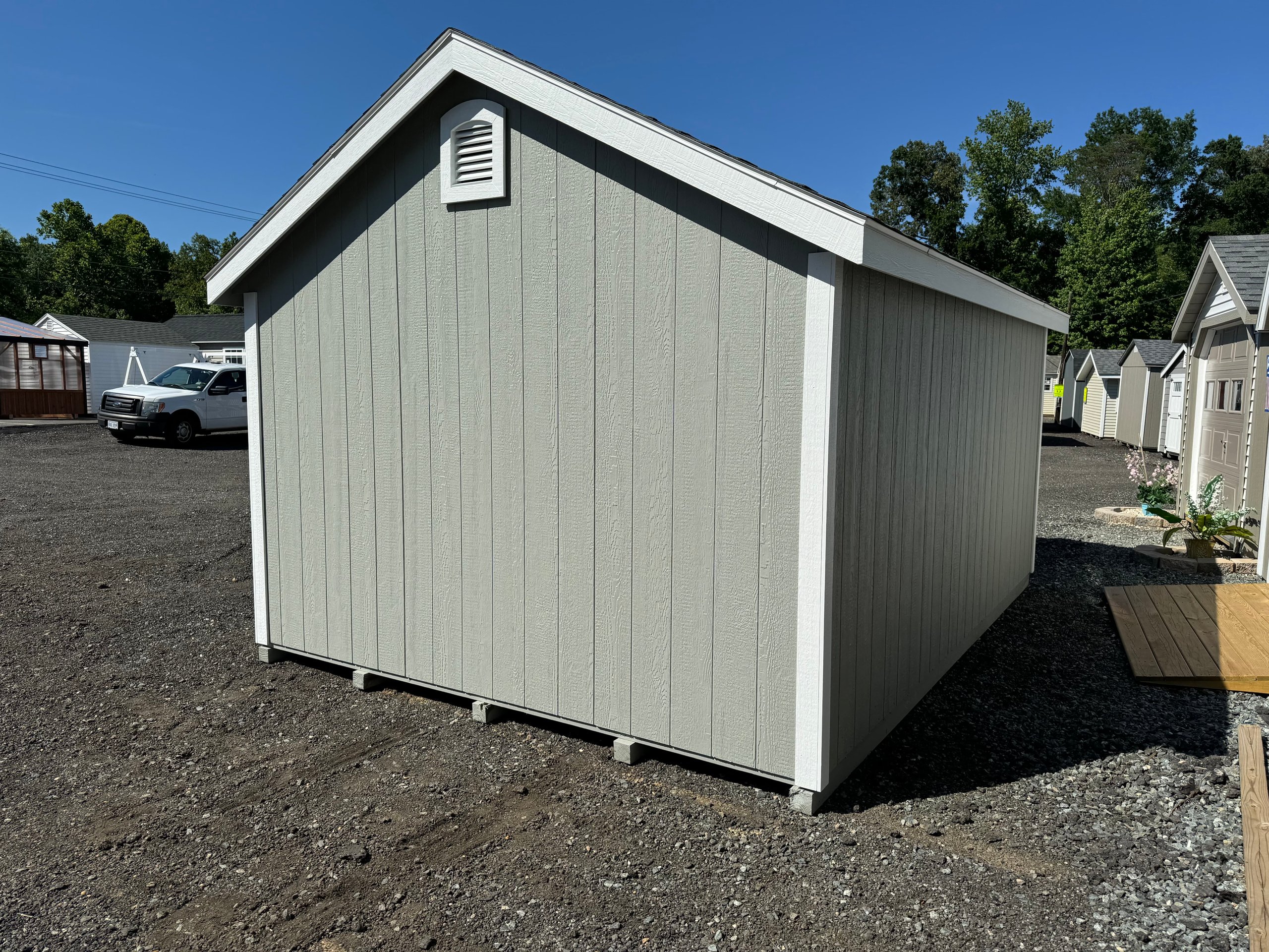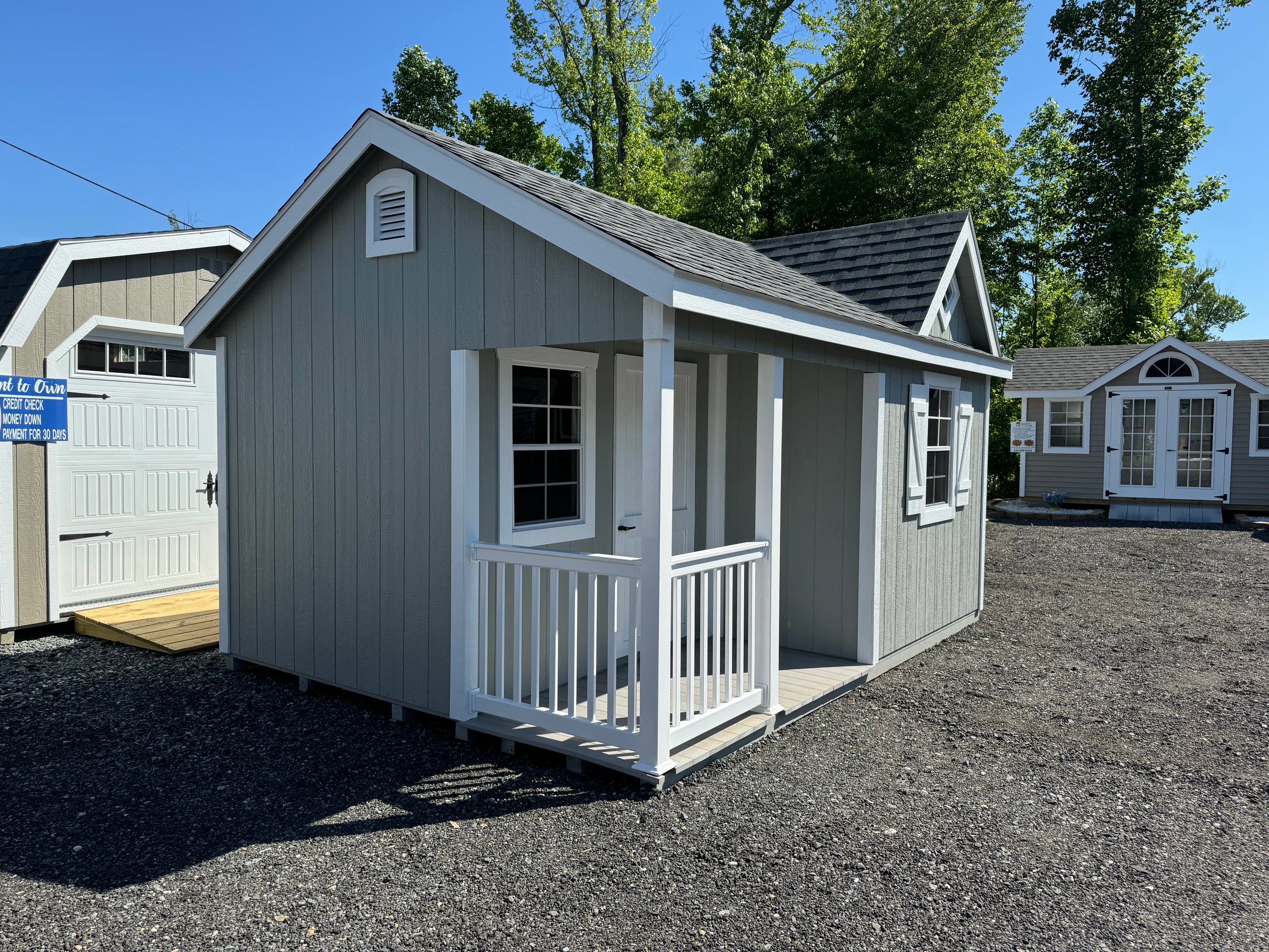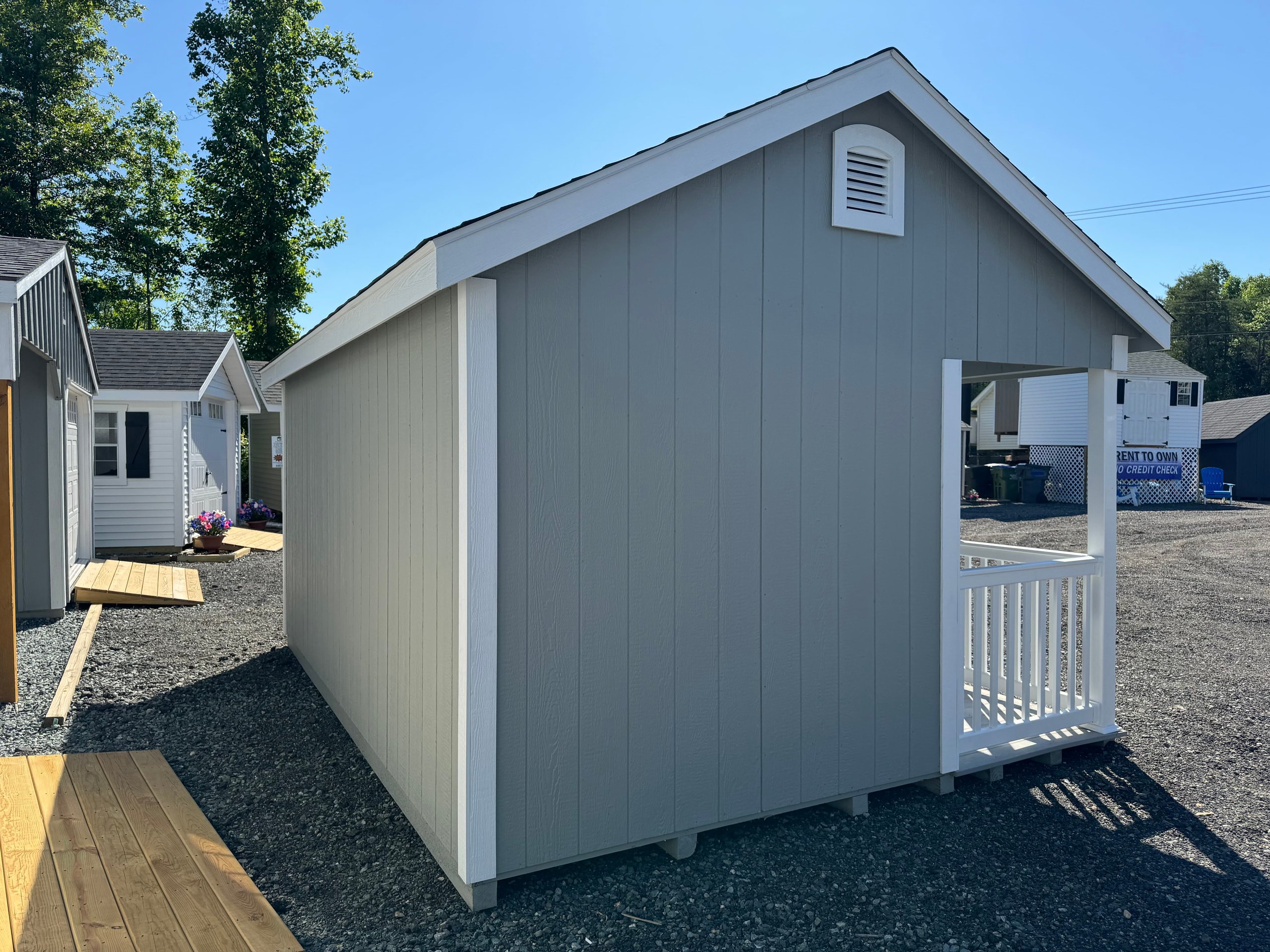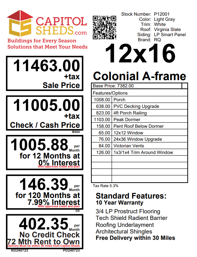Style Name: Colonial A-frame Size: 12×16 Siding: LP Smart Panel Main Color: Light Gray Trim Color: White Roof Color: Virginia Slate Roofing: Architectural Shingles Roofing Underlayment: Roof Felt Paper Number of Windows: 3 Number of Doors: 1 Wall Framing: 2×4 studs 16 inches on center Roof Framing: 2×4 rafters 16 inches on center Roof Sheeting: LP Tech Shield Flooring: LP T&G Prostruct Flooring Floor Joists: Pressure Treated 2×4 joists 16 inches on center   Included Upgrades: Porch with PVC Decking Porch Railing Peak Dormer Pent Roof Below Dormer 12×12 Diamond Window 24×36 Window Upgrade Victorian Vents Window Trim