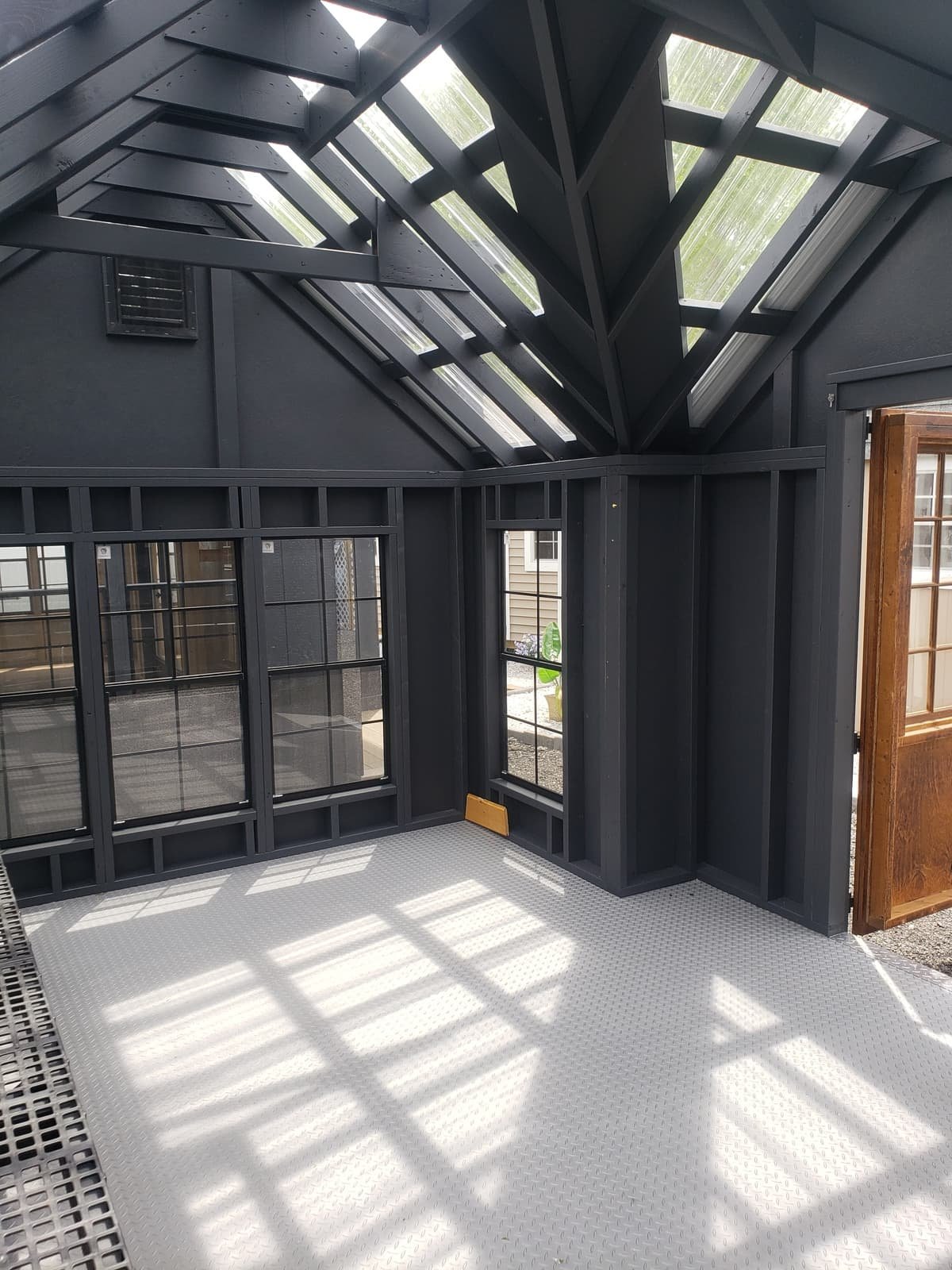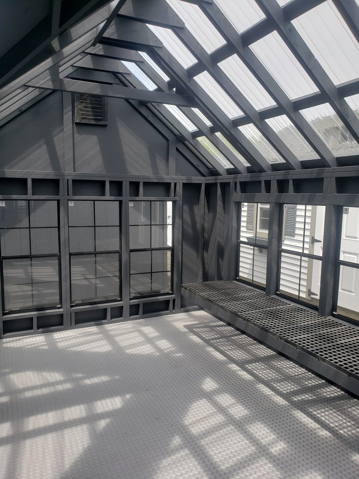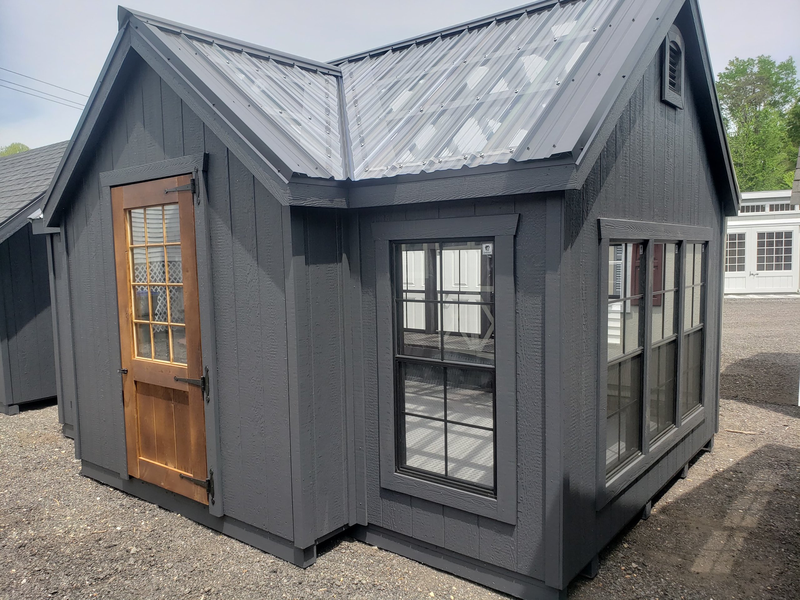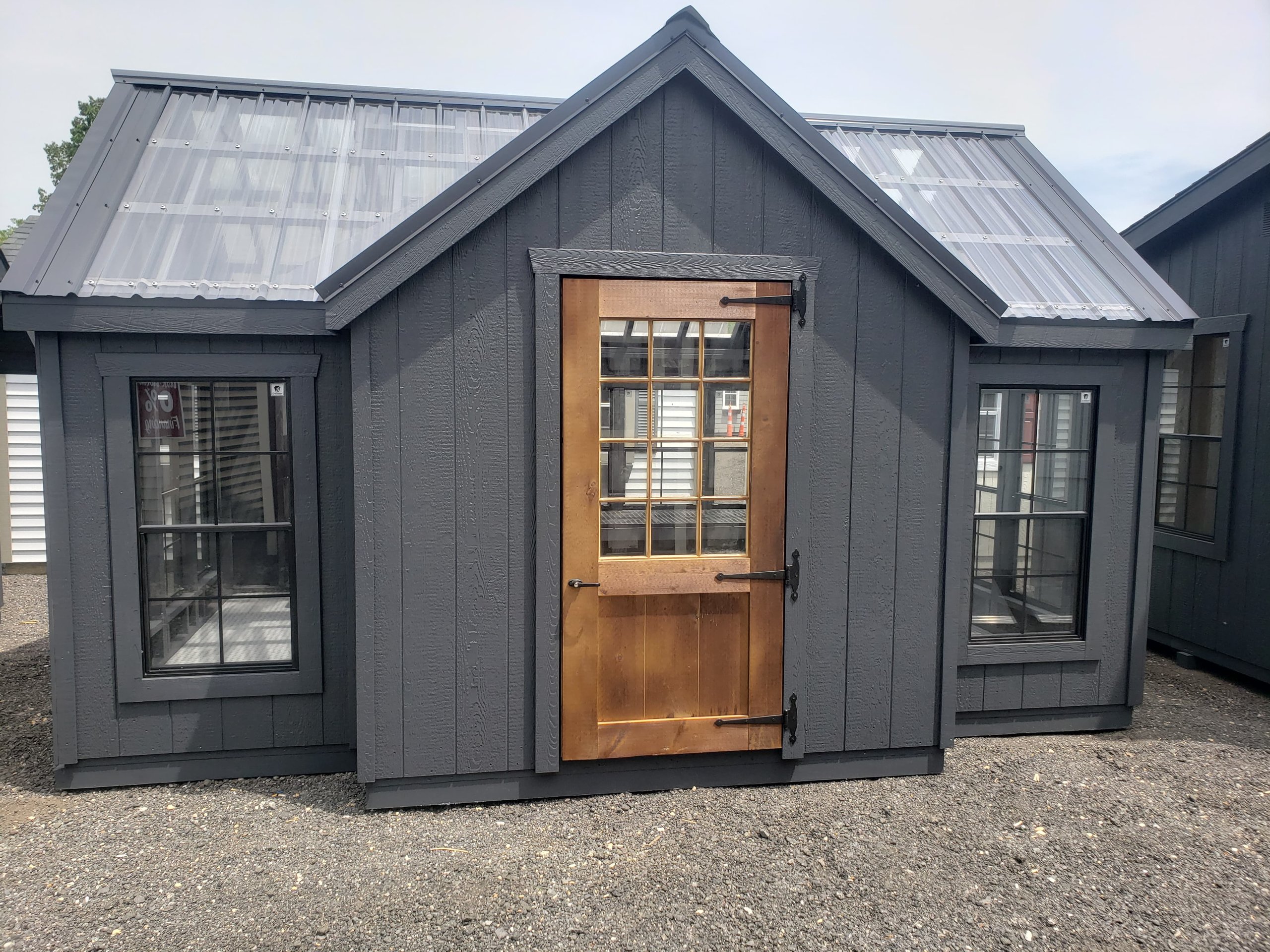 Step into a world of horticultural elegance with our Victorian Greenhouse. Exquisitely crafted by Amish artisans, this 10×16 haven is a testament to both form and function. Its LP Smart Panel siding, painted in the dignified hue of Mopboard, exudes timeless charm, while the Clear Metal Roof not only adds durability but also allows abundant natural light to flood the interior. With 13 windows strategically placed around its walls and a wood sash door welcoming you in, this greenhouse is a sanctuary for your plants to thrive. But it’s not just about its beauty; practicality is at its core. The LP Prostruct Flooring, supported by pressure-treated 2×4 joists, ensures stability and longevity, while included upgrades like the Bumpout Peak Dormer, black windows, and LuxGuard Rubber Floor elevate its functionality and aesthetic appeal. Transform your gardening experience with our Victorian Greenhouse and cultivate a space where beauty and growth intertwine effortlessly.
