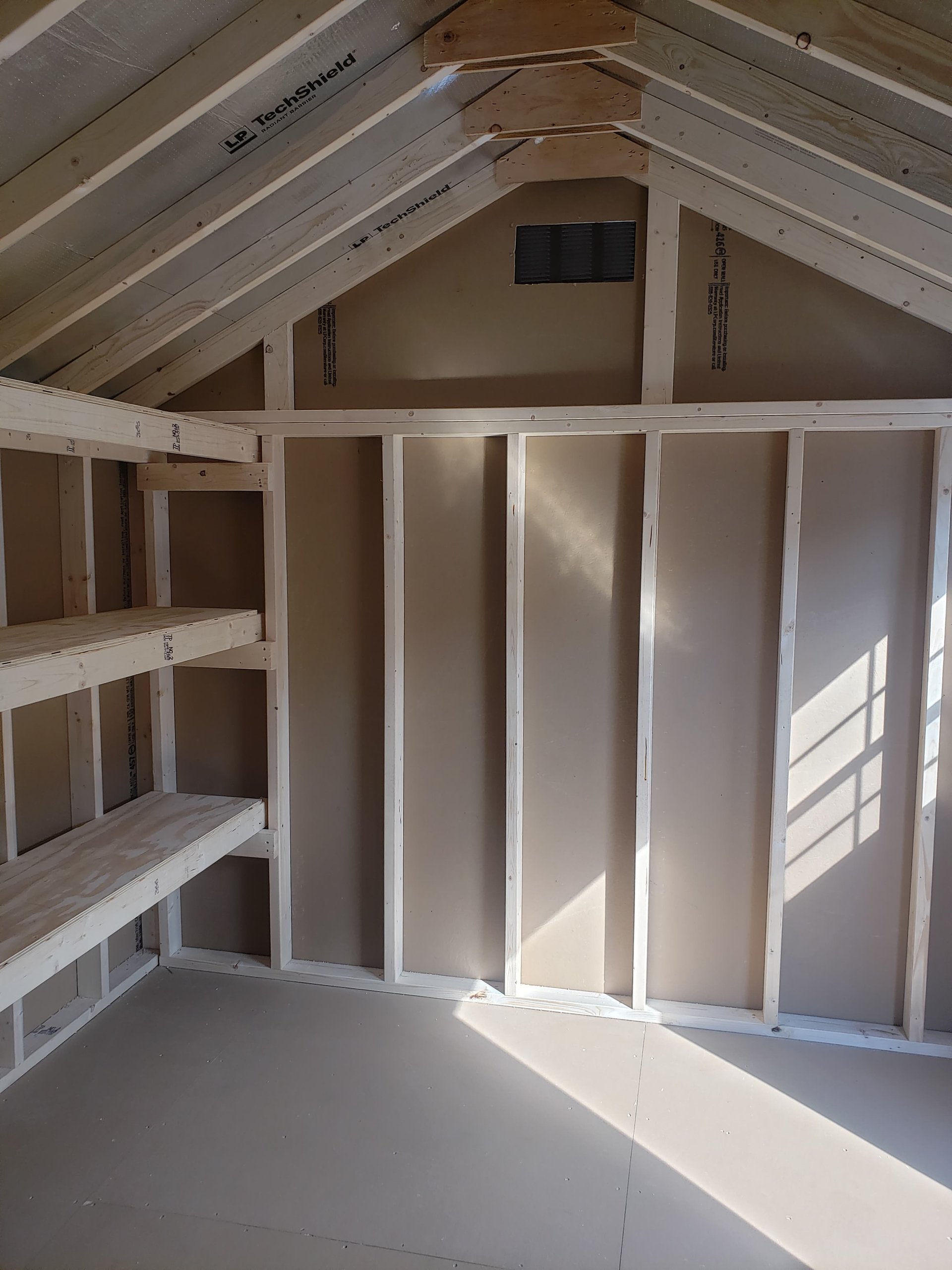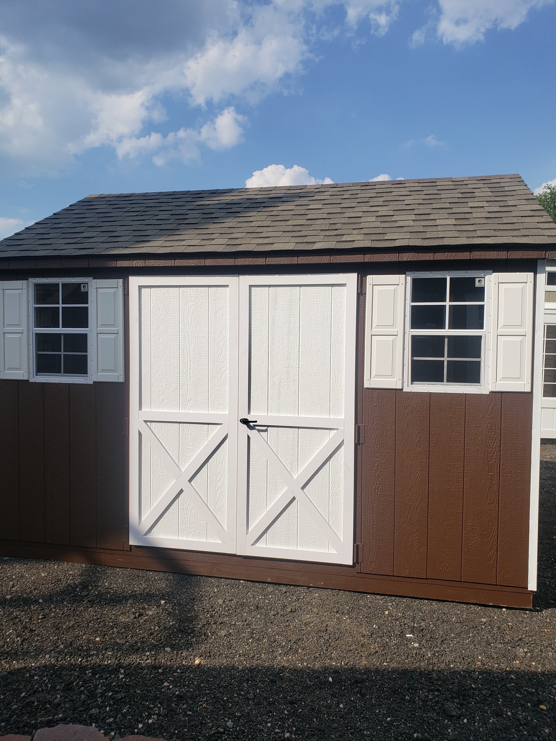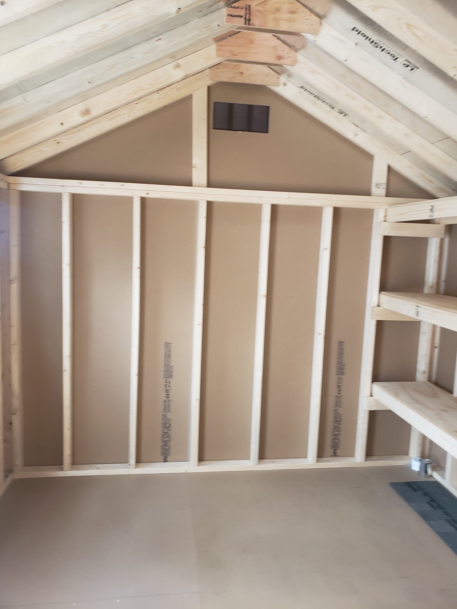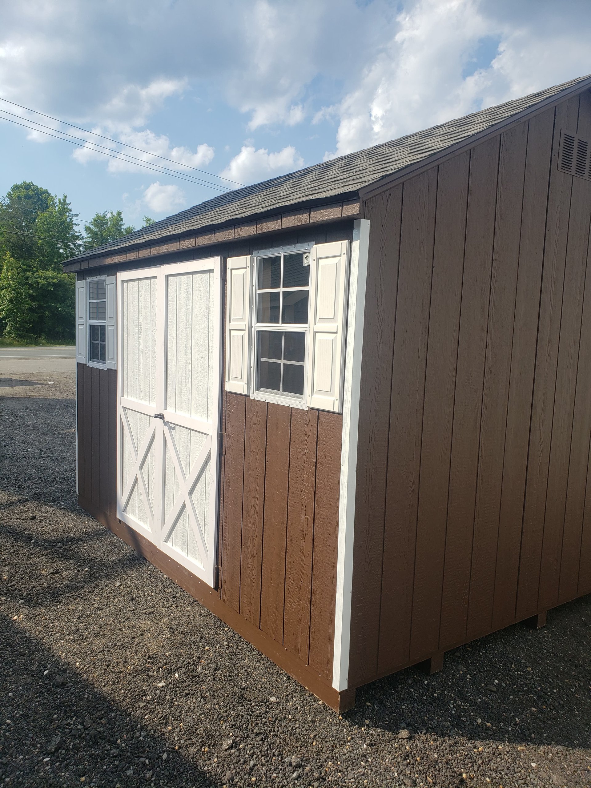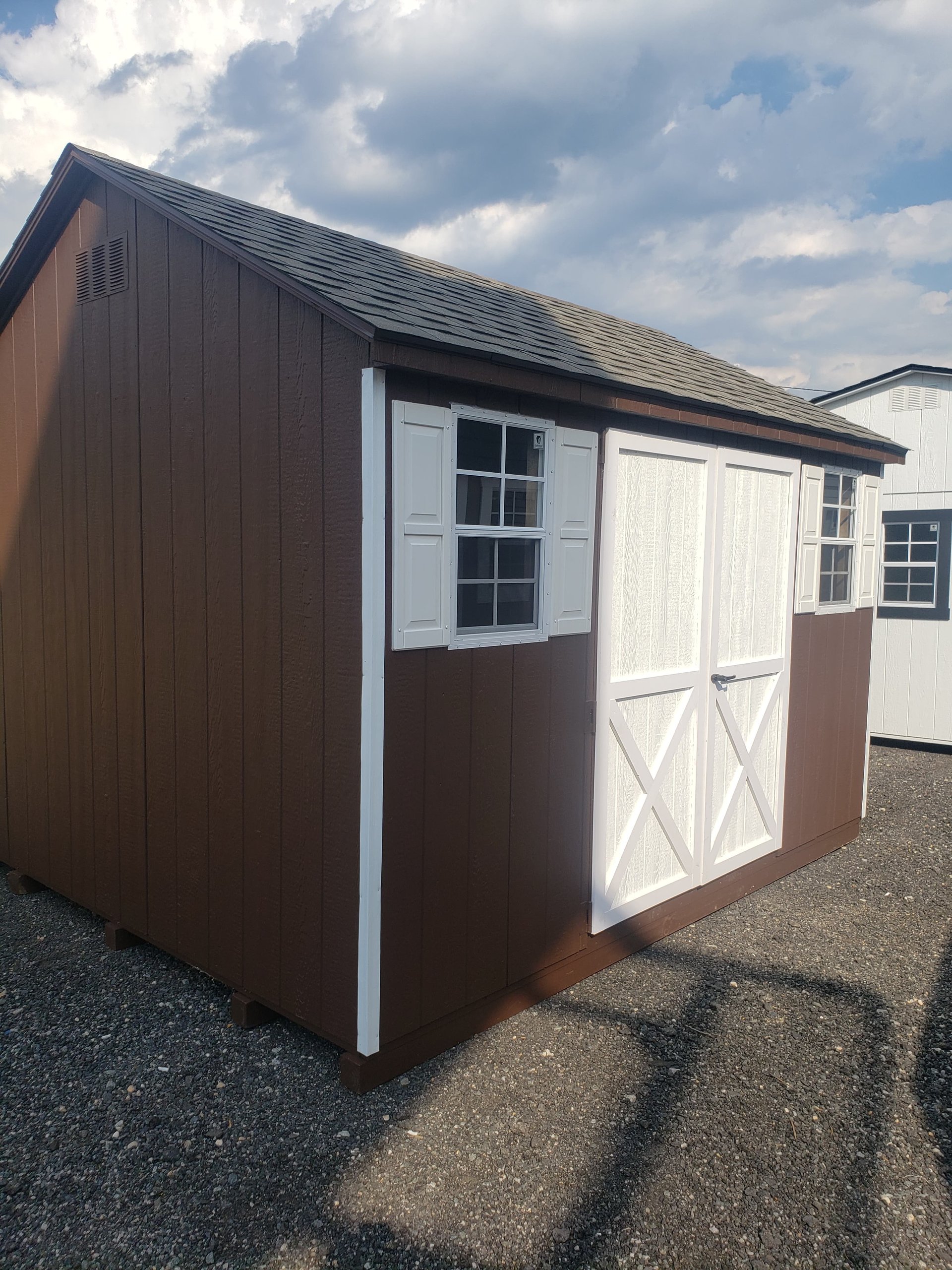 Discover the perfect blend of quality and craftsmanship with our Amish-built A-Frame Storage Shed. Measuring 10×12, this durable shed features Smart Panel siding in a rich brown, accented with white trim, and topped with weathered wood shingles. Inside, you’ll find robust 2×4 wall and roof framing with LP Tech Shield sheeting, ensuring longevity and sturdiness. The shed includes two windows for natural light, a wider door for easy access, and 10-foot shelves for optimal storage. The LP Prostruct flooring and pressure-treated joists guarantee a solid foundation, making this shed a reliable solution for your storage needs.