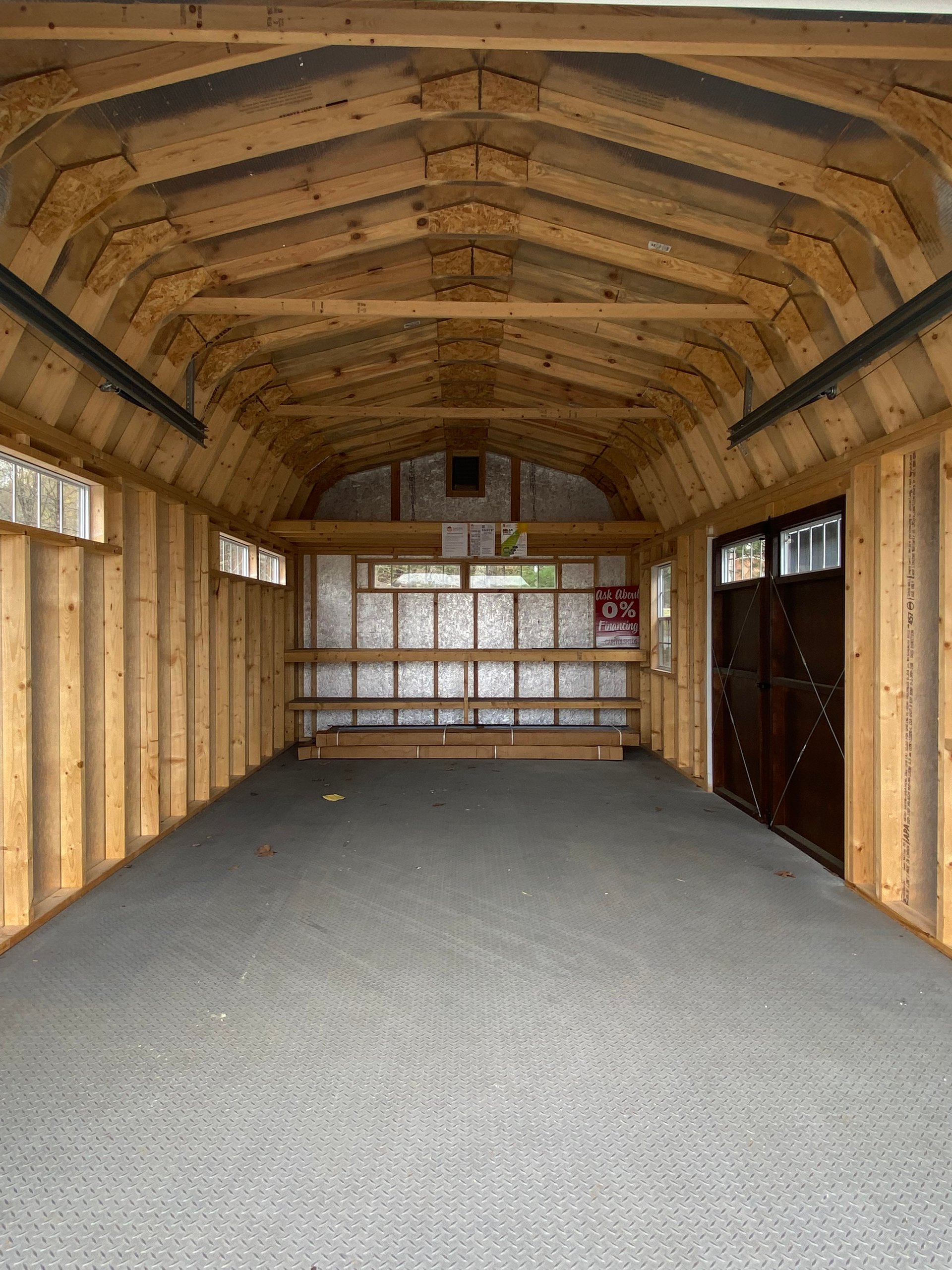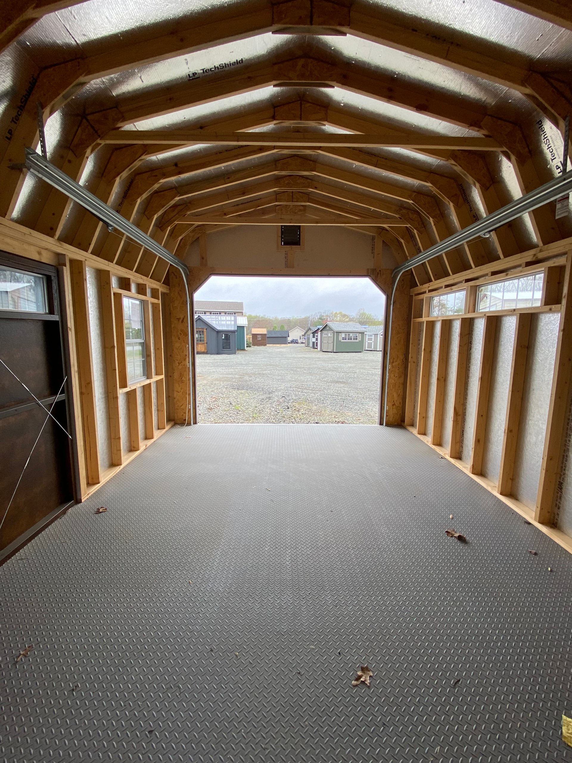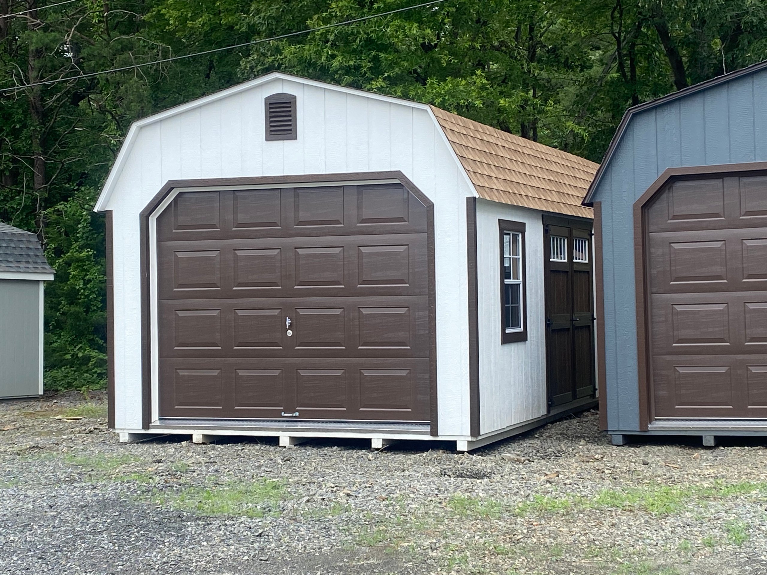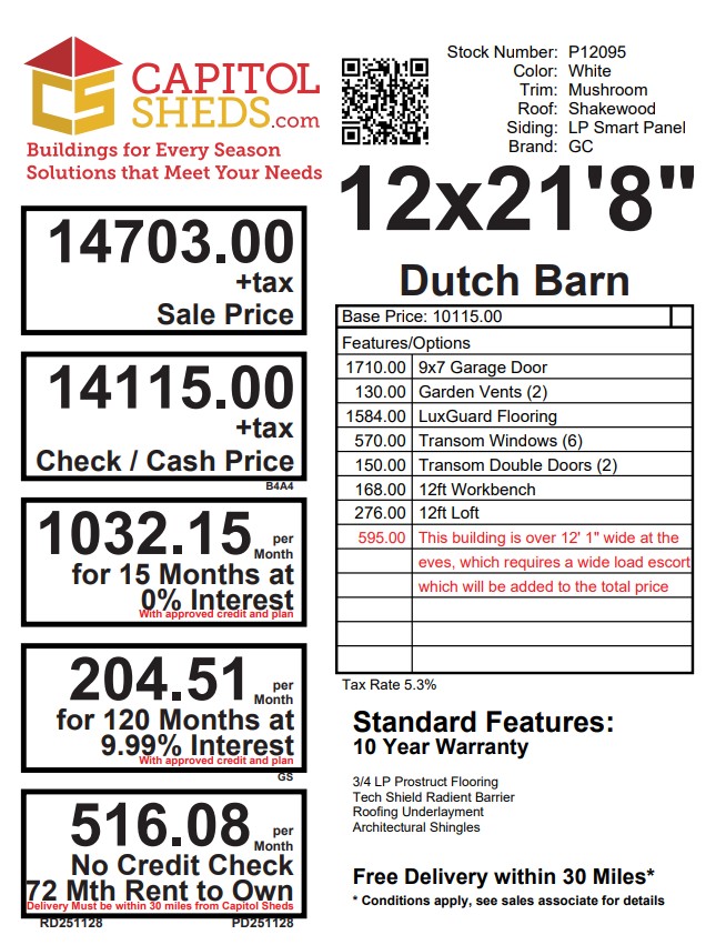 This 12×21’8″ Dutch Barn offers classic barn style with modern durability and smart upgrades. Finished in white LP Smart Panel siding with mushroom trim, it features a Shakewood architectural shingle roof and LP Tech Shield roof sheeting for added protection. Built with 2×4 wall and roof framing on 16-inch centers and heavy-duty pressure-treated floor joists spaced 8 inches on center, it’s designed for strength and longevity. Upgrades include a 9×7 overhead door, transom double doors with transom windows, garden vents, LuxGuard flooring, a 12-foot workbench, and a 12-foot loft—ideal for storage, projects, or equipment.