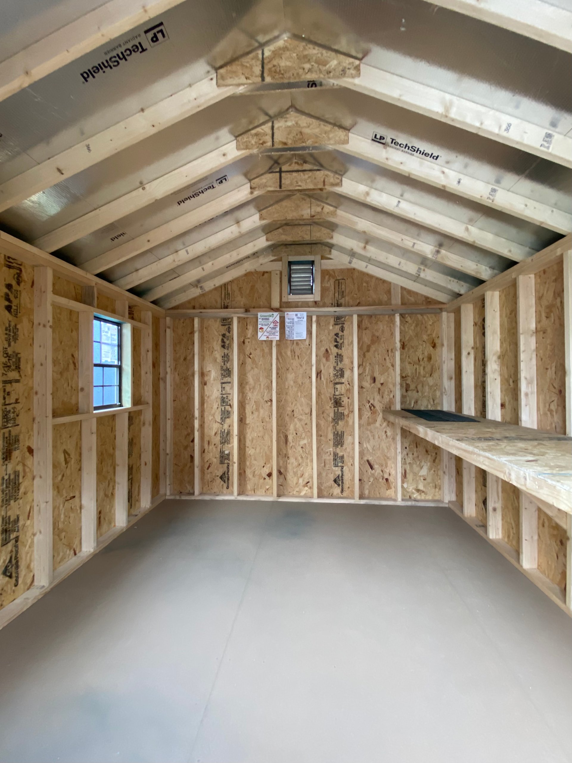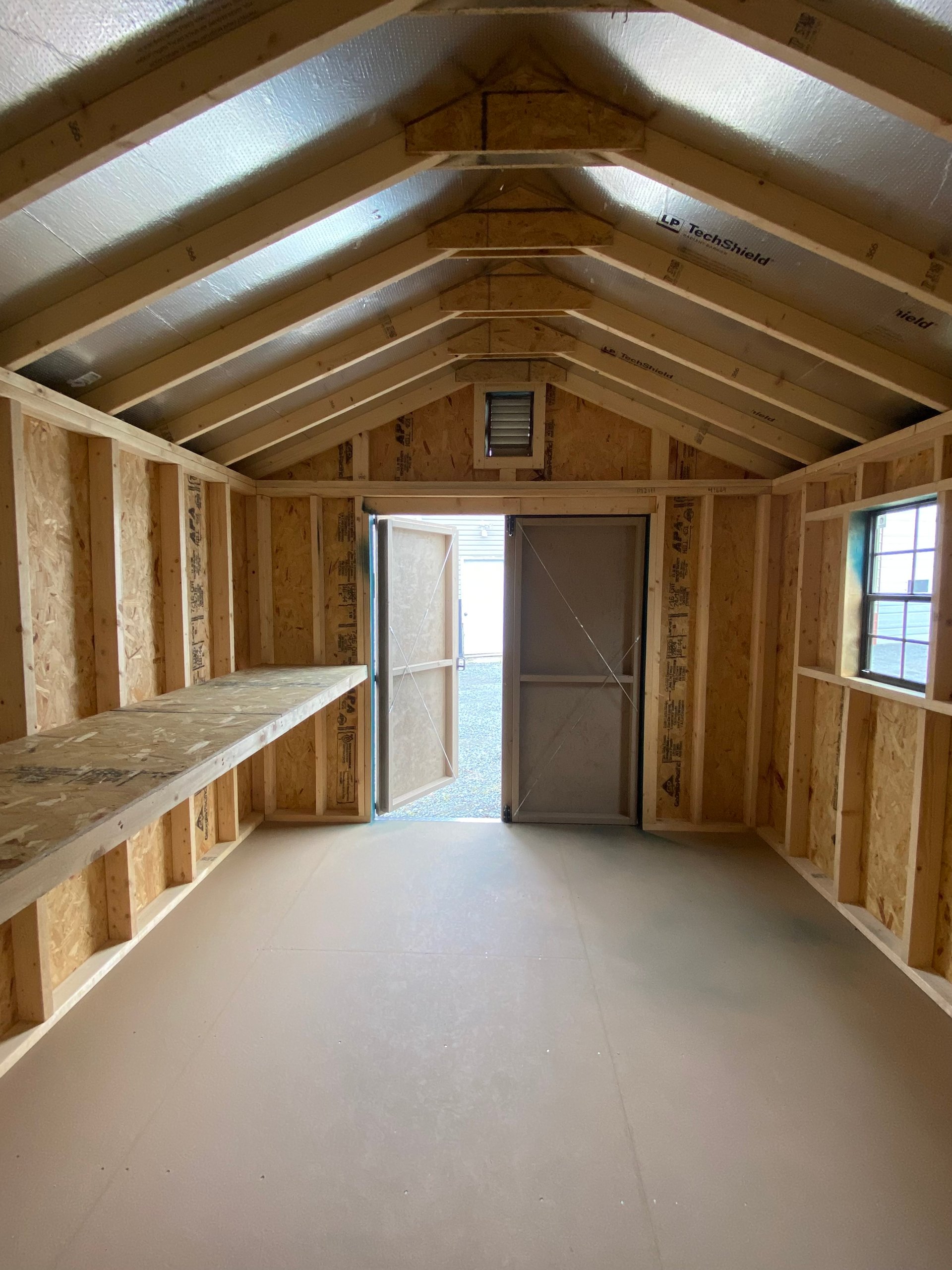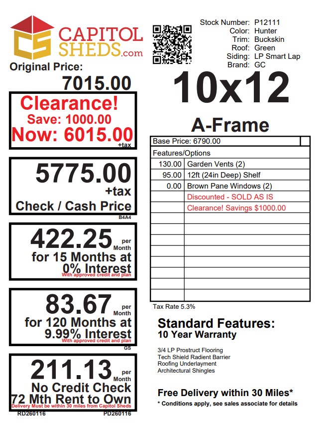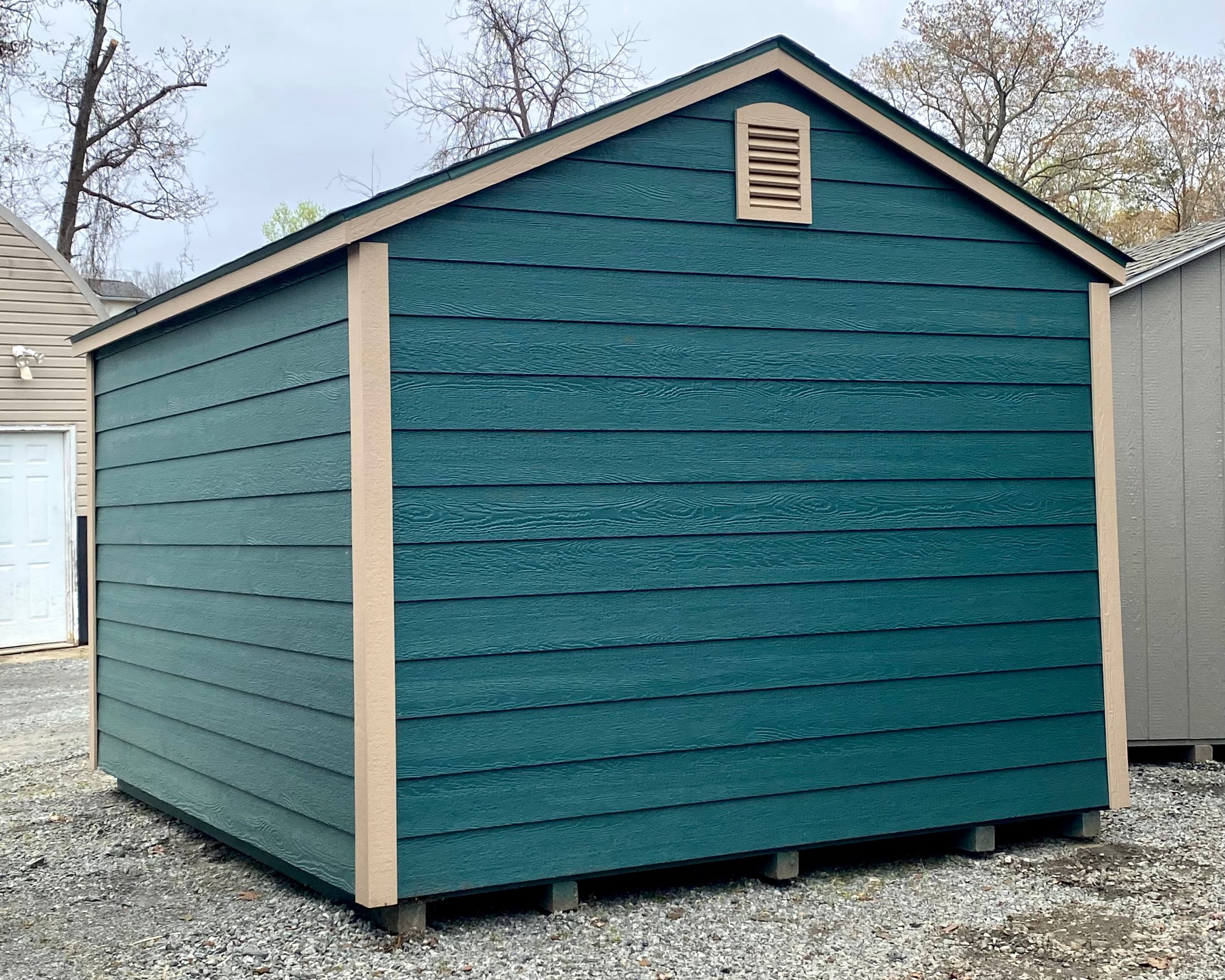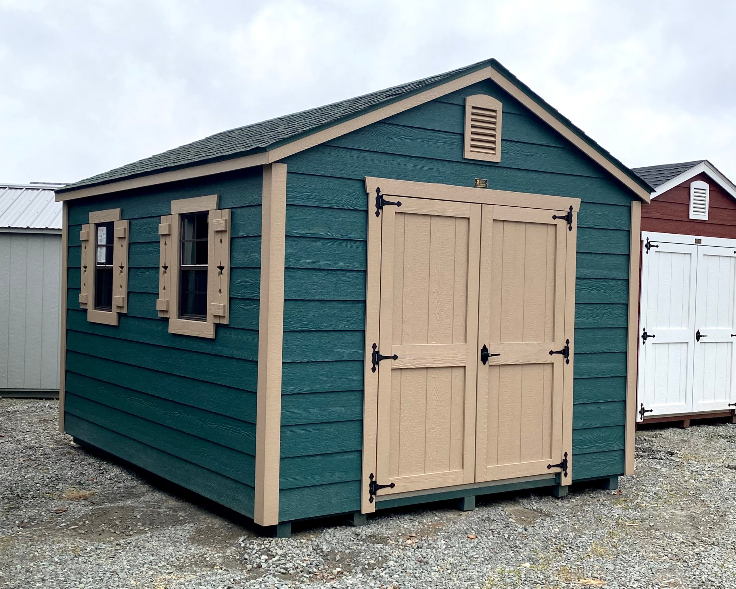 Add rustic elegance to your outdoor space with this 10×12 A-Frame shed, clad in durable LP Smart Lap siding in rich Hunter green, beautifully accented by Buckskin trim. A matching green shingle roof ties the look together while protecting against the elements. Inside, enjoy a sturdy structure framed with 2×4 studs and rafters, LP Tech Shield roof sheeting, and LP Prostruct flooring supported by pressure-treated 2×4 joists. Thoughtful upgrades include charming brown window panes, dual garden vents for airflow, and built-in shelves for organized storage. Amish craftsmanship ensures quality and longevity—perfect for both functionality and style in your backyard.