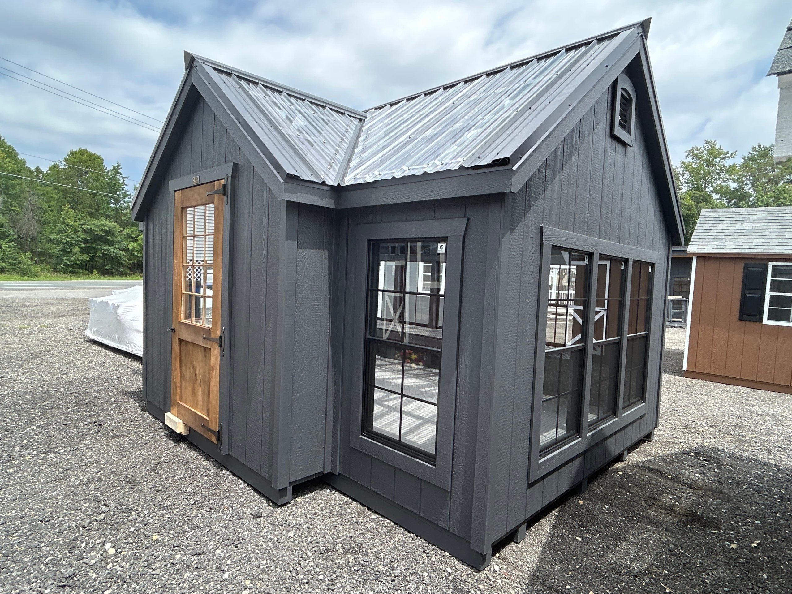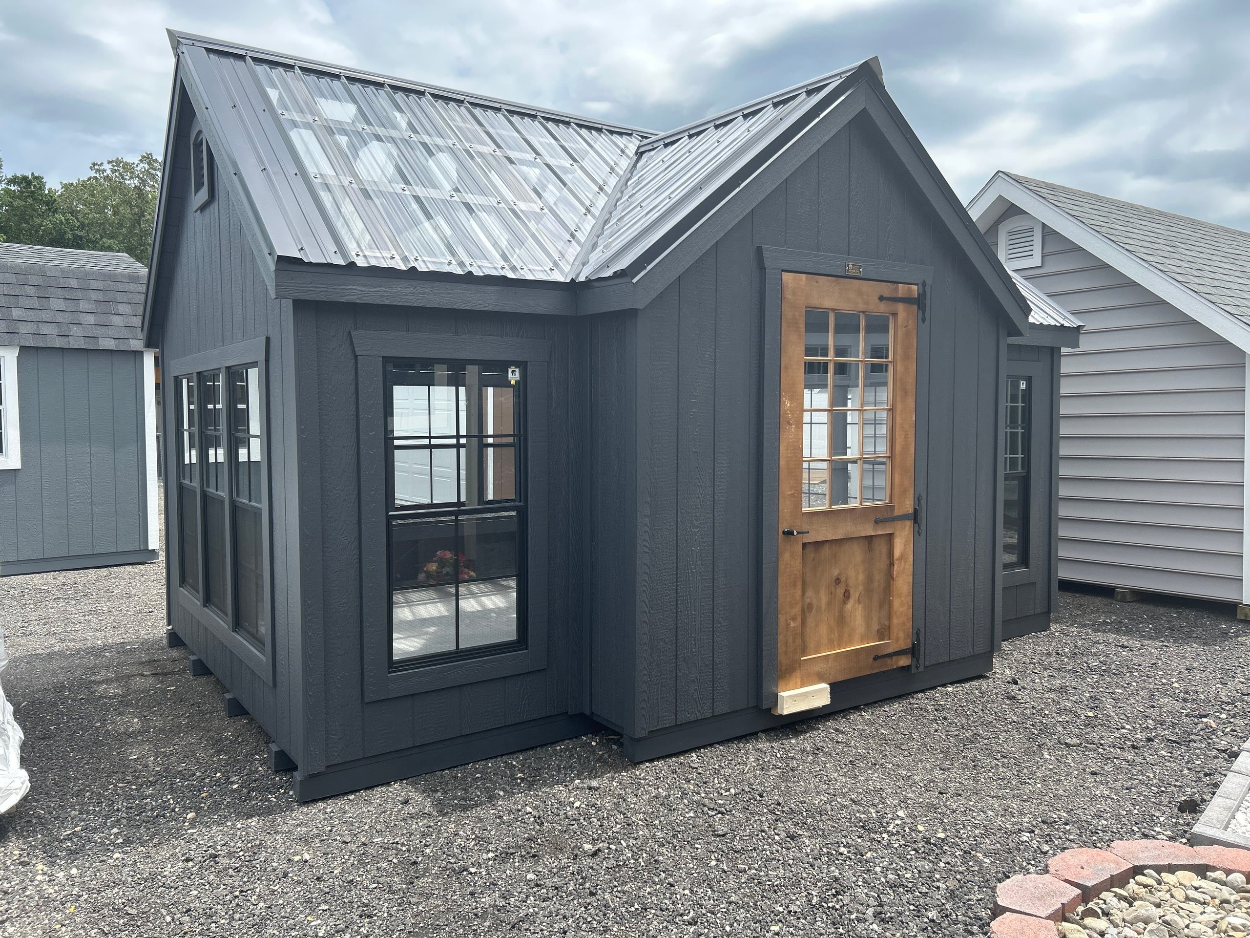 Step into a world of horticultural elegance with our Victorian Greenhouse. Exquisitely crafted by Amish artisans, this 10×16 haven is a testament to both form and function. Its LP Smart Panel siding, painted in the dignified hue of Mopboard, exudes timeless charm, while the Clear Metal Roof not only adds durability but also allows abundant natural light to flood the interior. With 13 windows strategically placed around its walls and a wood sash door welcoming you in, this greenhouse is a sanctuary for your plants to thrive. But it’s not just about its beauty; practicality is at its core. The LP Prostruct Flooring, supported by pressure-treated 2×4 joists, ensures stability and longevity, while included upgrades like the Bumpout Peak Dormer, black windows, and LuxGuard Rubber Floor elevate its functionality and aesthetic appeal. Transform your gardening experience with our Victorian Greenhouse and cultivate a space where beauty and growth intertwine effortlessly.